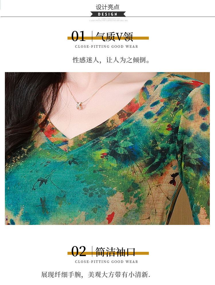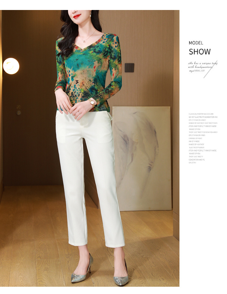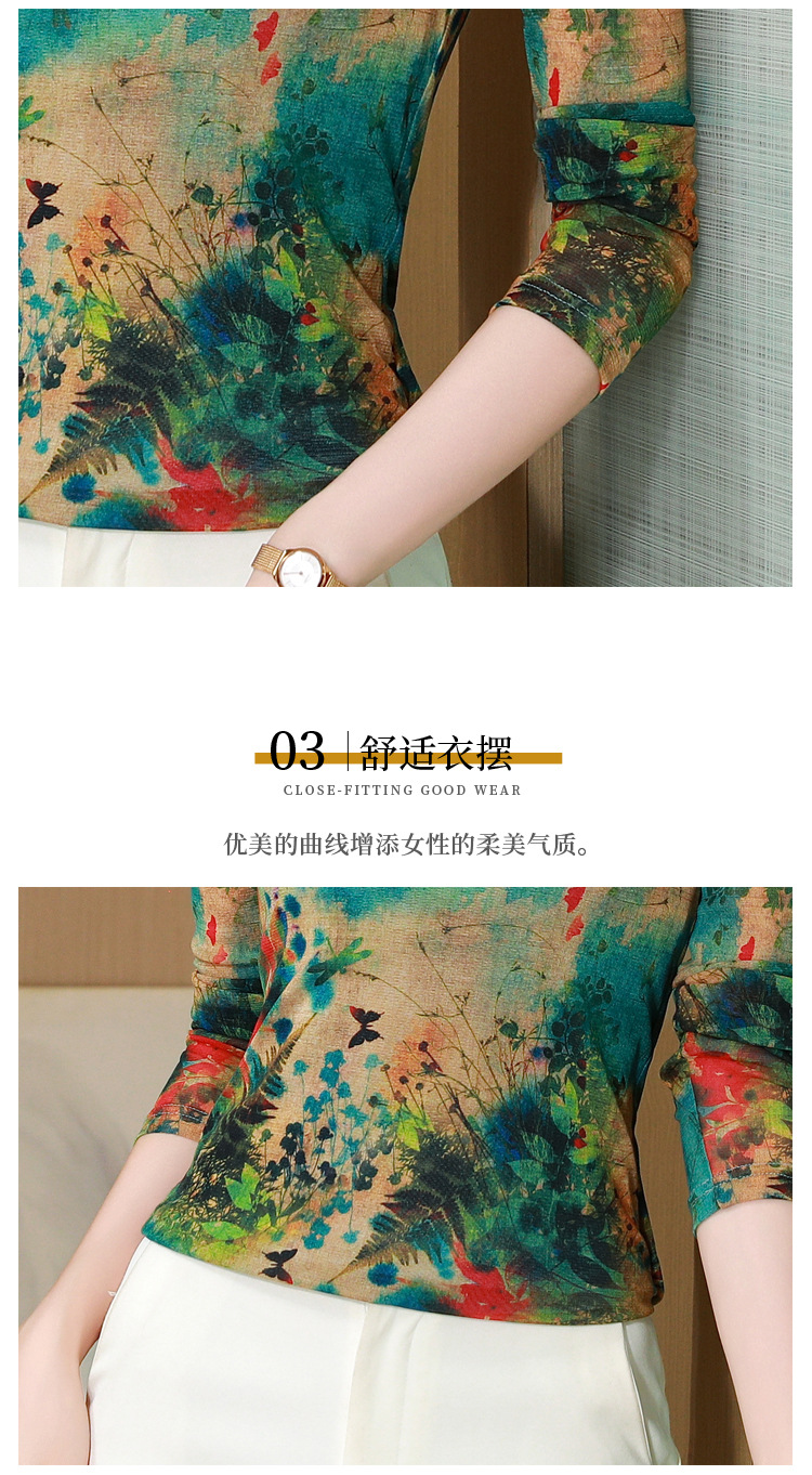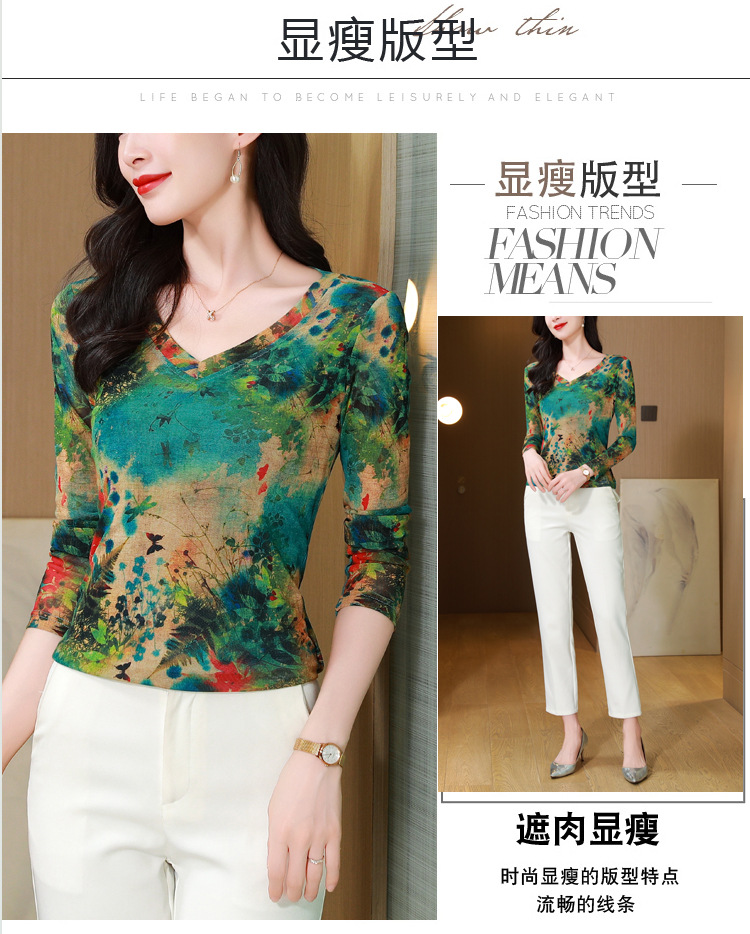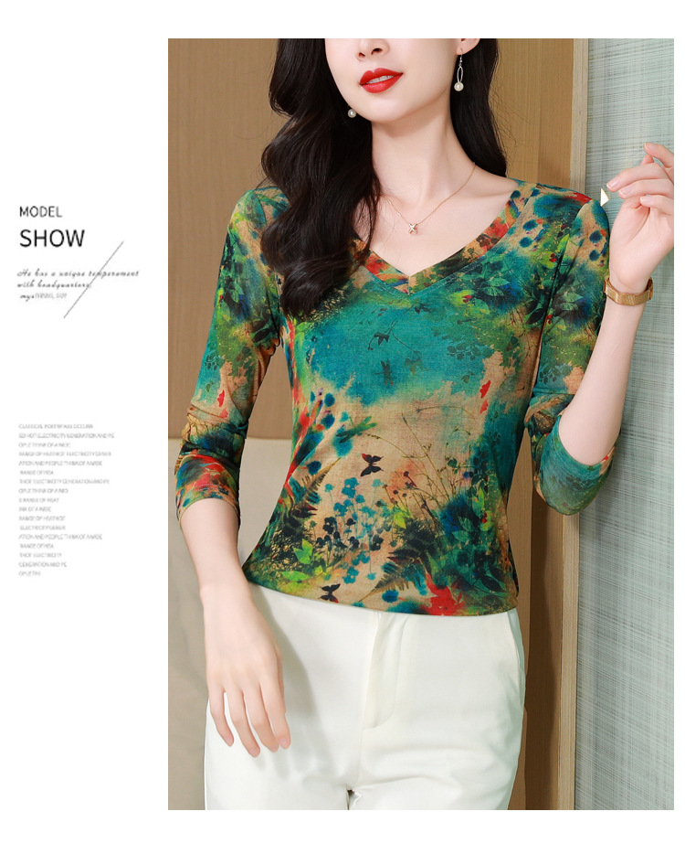 KQL 520N89331时尚纱网印花长袖V领修身显瘦洋气打底衫T恤上衣