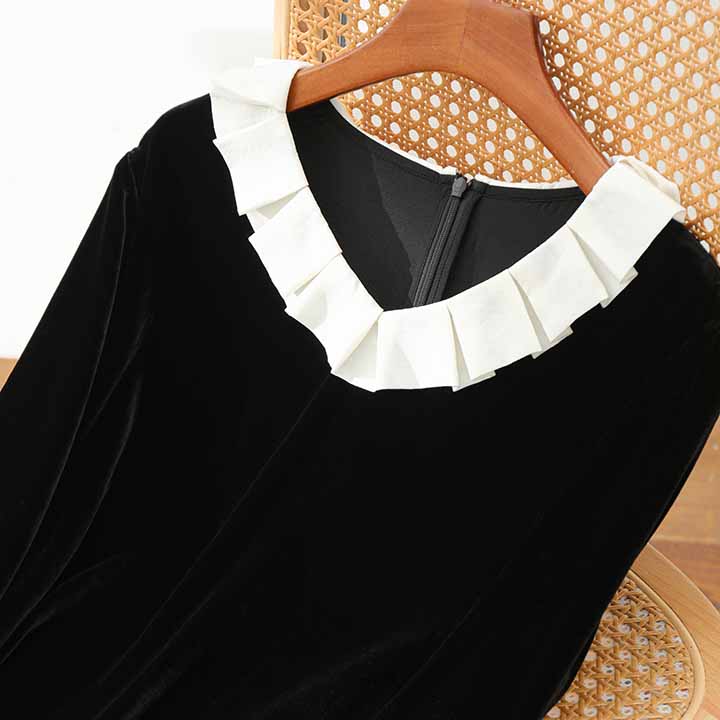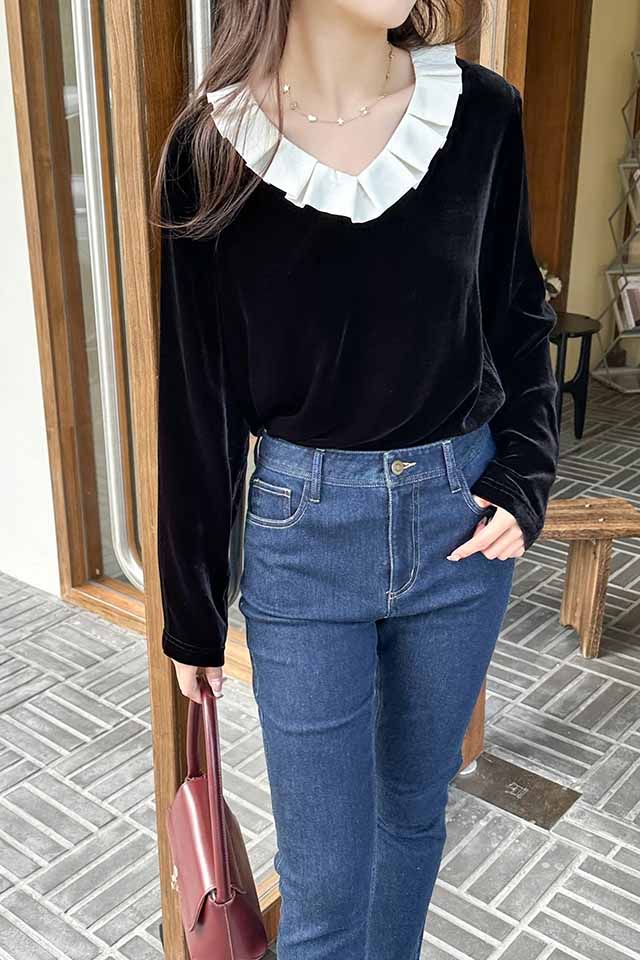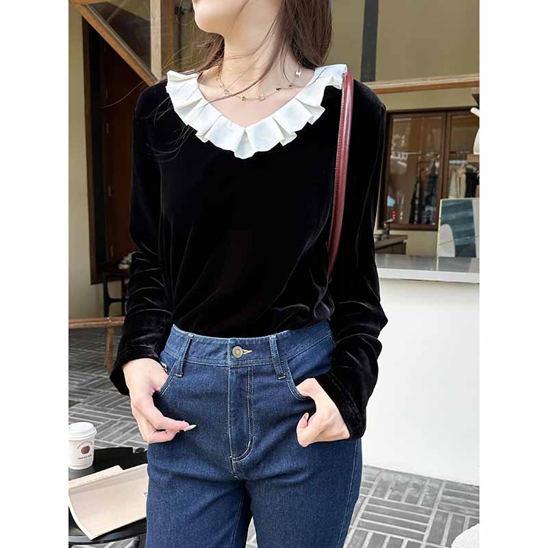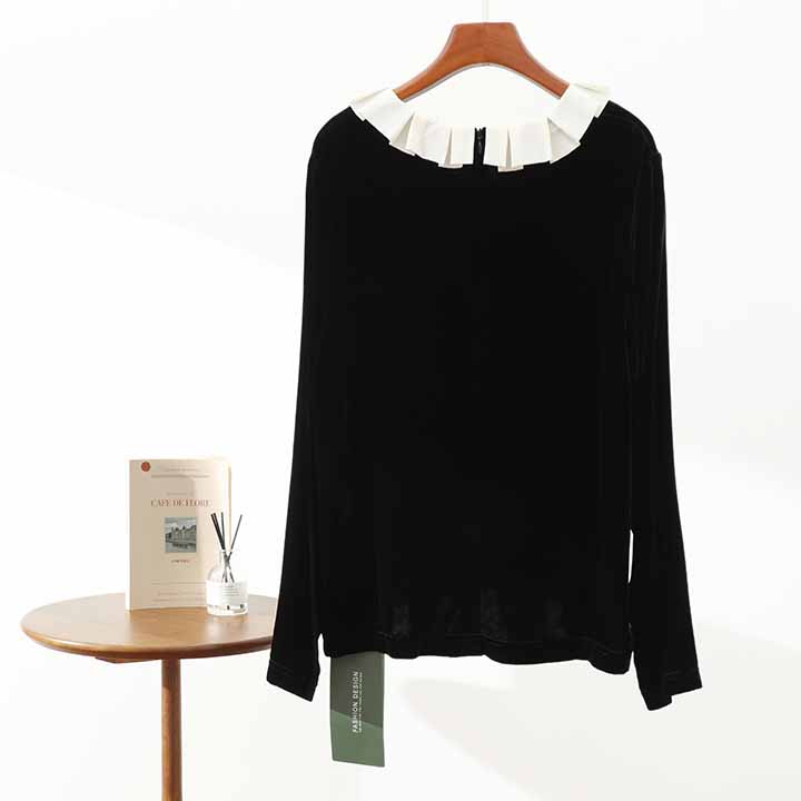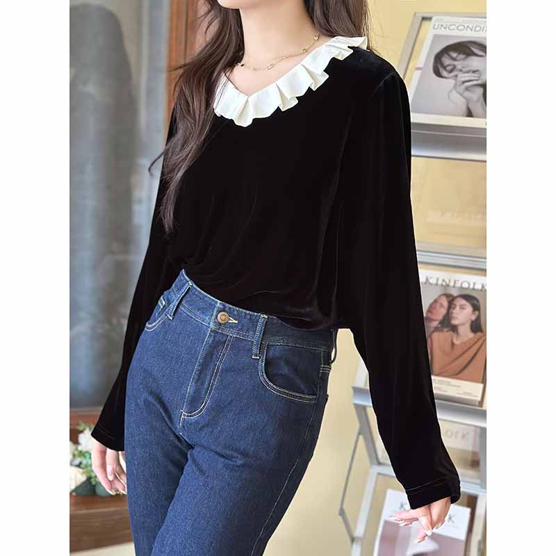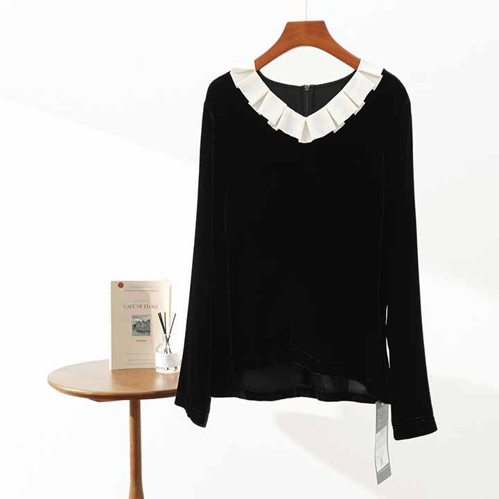 顺丰包邮洛诗琳45020法式甜美风真丝丝绒压褶荷叶领长袖上衣2015B