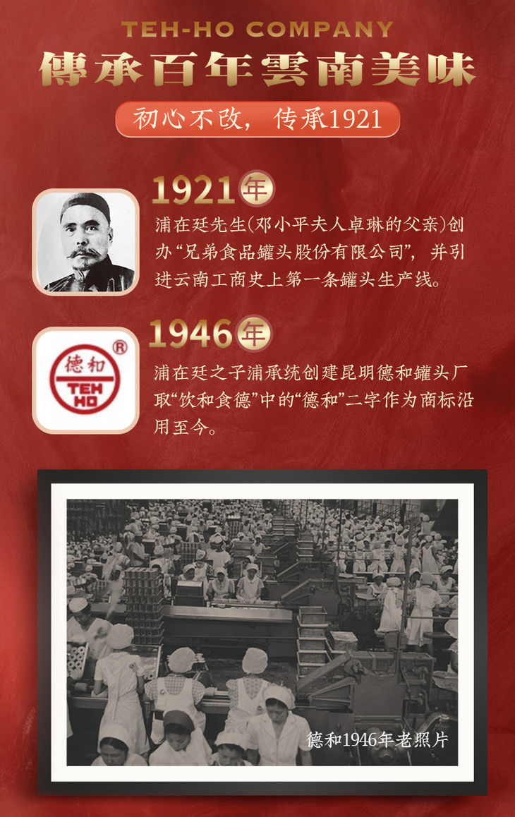 - 昆明德和罐头厂是中国最早开始生产制造罐头的企业之一,至今已有九十八年的悠久历史,现已形成以罐头食品为主,腌腊制品、糕点月饼等为辅的云南省规模最大和最具影响力综合食品制造企业,奠定了云南罐头行业的基石。