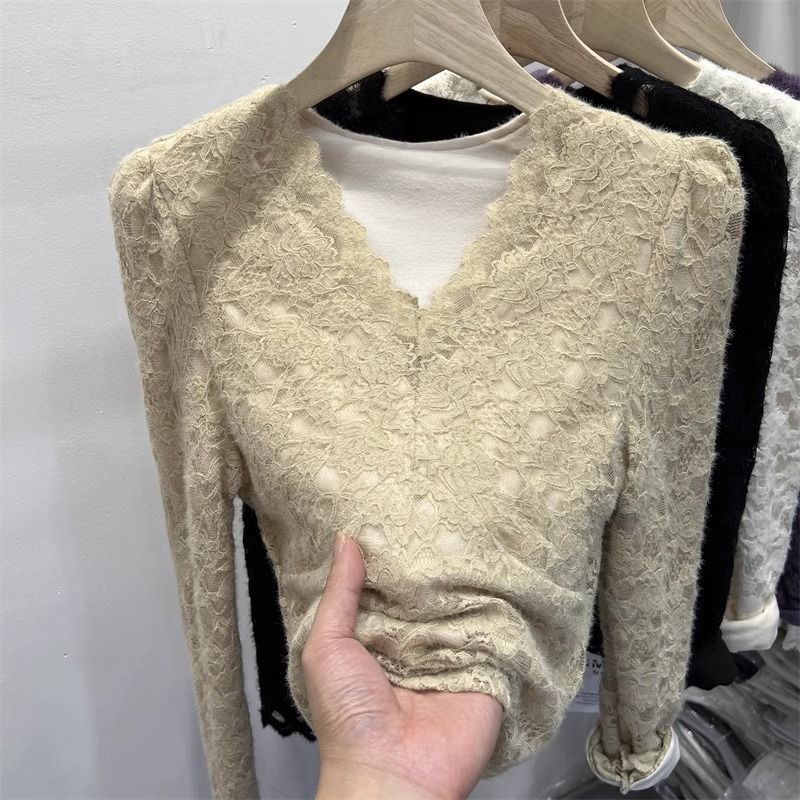 丁摩 磨毛蕾丝性感修身加绒加厚打底衫 商品图1