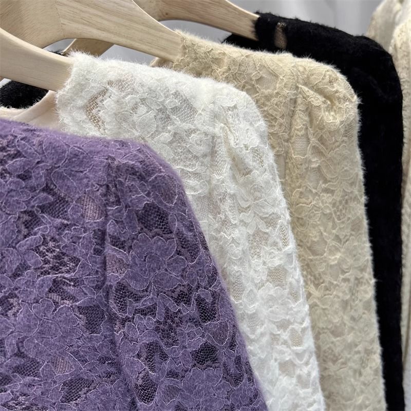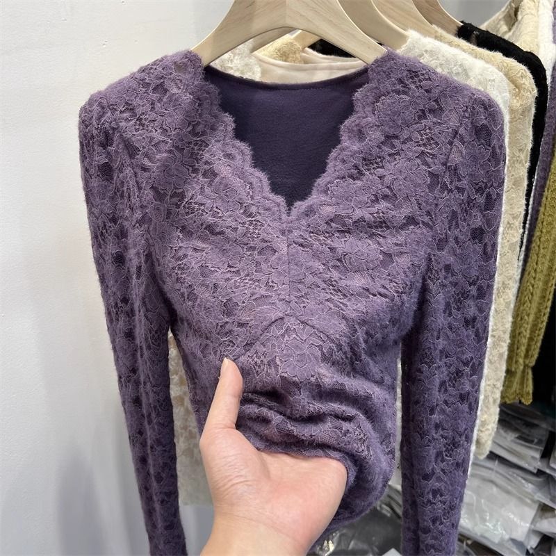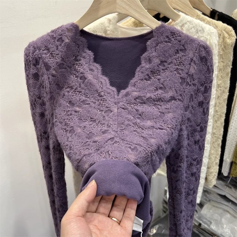 丁摩 磨毛蕾丝性感修身加绒加厚打底衫 商品图0