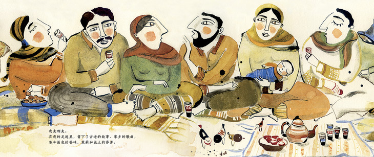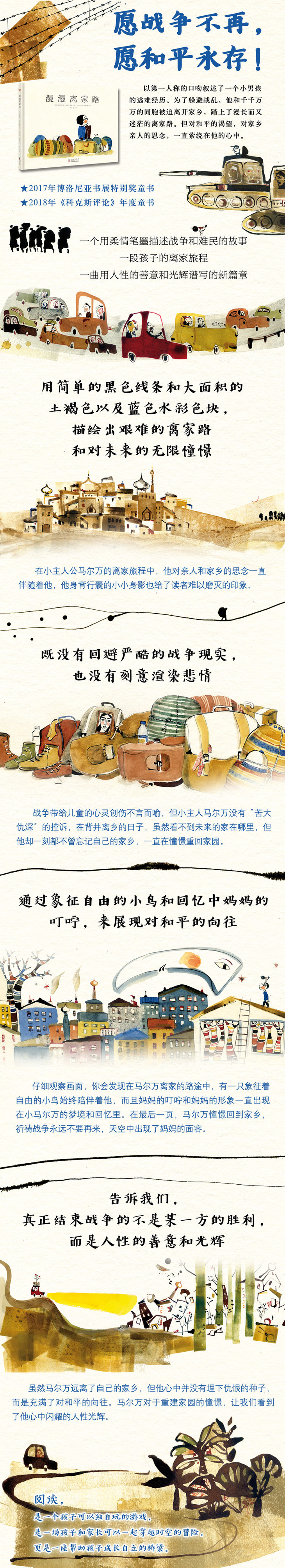 和艾兰一样,这本书里的主角马尔万也是战争的受害者,全书以第一人称叙述了这个小男孩的逃难经历。为了躲避战乱,他和千千万万的同胞被迫离开家乡,踏上了漫长而又迷茫的逃亡之路,“不知道要去哪儿,也不知道什么时候能到”。画家用看似简单的黑色线条和大面积的土褐色水彩色块勾勒出了马尔万离家的路,和他身背行囊的小小身影形成了巨大的反差。在逃难的路上,他想起妈妈让他“继续走,一直走”的叮咛;想起一家三口在自家房子里的幸福生活;想起那个黑暗的夜晚,一辆辆黑压压的坦克碾压过他们的家园,也碾碎了他们平静的生活……战争带给儿童的心灵创伤不言而喻,作者既没有回避严酷的现实,也没有刻意渲染悲情。马尔万没有“苦大仇深”的控诉,在背井离乡的日子,虽然看不到未来的家在哪里,是什么样子,不过,他却一刻都不曾忘记自己的家乡。他的名字、伊斯兰风格的房子、古老的阿拉伯故事和歌曲,甚至还有故乡芬芳的泥土……这些都是他脑海里永不磨灭的烙印。经过不知道多少个日日夜夜的跋山涉水,逃难的人群终于来到了边境。在铁丝网的那边,生活安定,车水马龙,人们说着另一种语言,属