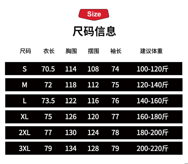 【尺码】S(100-120斤)、M(120-140斤)、L(140-160斤)、XL(160-180斤)、2XL(180-200斤)、3XL(200-220斤)