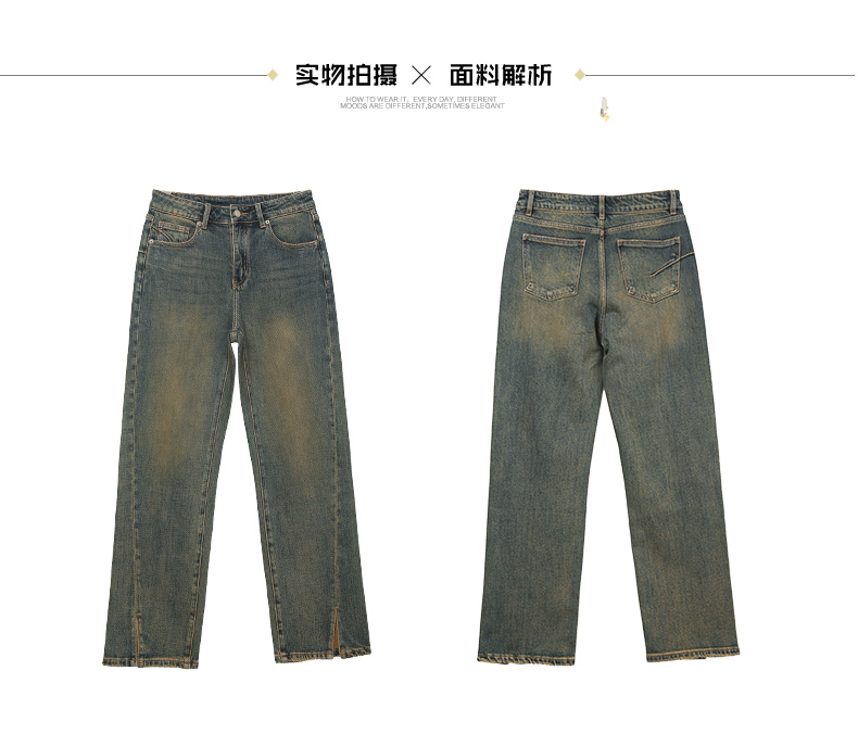 韩系高腰直筒开叉牛仔裤女 复古做旧宽松显瘦拖地阔腿长裤
