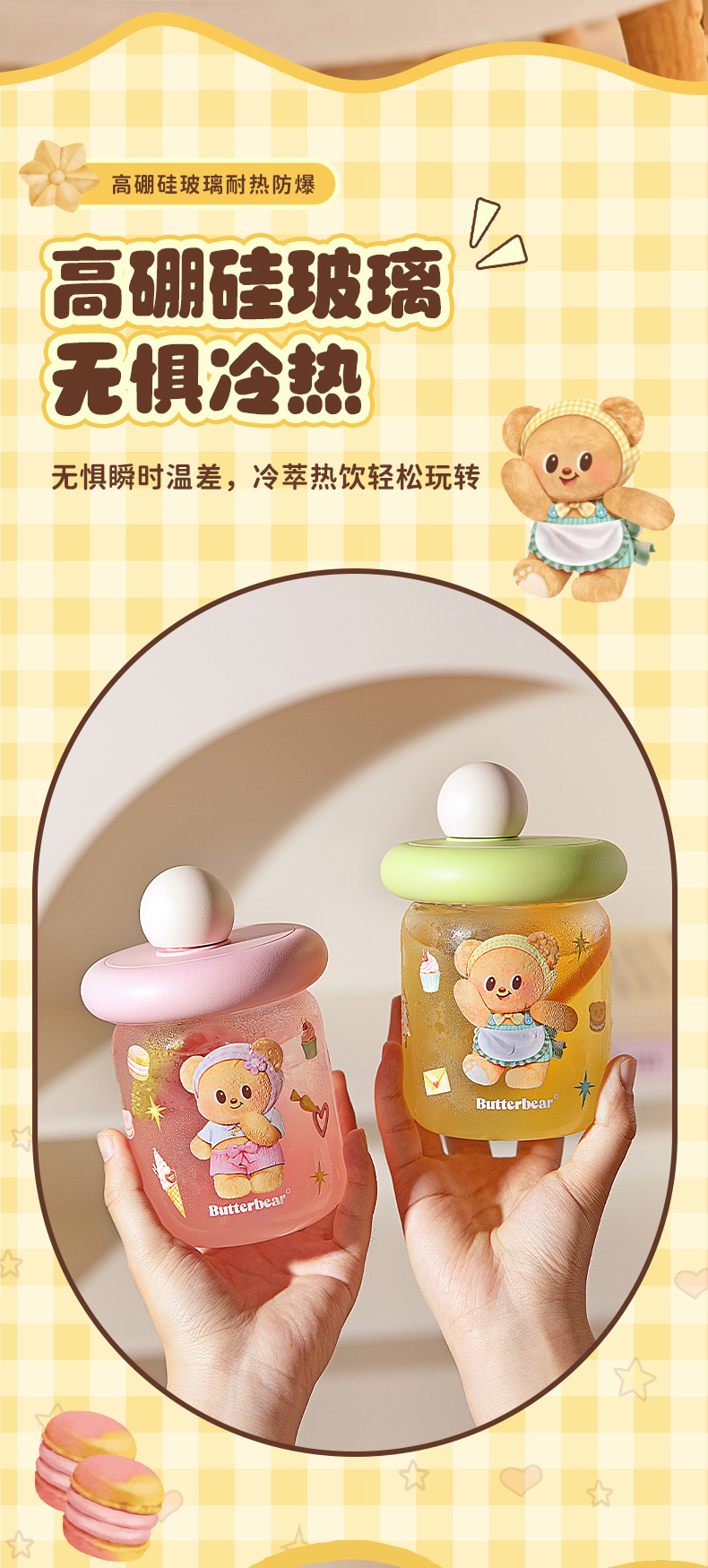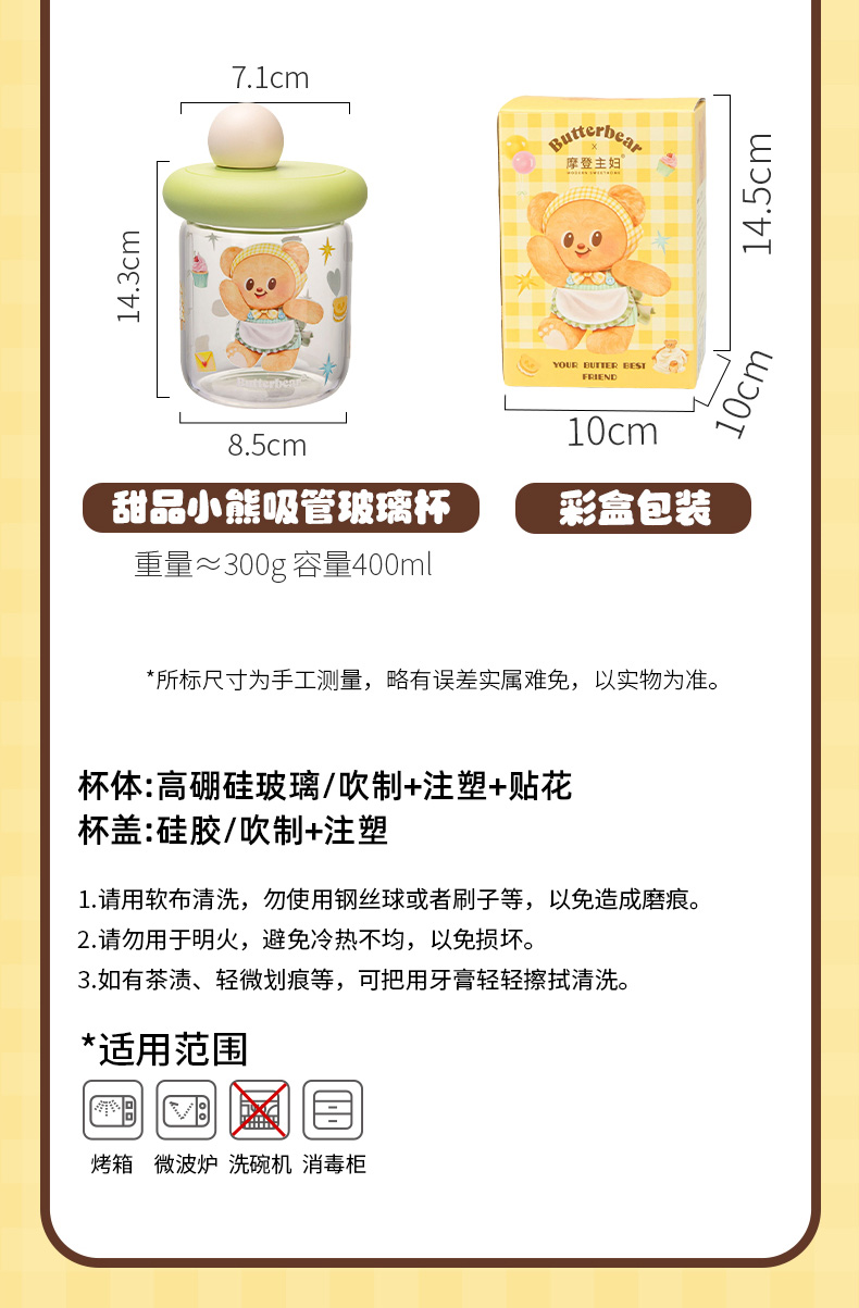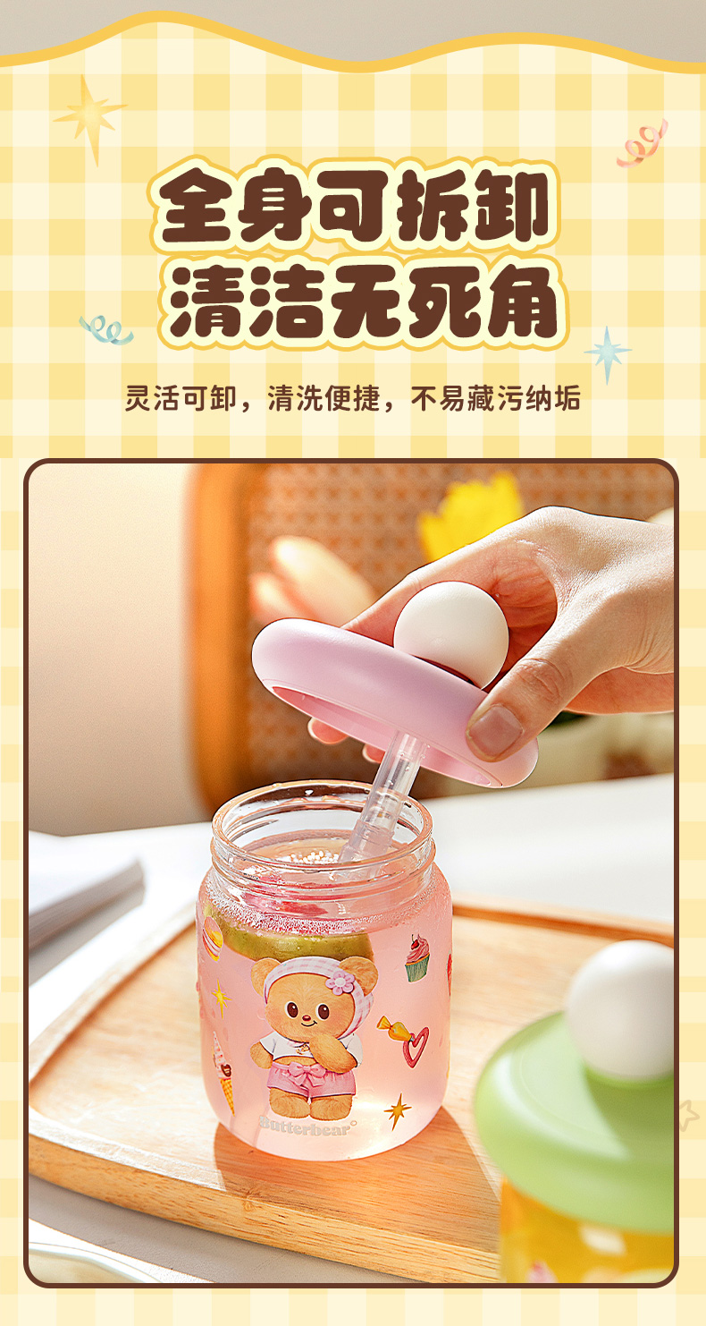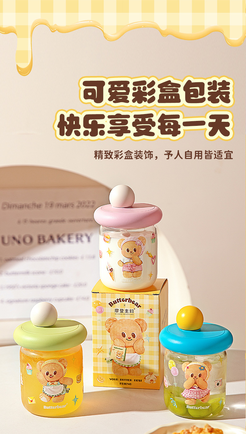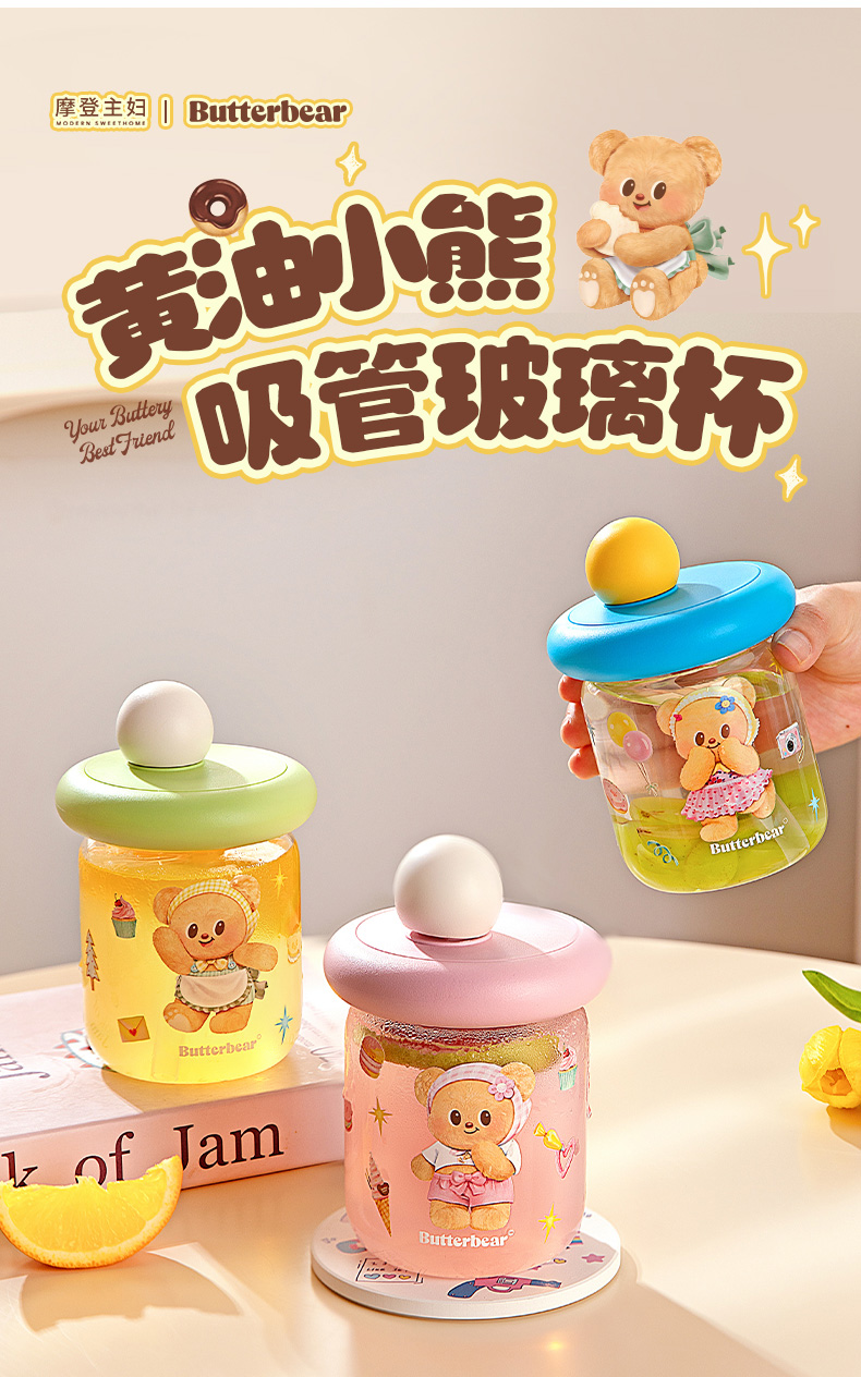摩登主妇黄油小熊玻璃水杯带盖吸管杯家用杯子果汁杯咖啡杯