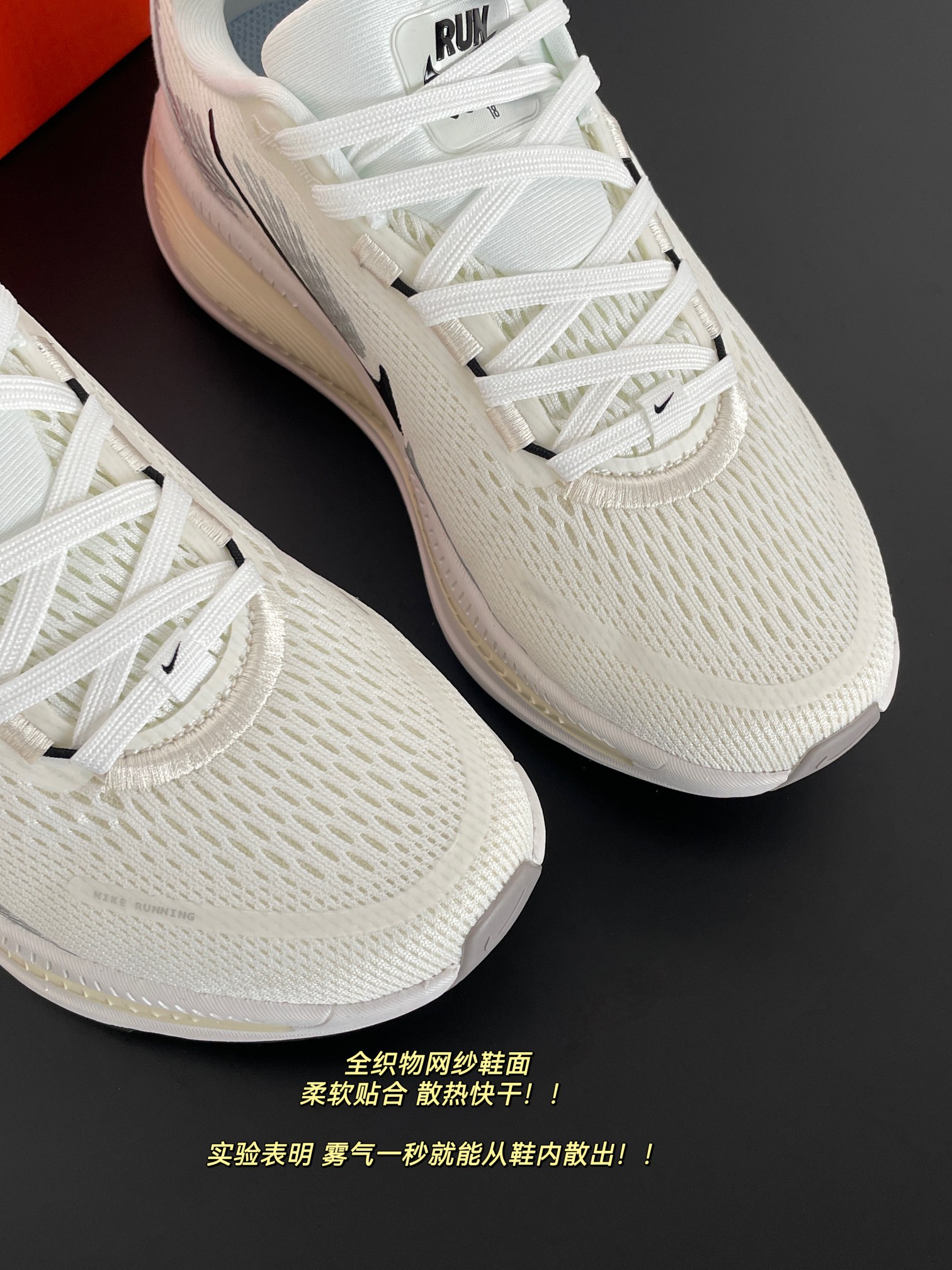 全织物网纱鞋面 柔软贴合 透气性超级好 散热快干!!实验表明,雾气一秒就能从鞋内散出!!