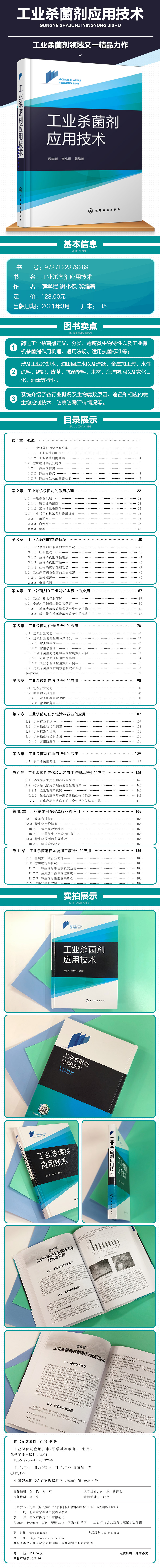 由涉及工业冷却水、油田回注水、造纸、金属加工液、涂料、纺织、皮革、塑料、木材、海洋防污以及家化日化、消毒等十几个行业的专家精心编著,化学工业出版社出版的《工业杀菌剂应用技术》一书的问世,正是顺应了这种需要。该书内容丰富、资料全面,有相当的实用参考价值。为此向大家推荐。