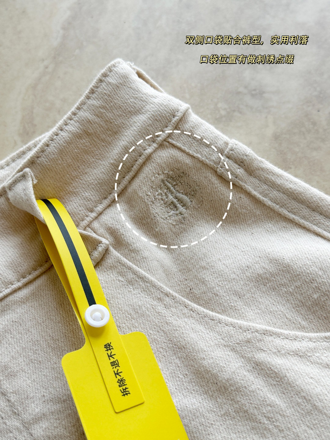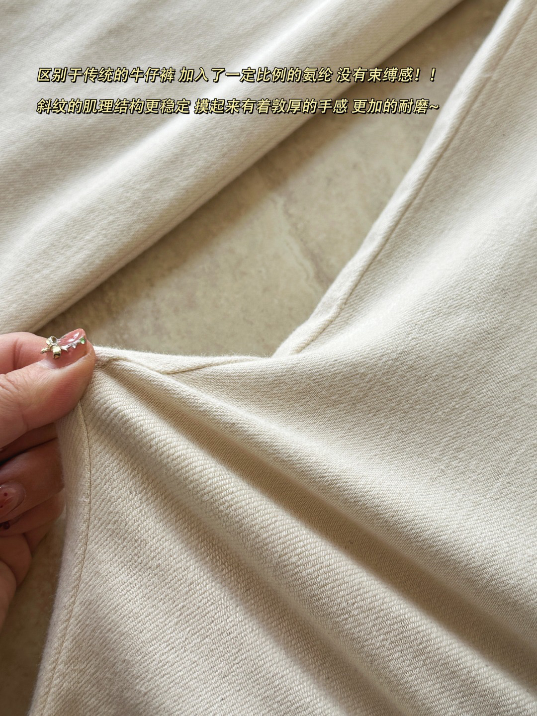 区别于传统的牛仔裤 加入了一定比例的氨纶 没有束缚感!!斜纹的肌理结构更稳定 摸起来有着敦厚的手感 更加的耐磨~