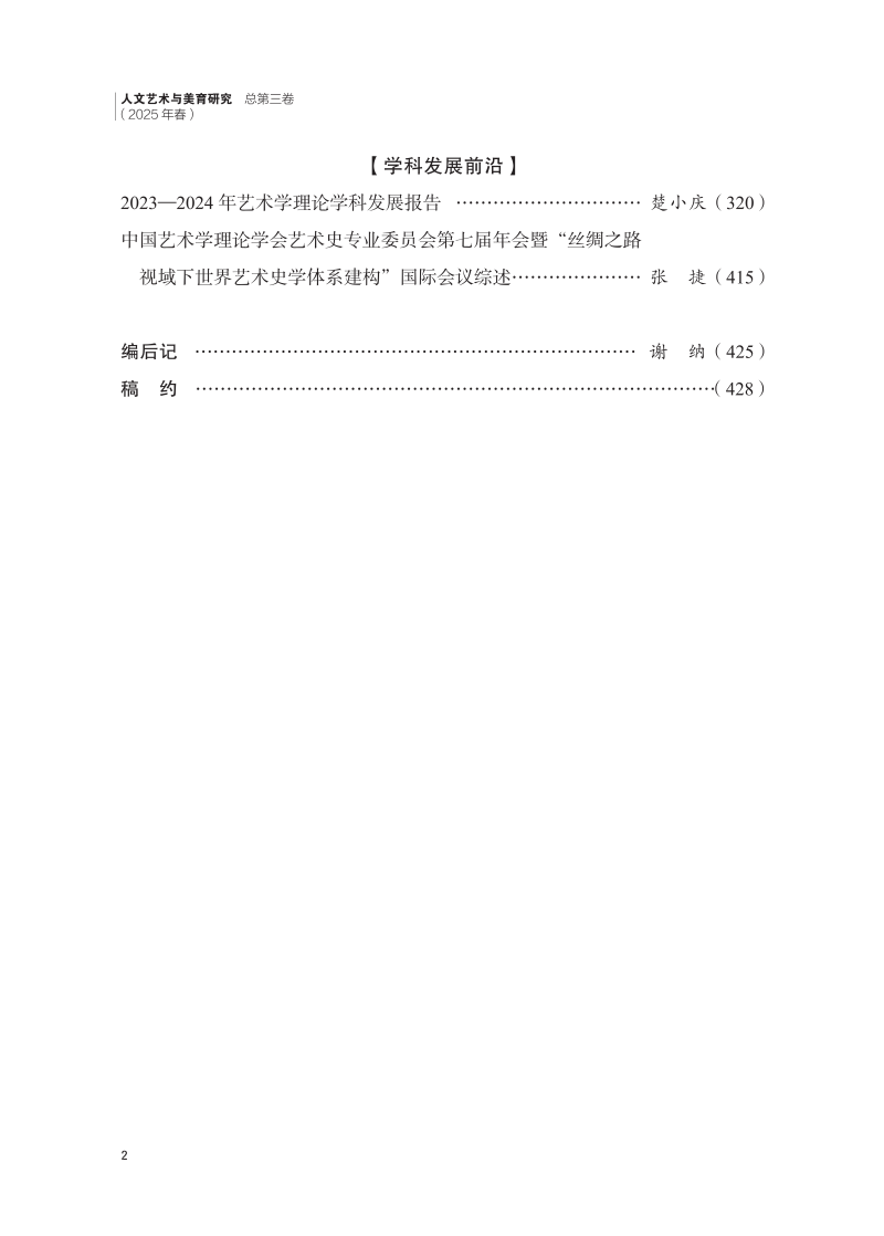 《人文艺术与美育研究》是上海交通大学人文学院、人文艺术研究院主办的艺术类学术论丛。《人文艺术与美育研究》以马克思主义艺术哲学为理论原则与思想指导,从人文艺术总体视域出发,研究艺术理论、艺术史学、艺术批评以及艺术审美教育等核心议题,聚焦艺术的本体与特征、艺术的功能与形态、艺术的发生与发展、艺术的创造与生产、艺术的交流与传播、艺术的批评与接受、艺术的消费与管理等艺术学基本理论题域,以期在社会历史文化与科学技术变革的互动生成中,探寻当代文化艺术创新的动力机制、发展规律及未来趋势。本卷乃2025年春季卷,除编后记外,在延续原有艺术史、美育与艺术教育、中华传统艺术精神等栏目的基础上,新增马克思主义艺术理论研究、艺术人类学和学科发展前沿等栏目。