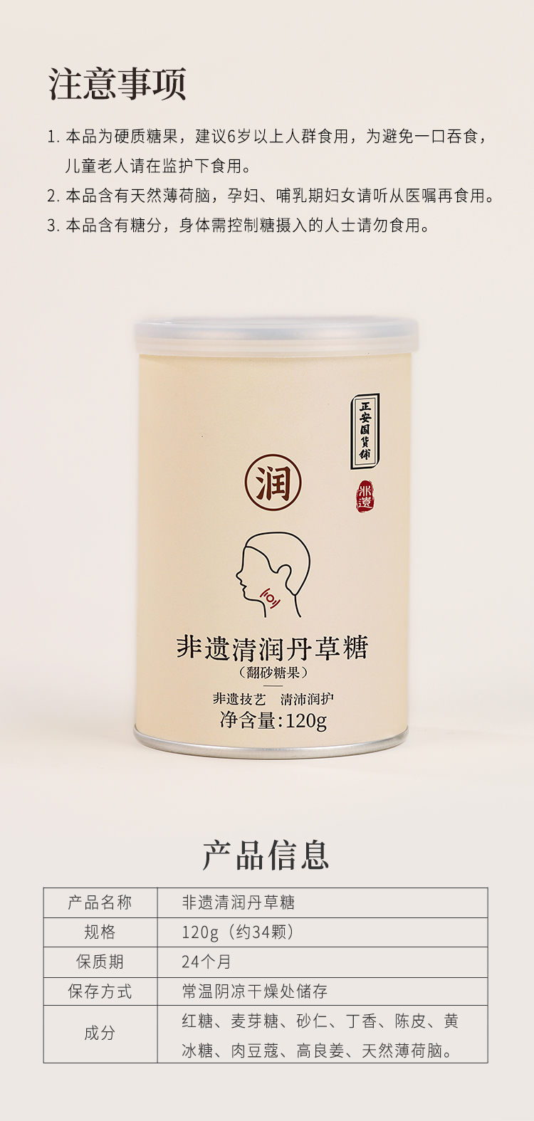 【品名】非遗清润丹草糖 【规格】120g/罐 【保质期】24个月 2025/8月生产 【储存方法】请置于阴凉干燥处,避免阳光直射 【产地】济南 【发货地】广州 【发货快递】圆通 【不发货区域】新疆,西藏,港澳台地区不发 【补邮费地区】内蒙古,青海+15元 【发货时效】3-5个工作日,节假日顺延 |