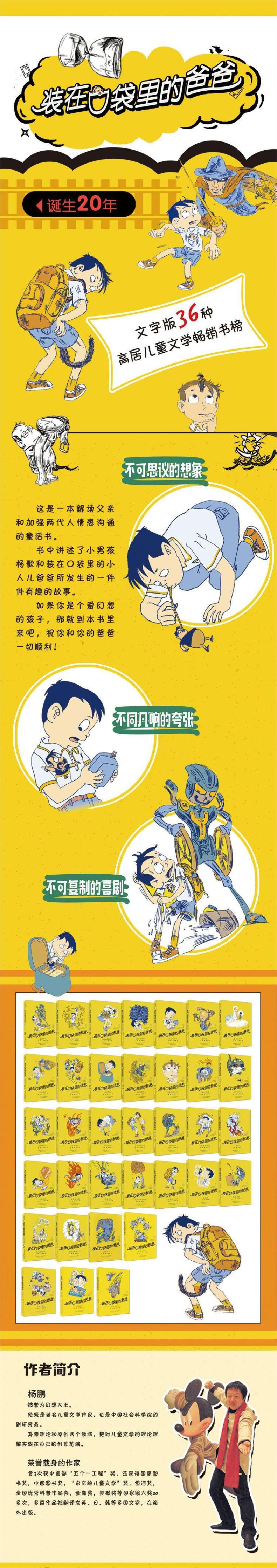 杨鹏 笔名雪孩。中国社科院文学所副研究员,中国作家协会会员,北京作协儿童文学委员会委员,北京作协签约作家。出版作品100多部,计1000多万字。主要作品有:《杨鹏科幻系列》《装在口袋里的爸爸》《校园三剑客》等,动画片《少年狄仁杰》(104集)《千千问》(128集)《福娃》(52集)《YOYO奇遇记》(52集)、中国大型科幻话剧《带绿色回家》等,理论专著《卡通叙事学》《科幻类型学》《结构主义和后结构主义在中国》等,创作翻译影视同期书:《快乐星球》《变形金刚》《少年包青天》《小鲤鱼历险记》《芭比娃娃》等。曾3次获官方文艺奖—中宣部“五个一工程奖”,另外还获儿童文学界奖—“宋庆龄儿童文学奖”,中国科幻界奖—银河奖,中国科普界奖—全国优秀科普作品奖,中国图书界奖—国家图书奖、中国图书奖,中国电视奖—金鹰奖,中国动画奖—美猴奖等各类以上大奖20多次,多篇作品被翻译成英、日、韩等多国文字,在海外出版。