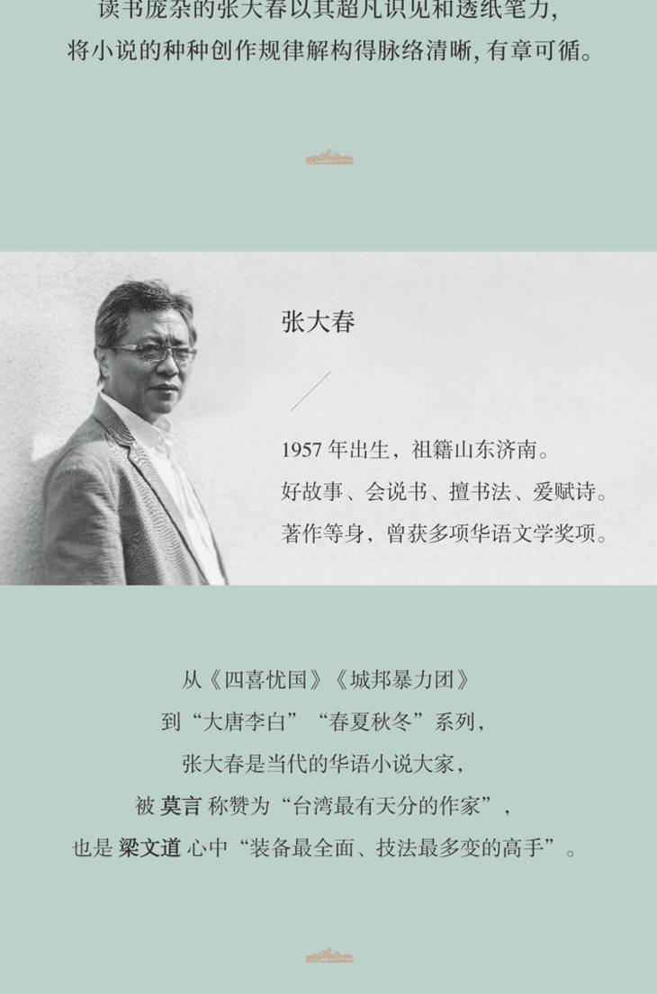 张大春:台湾作家,1957 年出生,祖籍山东济南。好故事、会说书、擅书法、爱赋诗。著作等身,曾获多项华语文学奖项。