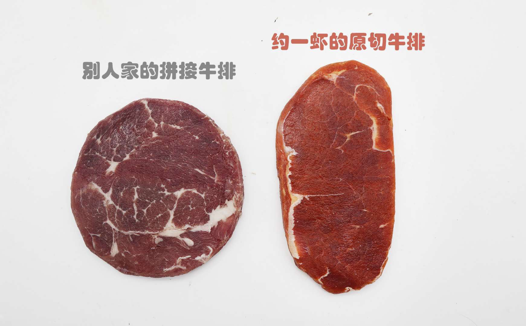 口感上——拼接牛排注水像吃肉饼,原切牛排零添加外焦里嫩
