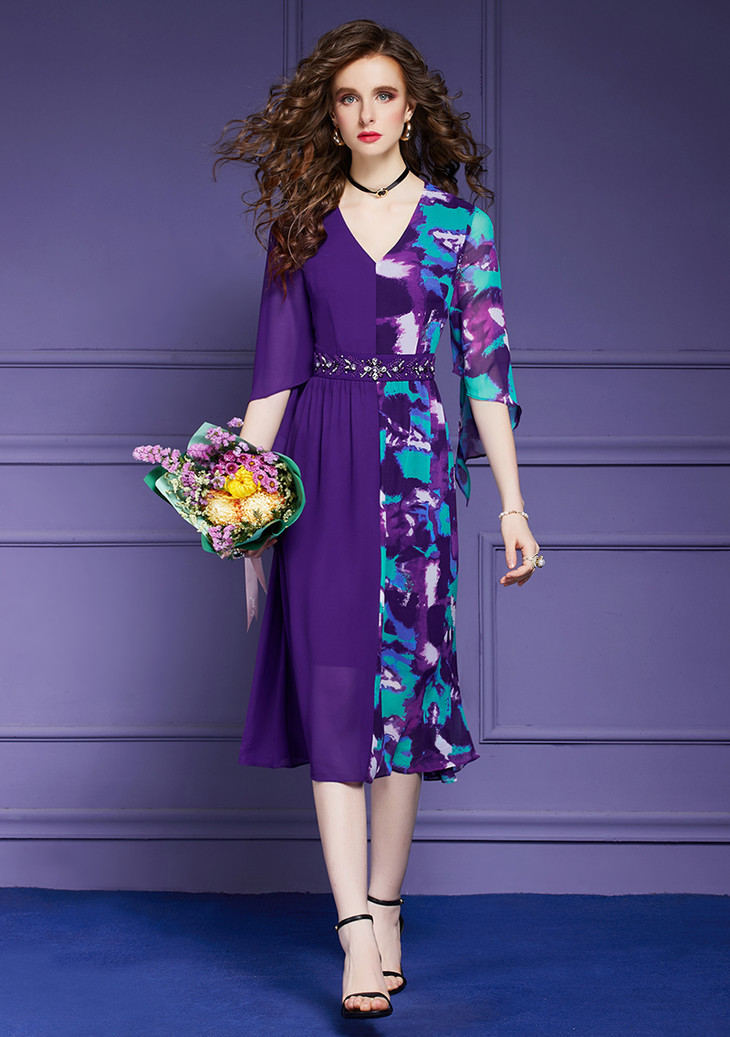 ALXBL1903中长款七分袖拉链2017年春季连衣裙花色V领中腰
