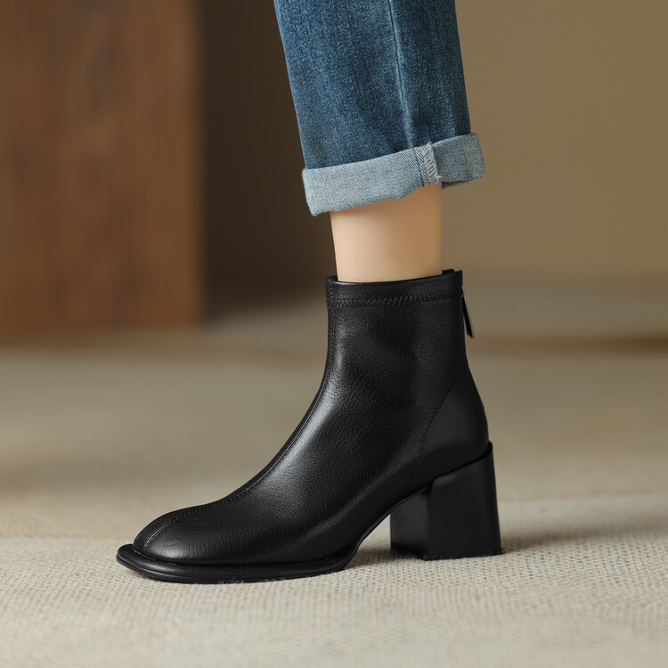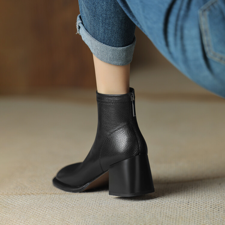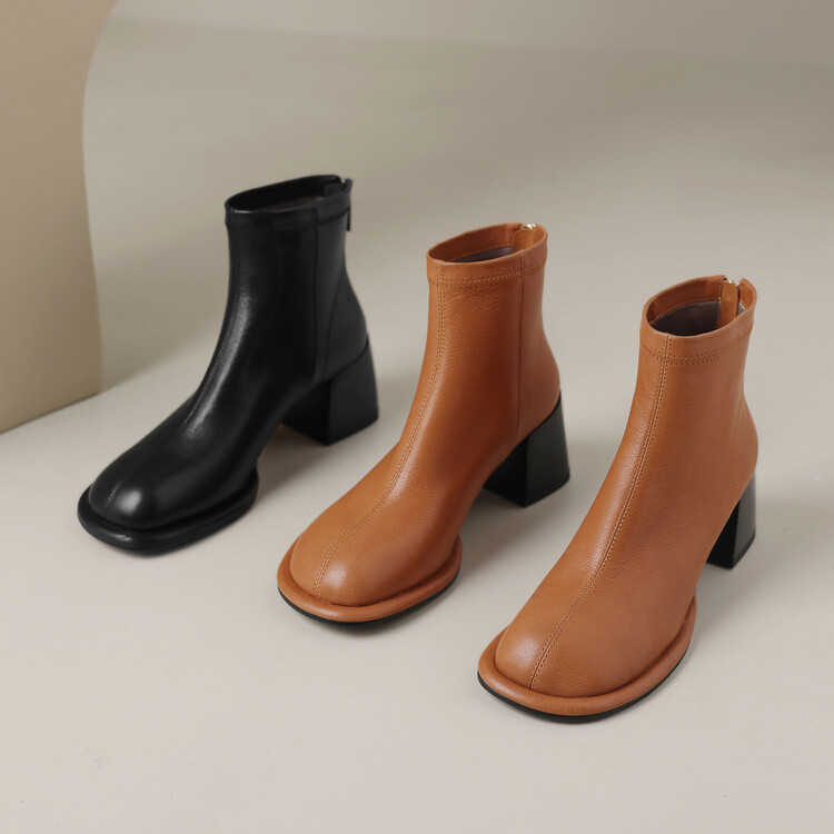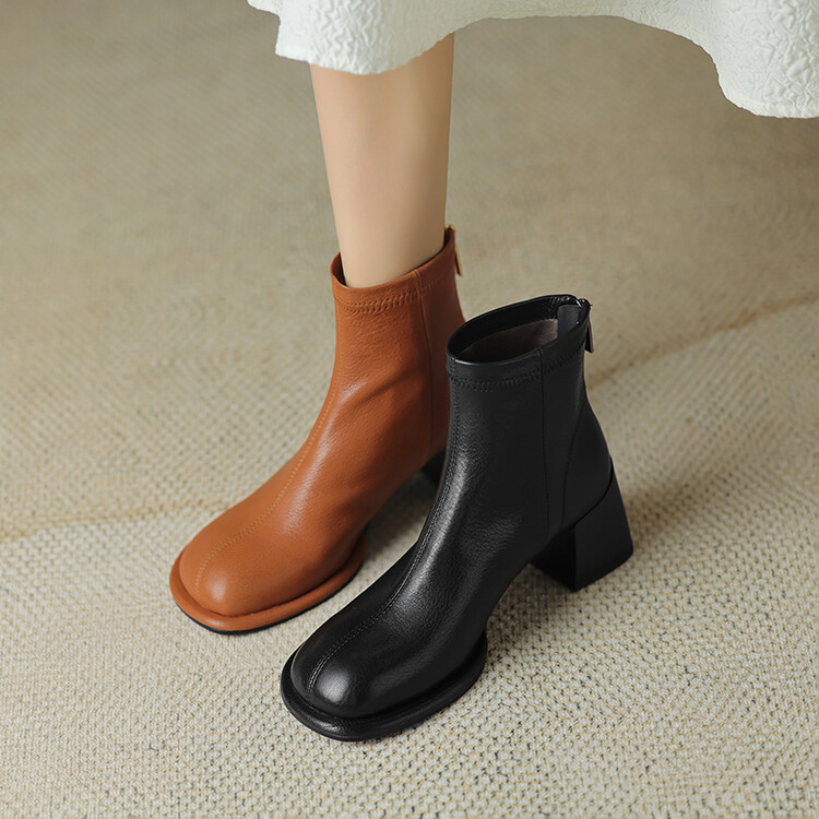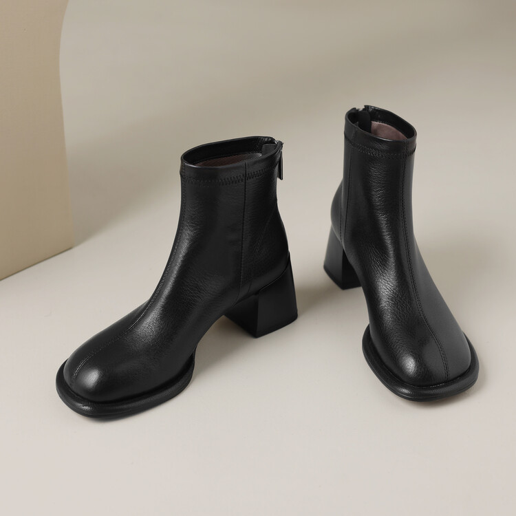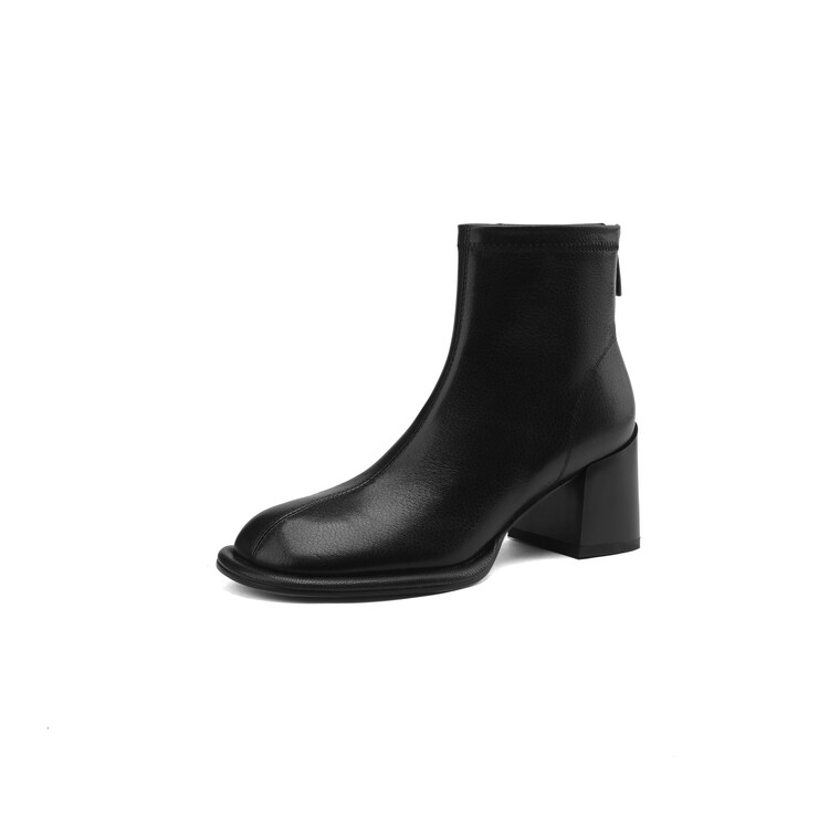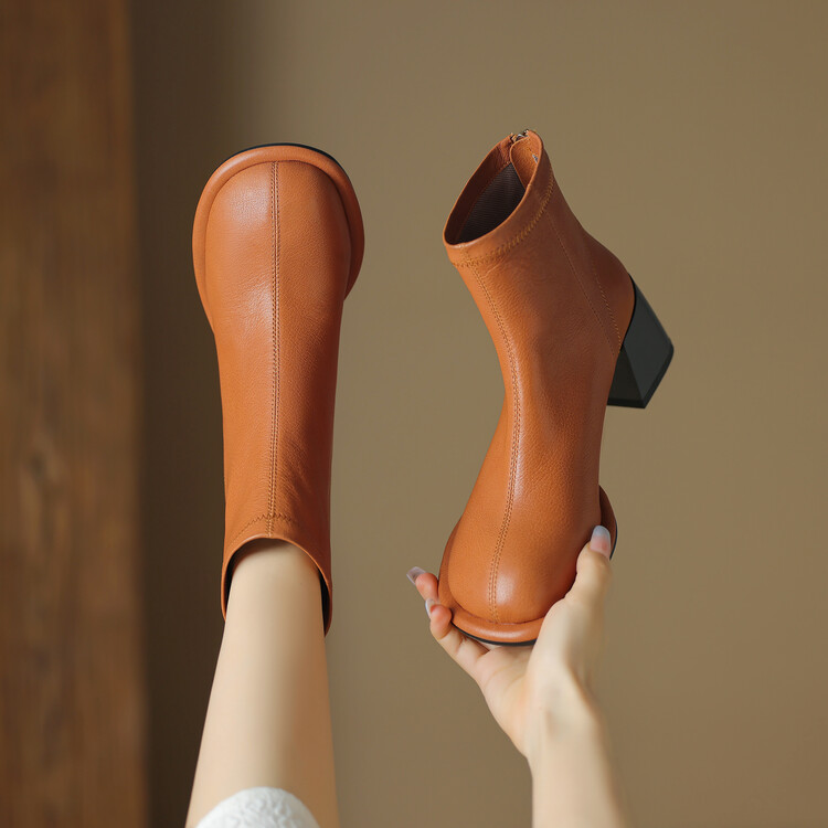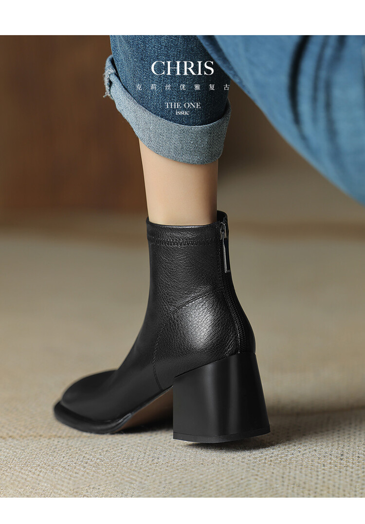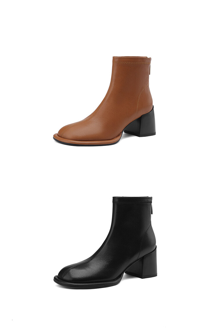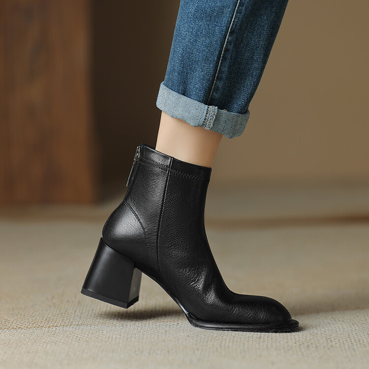 纯色百搭,软肤水晶头层羊皮粗跟后拉链短靴YS-3299