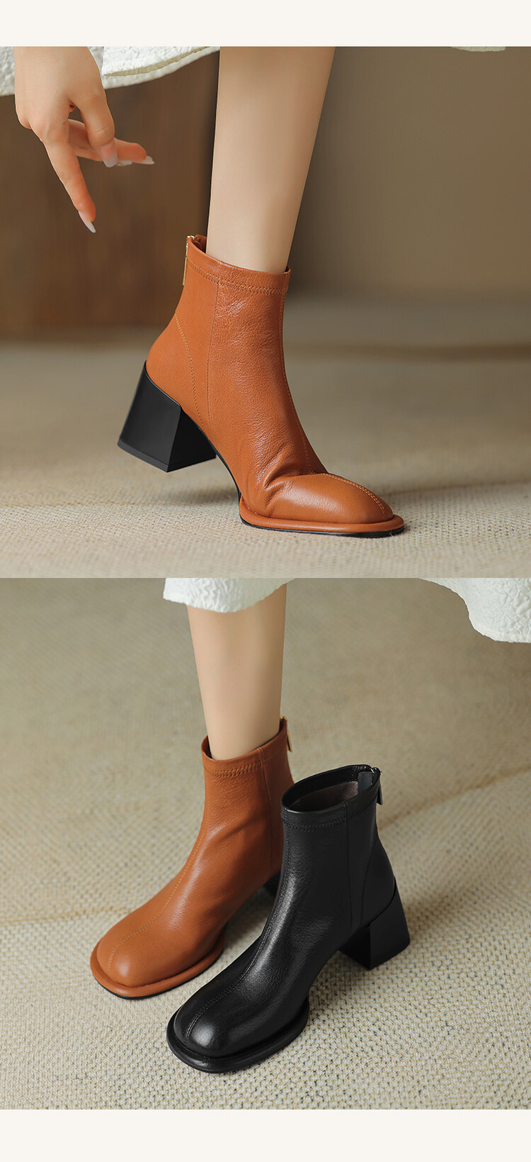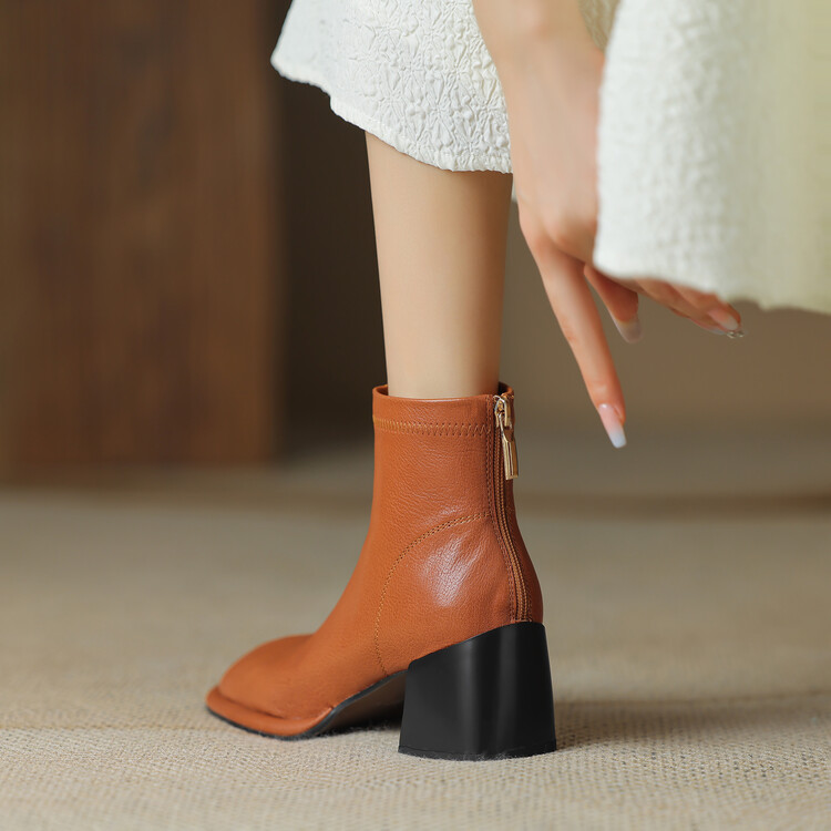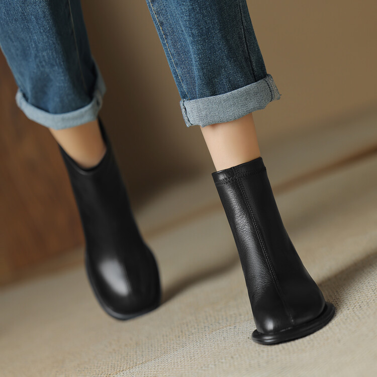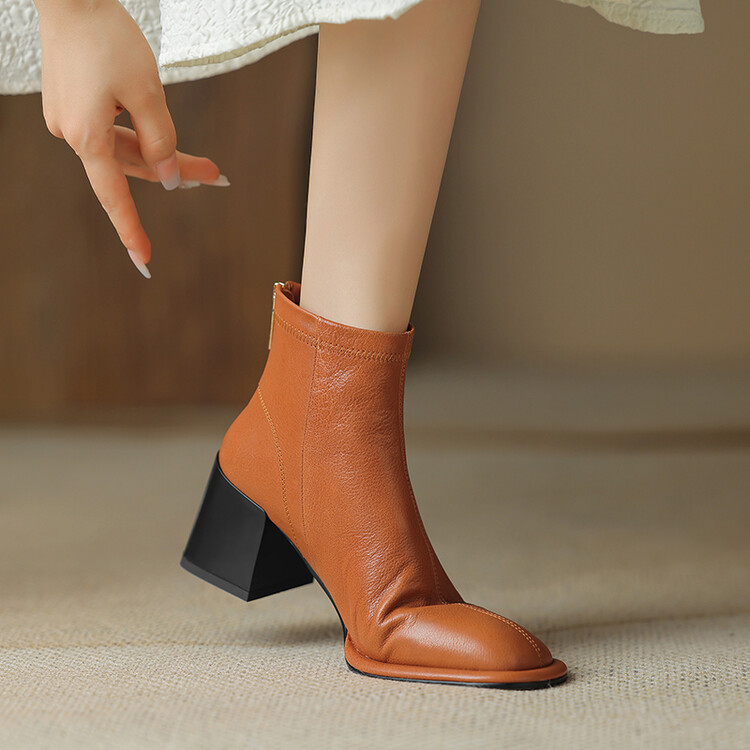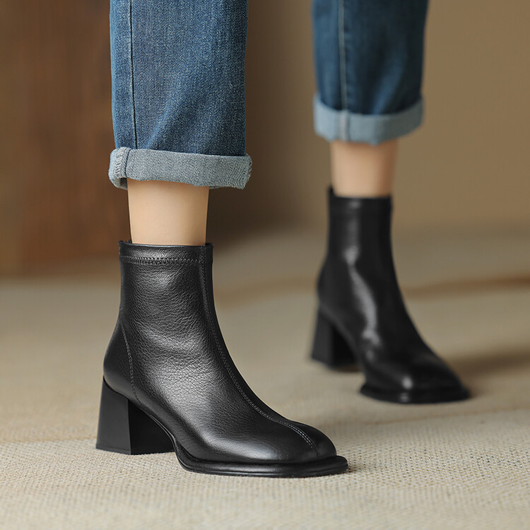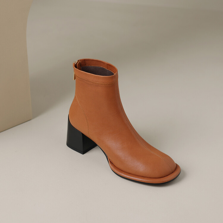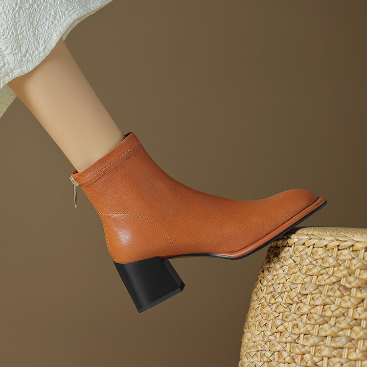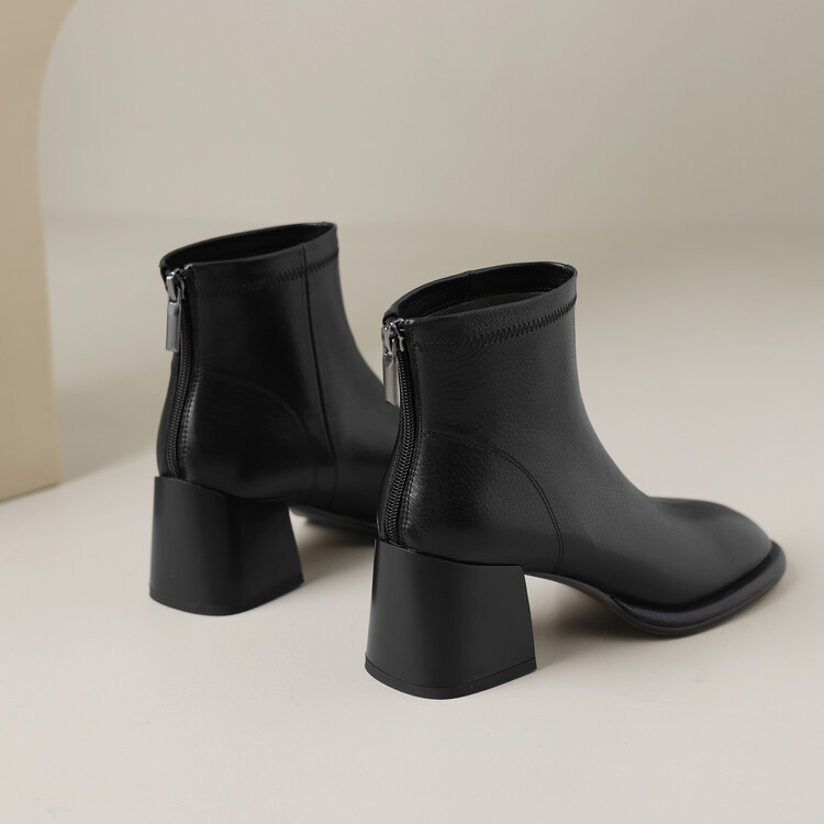 纯色百搭,软肤水晶头层羊皮粗跟后拉链短靴YS-3299