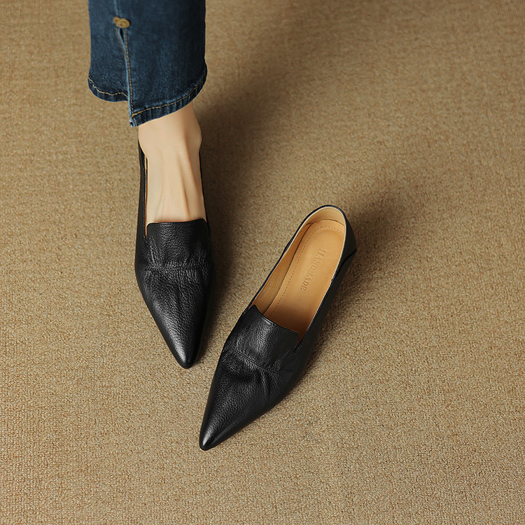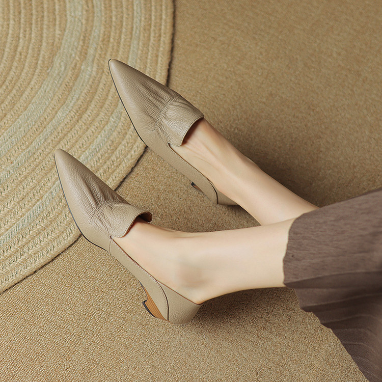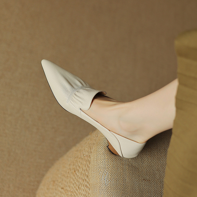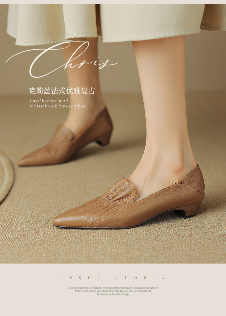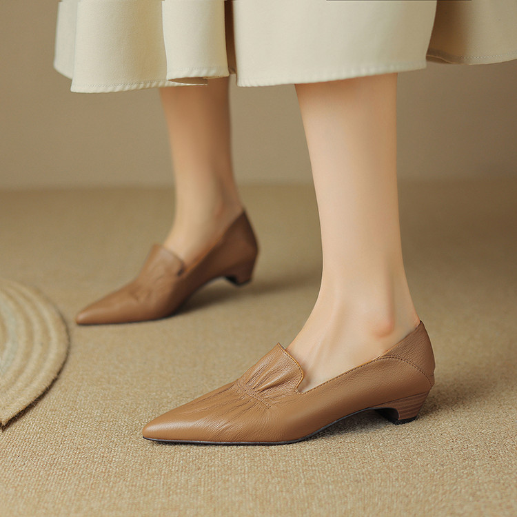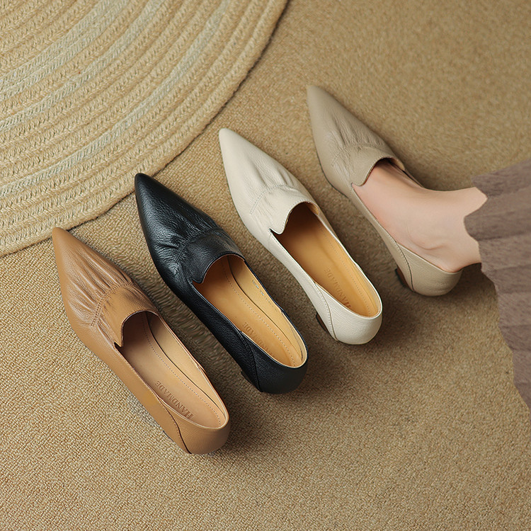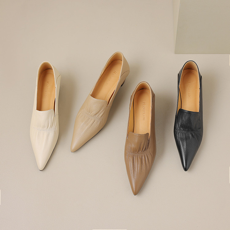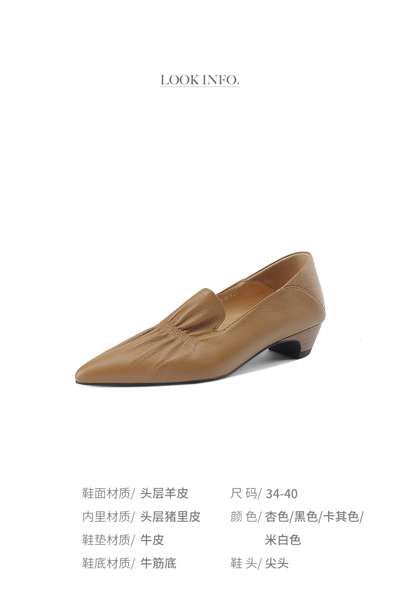 【预售5天】复古羊皮浅口单鞋女春秋新款粗跟真皮尖头褶皱小皮鞋软皮中跟鞋子SSS&5506