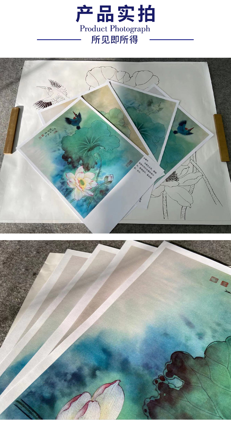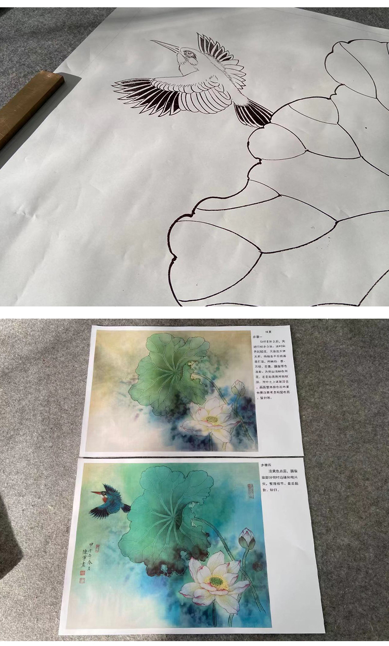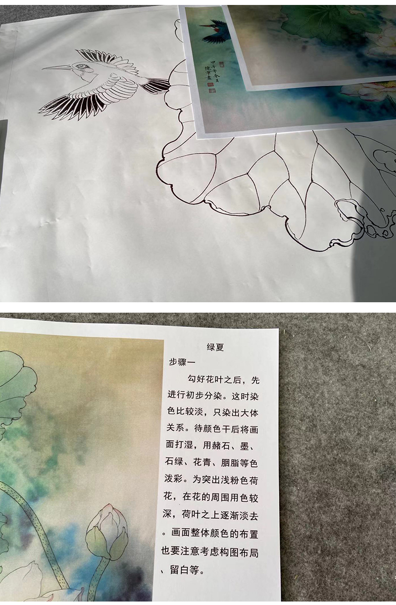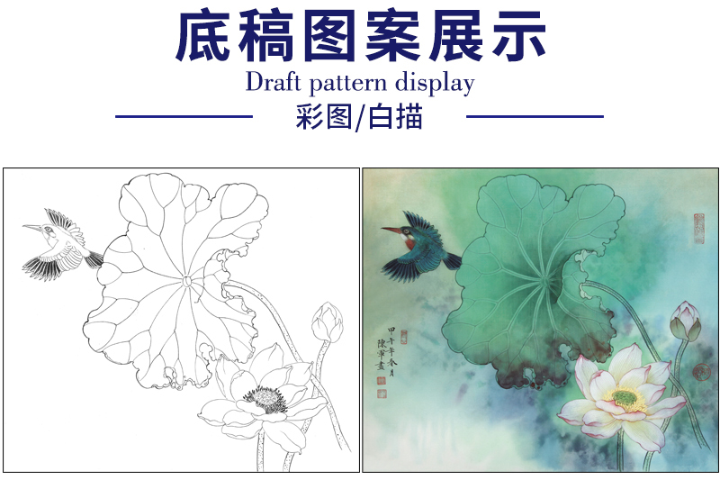 【有步骤】陈军工笔画白描底稿斗方小品《绿夏》荷花翠鸟初学者临摹花鸟线稿CJ04