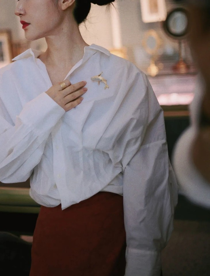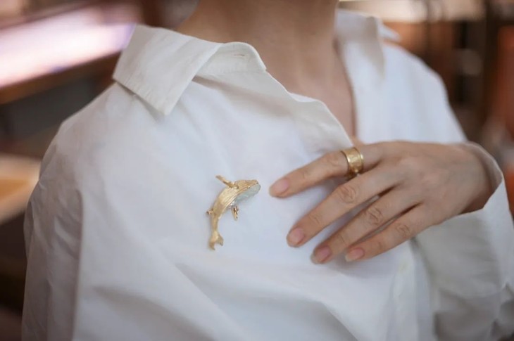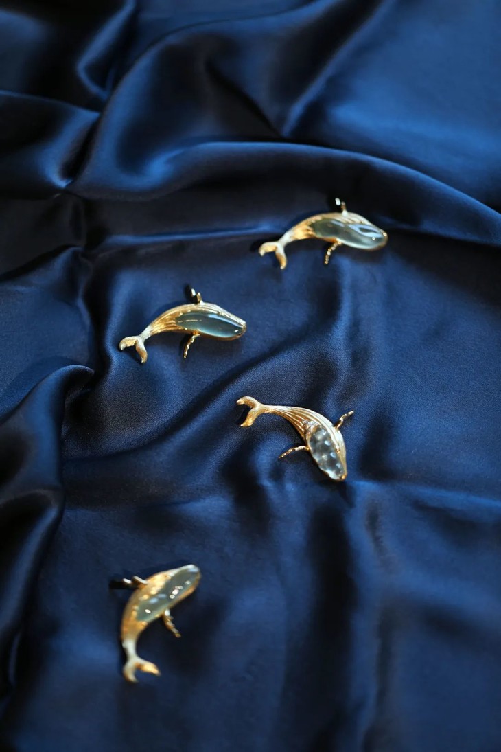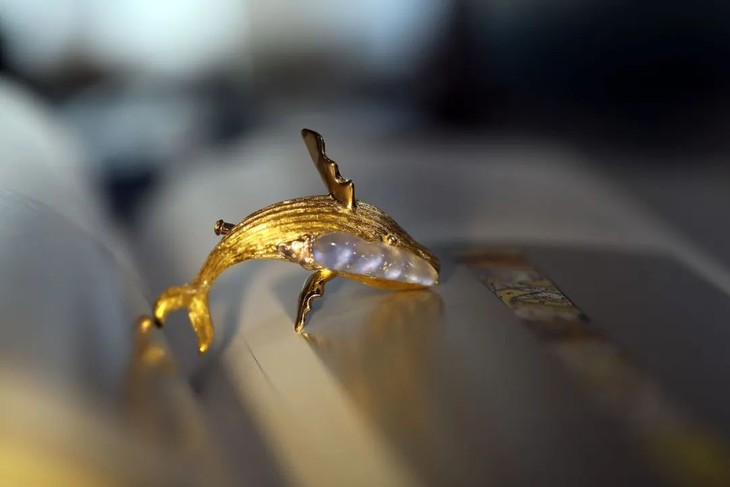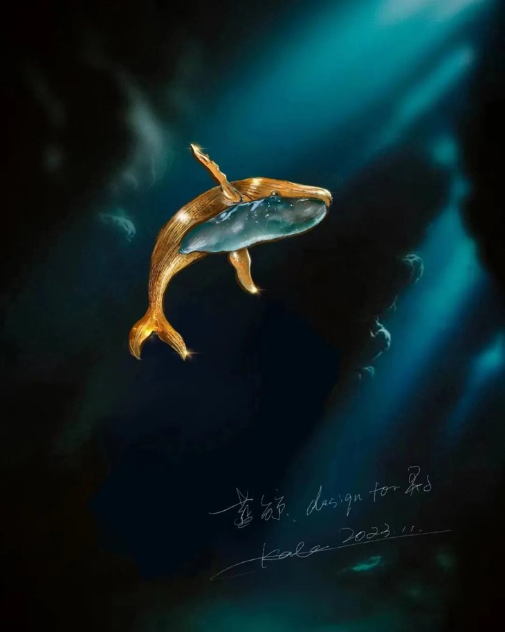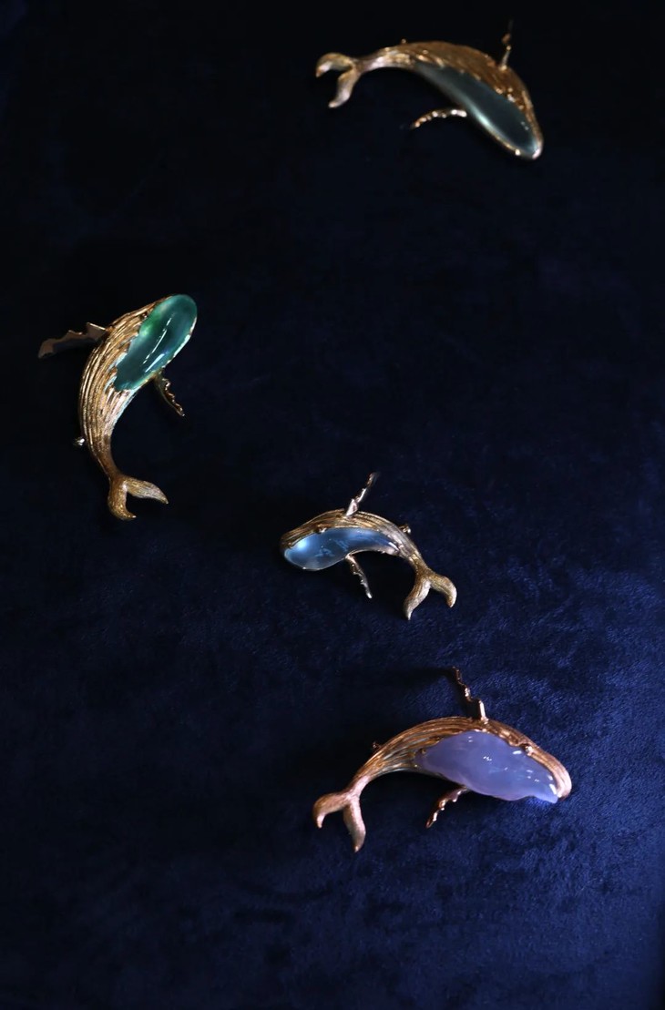 浅色条形翡翠就如同鲸鱼的肚子,翡翠清透的光晕及雕刻的起伏,又如水如浪,宛如鲸鱼诞生与生活的海洋。用金做鲸鱼身体,本就和现实鲸鱼色彩相去甚远。我就取其肌理和形意。用拉丝的肌理做出鲸鱼身体上顺洋流生长的纹路。在翡翠与黄金材质交接的地方,刻画出它的眼睛。每一块翡翠料子不同,金和翠的比例,甚至鲸鱼动态姿势。都要随之调整,增一分过多,减一分则太少。