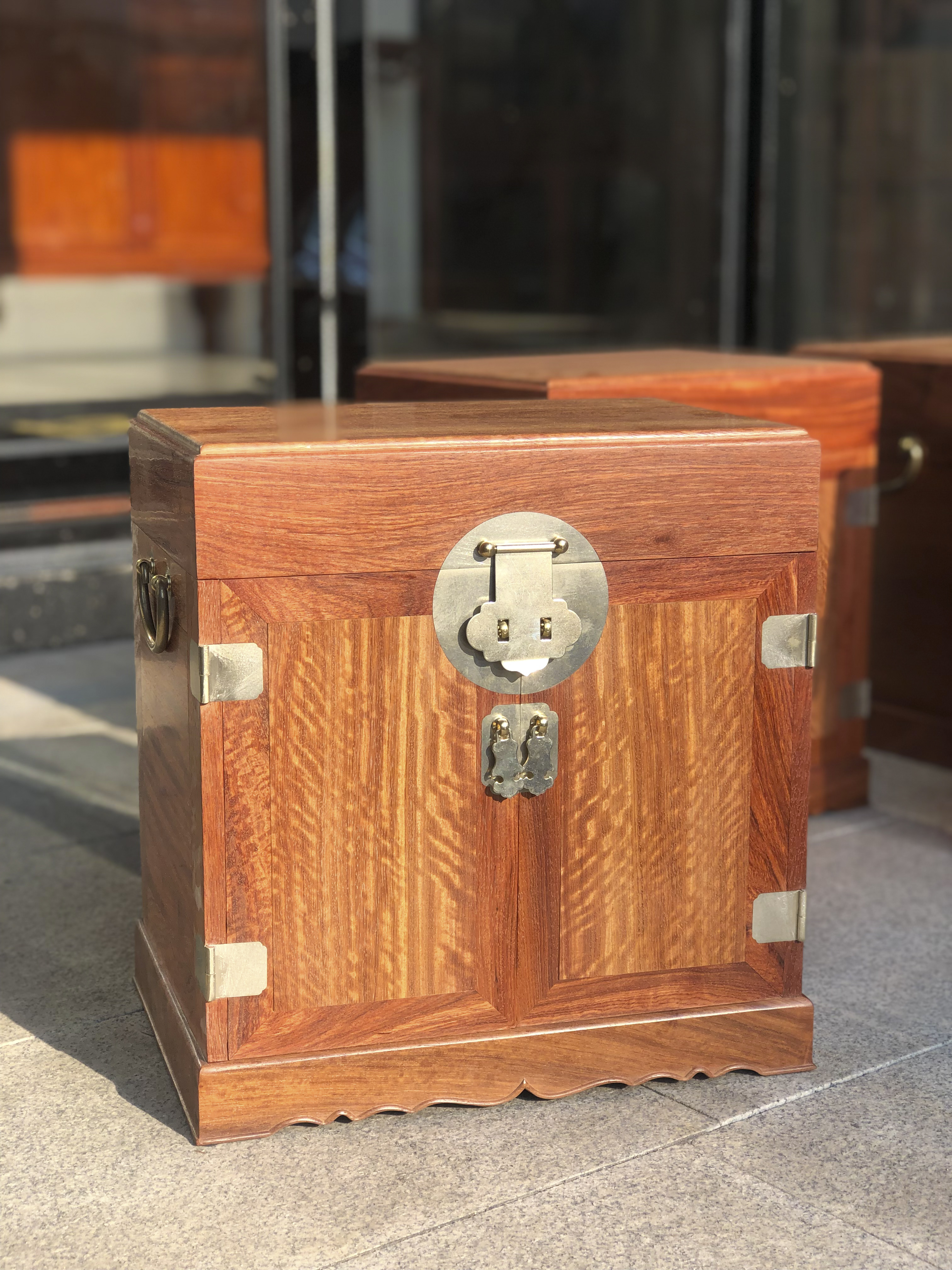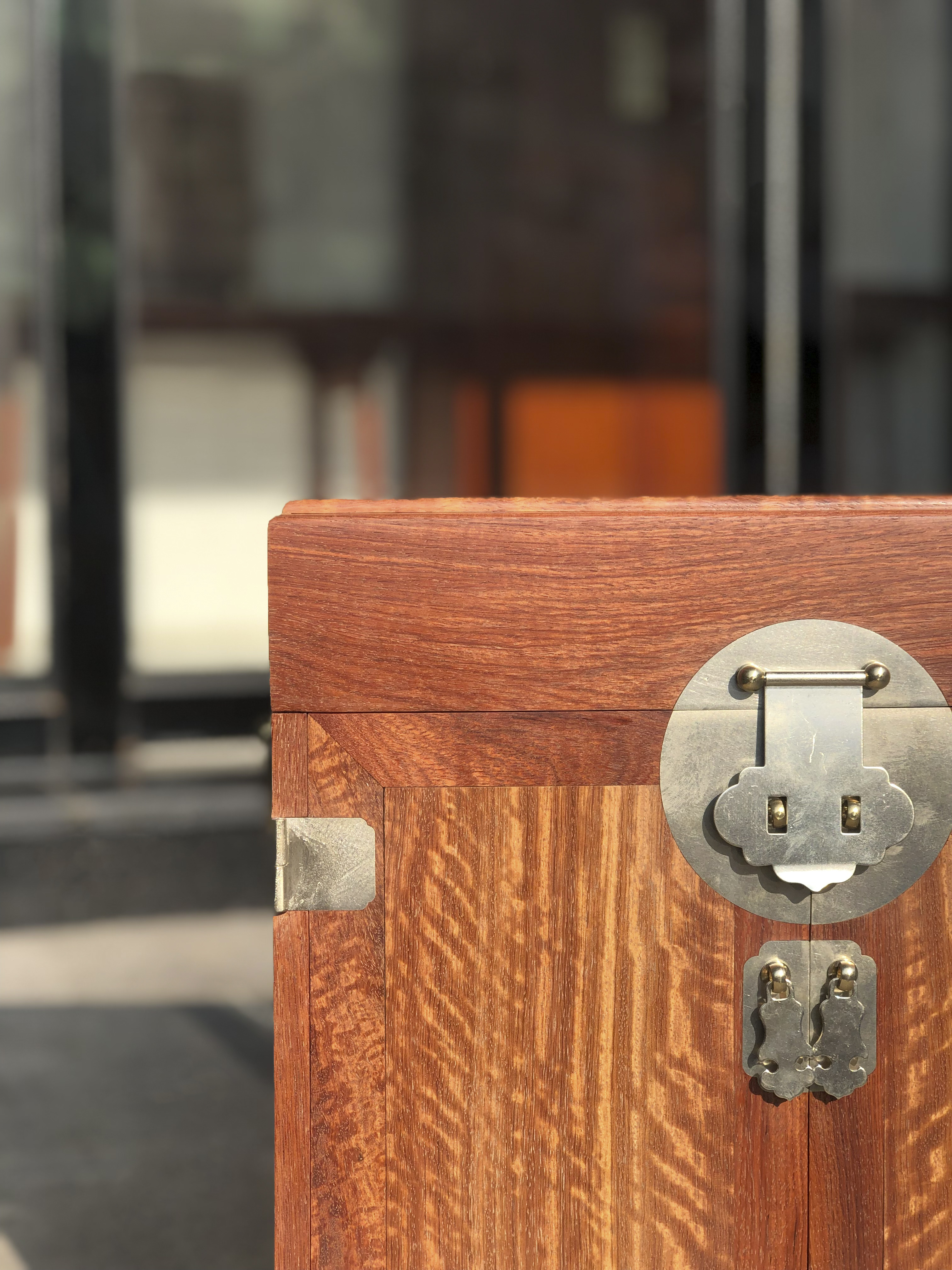 此款缅甸花梨复刻的官皮箱,原型见于故宫博物院藏黄花梨款,此箱为拍子式两开门,为官皮箱之传统样式。