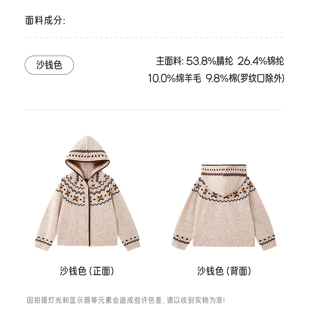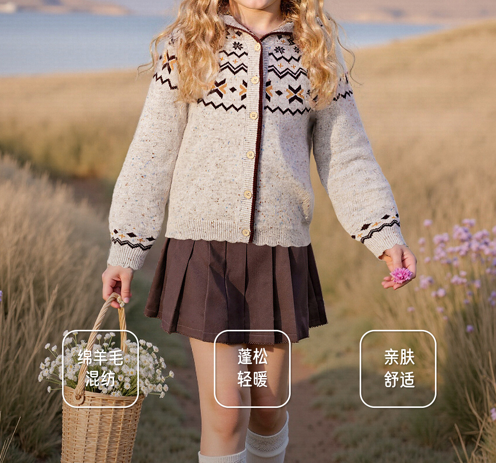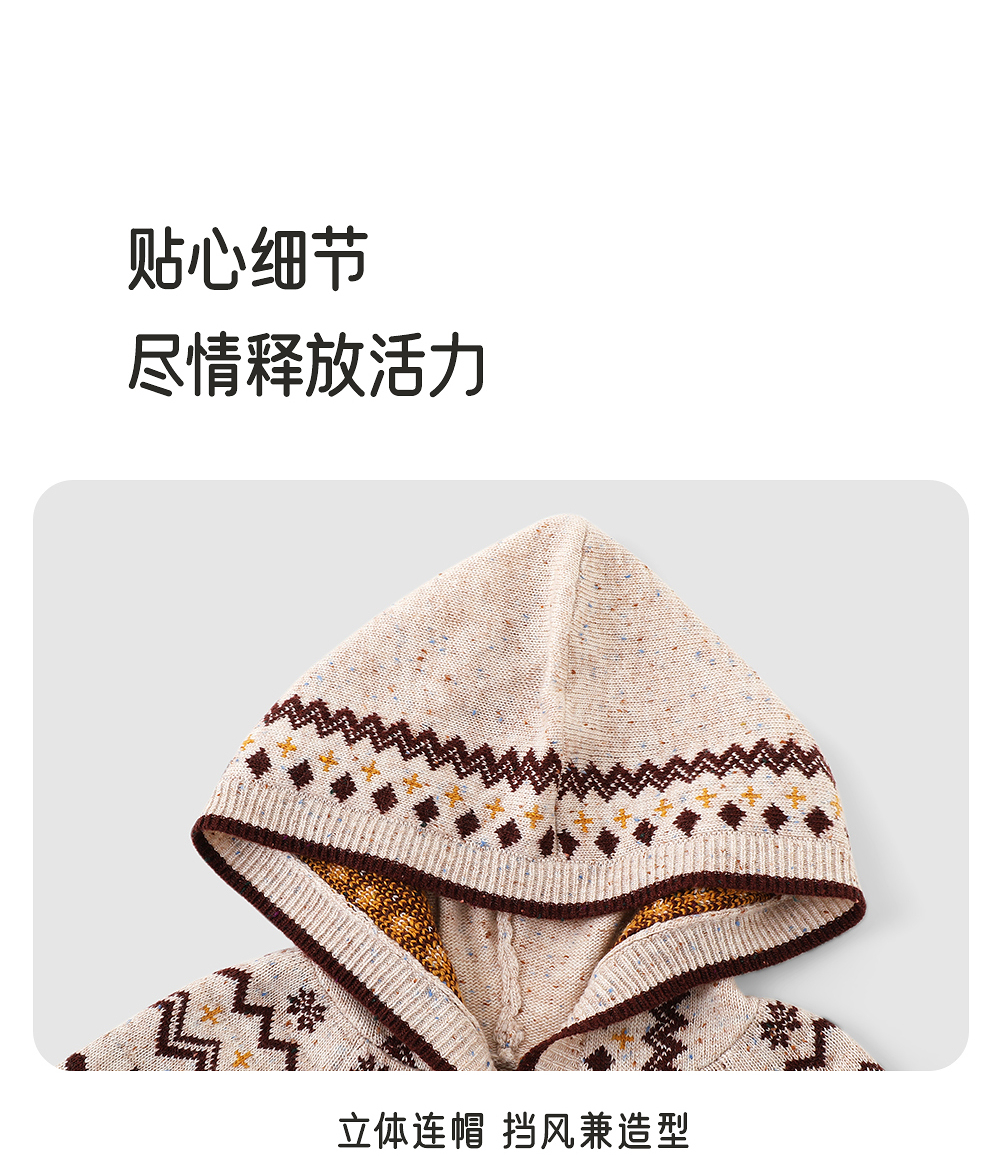 英氏儿童薄外套长袖女童针织费尔岛外套开衫春秋季百搭中大童连帽羊毛衫