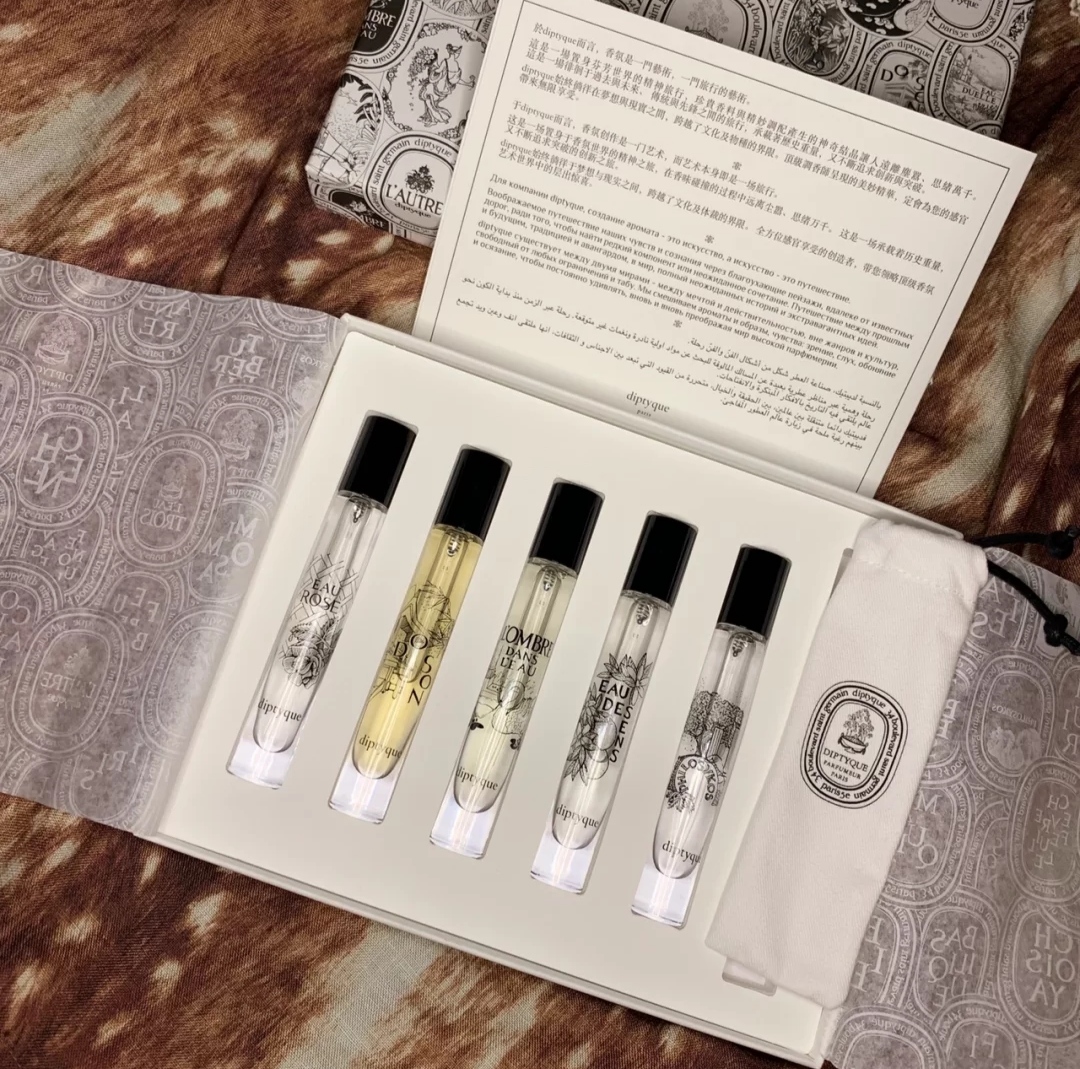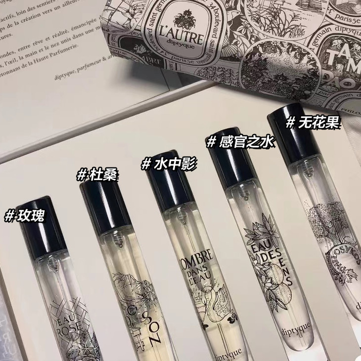 👑蒂普提克迷你香水五套装 👍花调香🌸+木质馥奇香调✨+柑橘馥奇香调🍊,三香五合一🙌🏻。 ❤️杜桑:前调较为浓郁,韵味鲜明🍃,后调柔软清新,适合美人来驾驭。 🧡水中影:清淡中透着一丝丝的甜🌸,有一份少女的怯意在其中💃🏻,很柔软很美好。 🖤无花果:一款神奇的果味,初闻会有所惊讶,后有自然气息,是浑然一体的幽幽香气 💜感光之水:柑橘调的夏天味道🌞,比较清新🆕。 🌹玫瑰:像极了新彩的玫瑰✨,初初绽放的淡雅清新,不浓郁🏜️。 💥五款香水,各有特点,不妨尝试这一套,集齐你心目中的味道❗ 【套装包括】:玫瑰7.5g+杜桑7.5g+感光之水7.5g+无花果7.5g+水中影7.5g