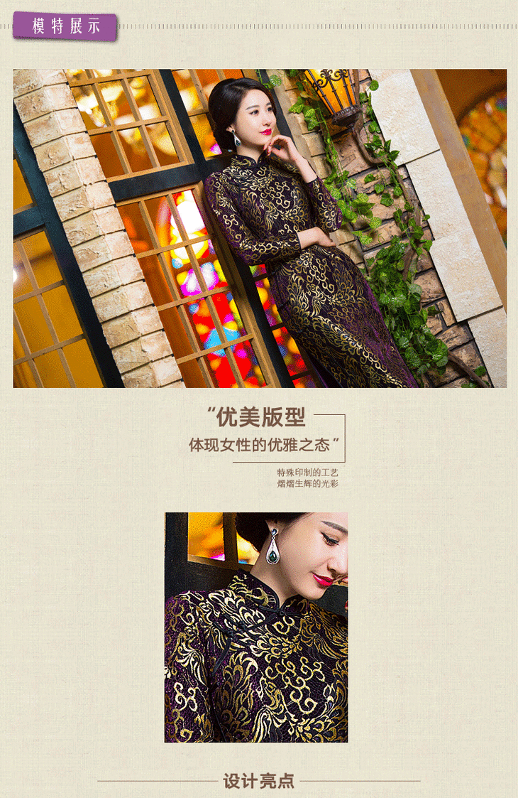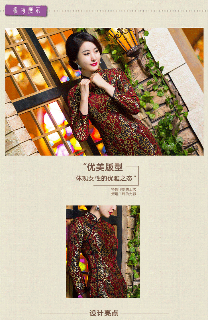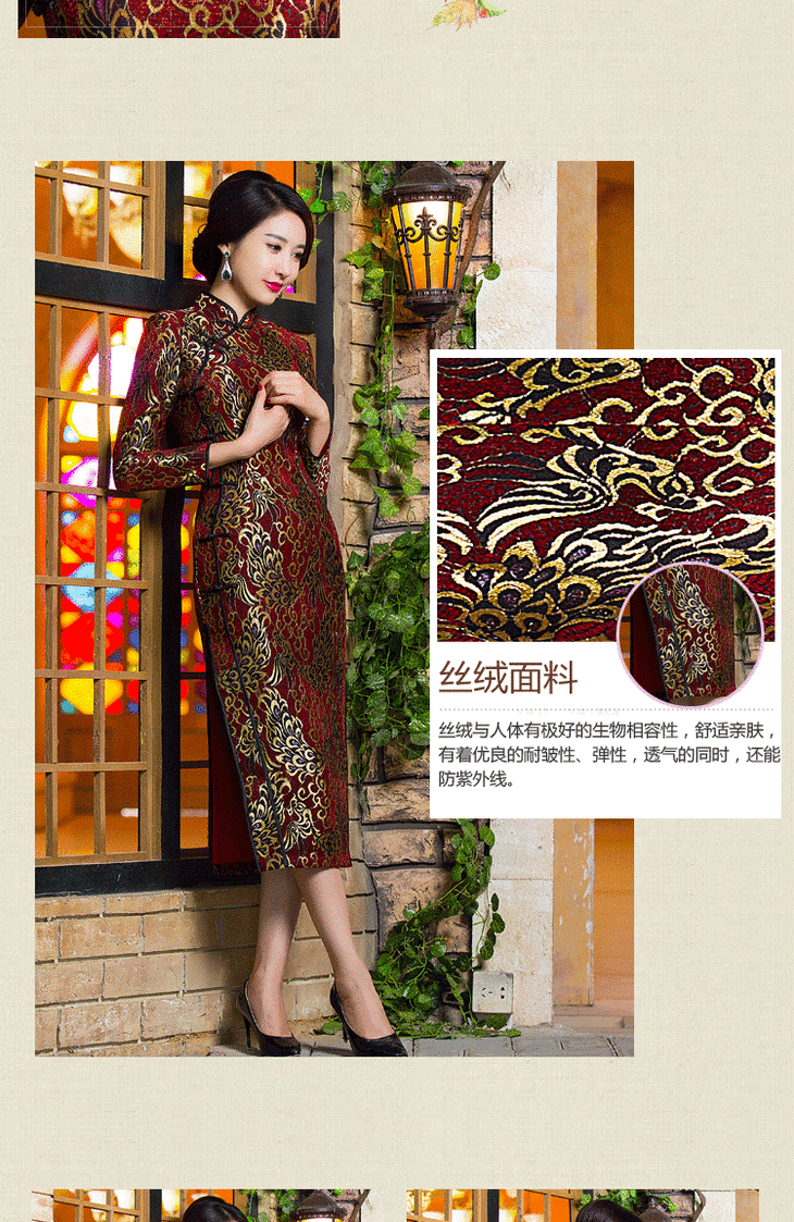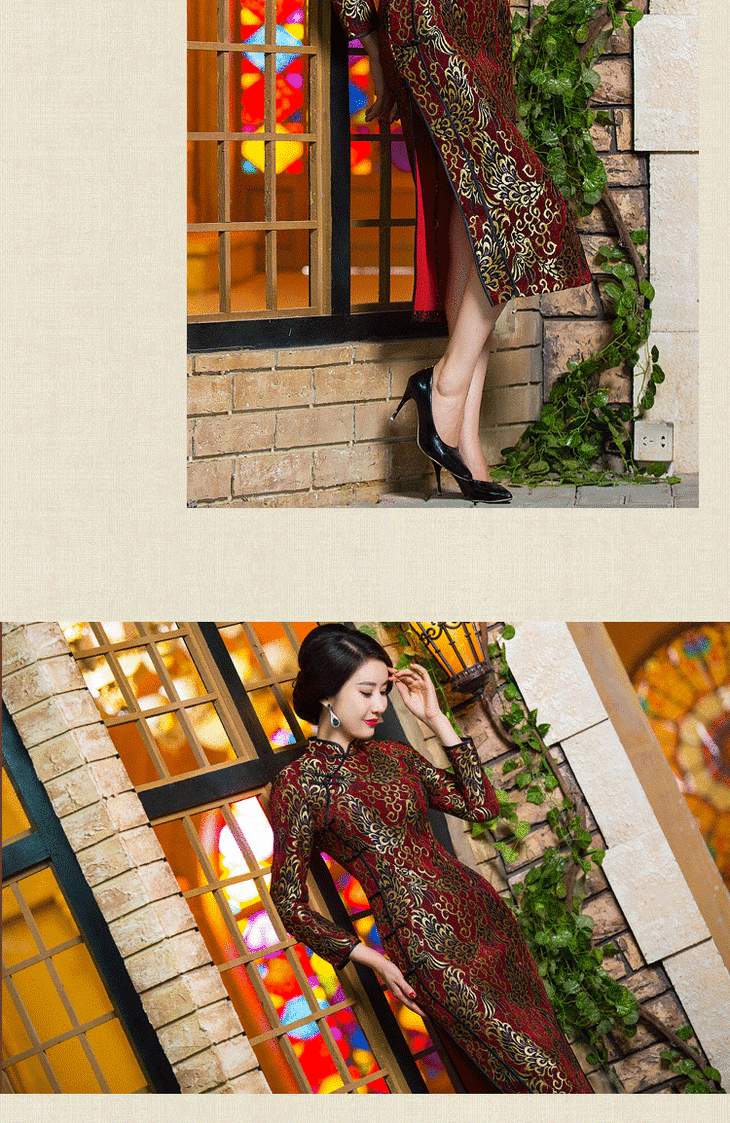 BJS-7604开叉立领丝绒蕾丝长袖旗袍
