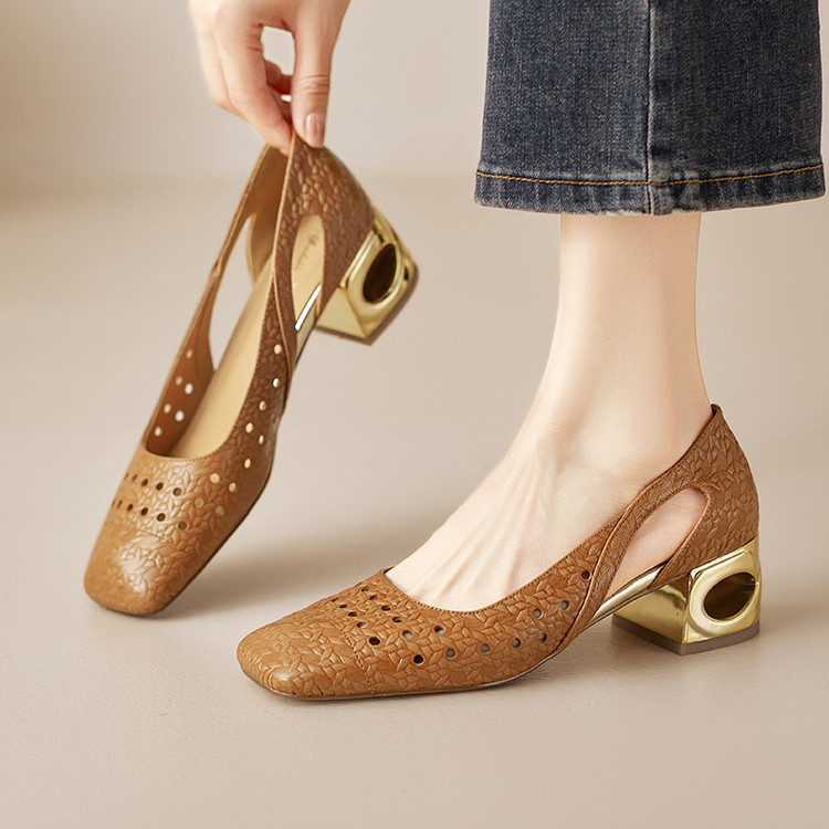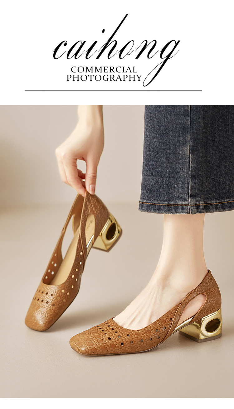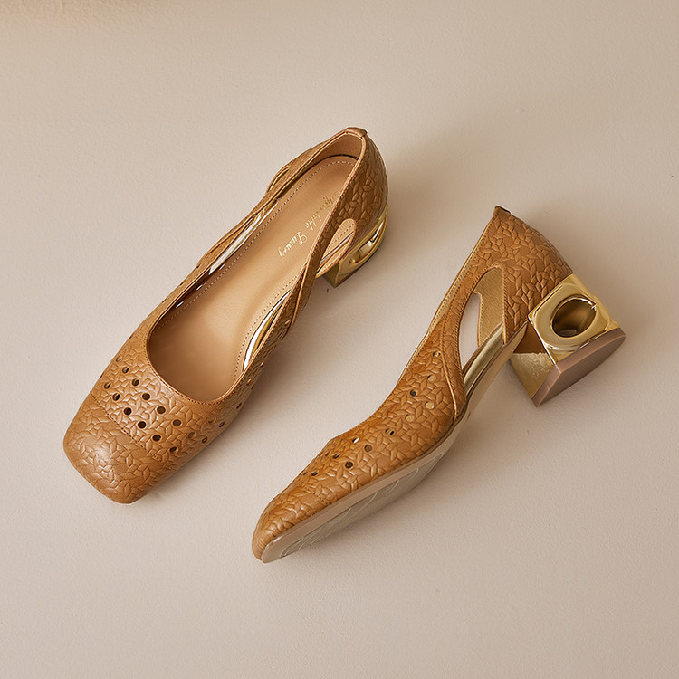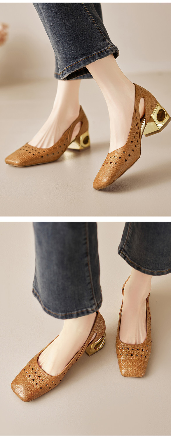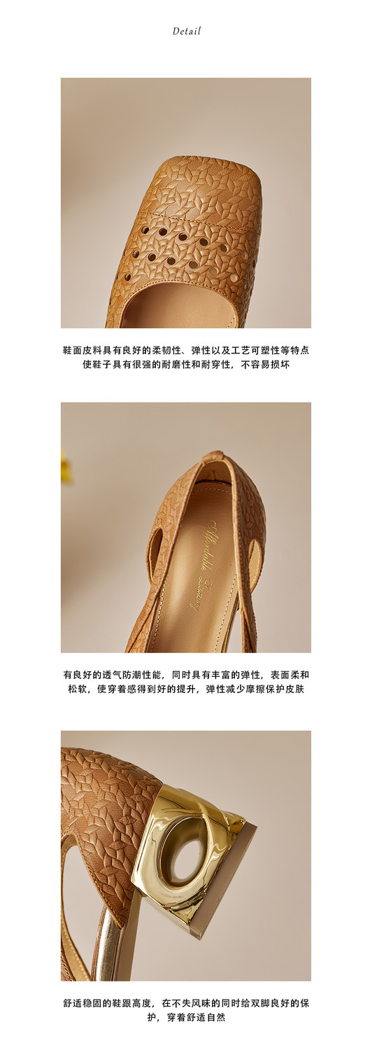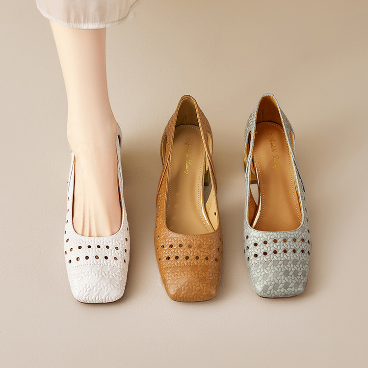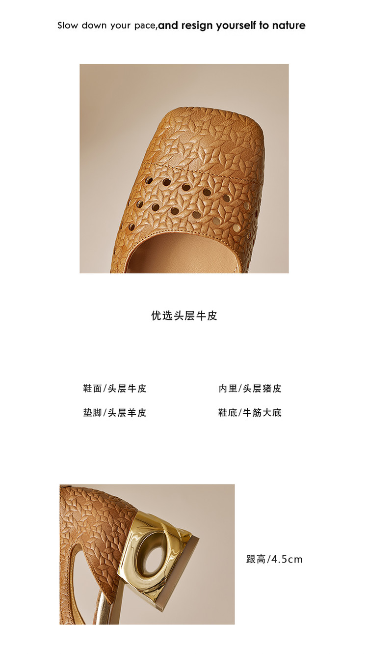 【预售5天】简约方头粗跟头层牛皮夏季浅口镂空真皮透气女鞋MBJR&6912