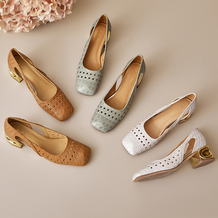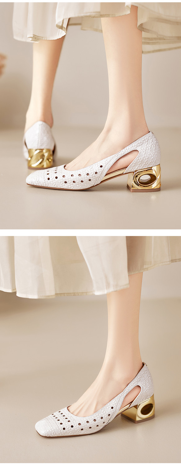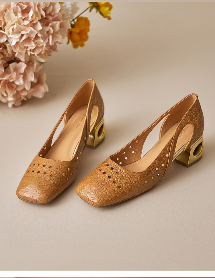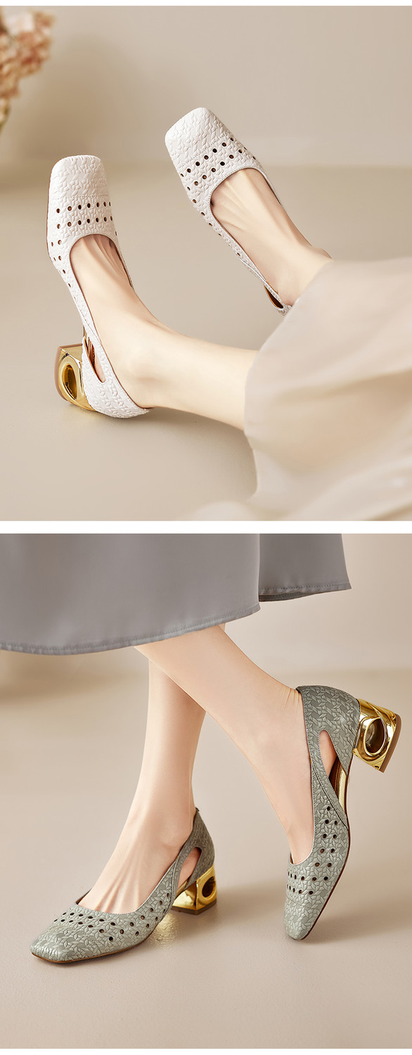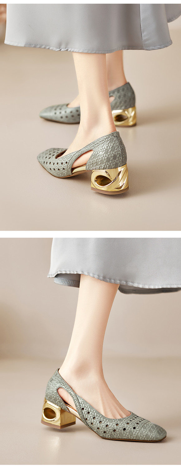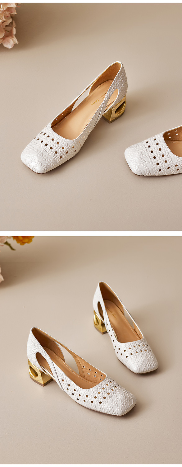 【预售5天】简约方头粗跟头层牛皮夏季浅口镂空真皮透气女鞋MBJR&6912
