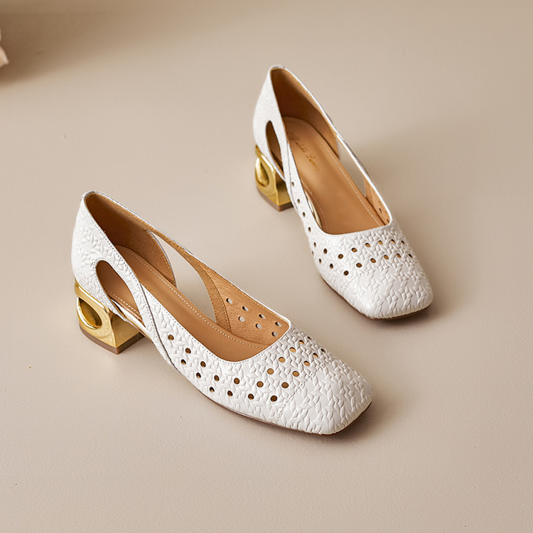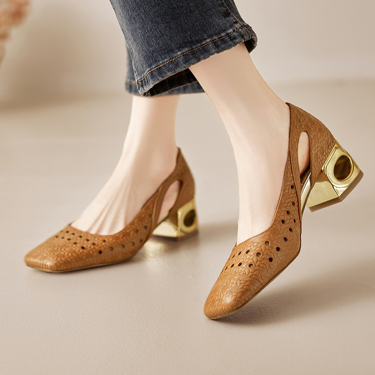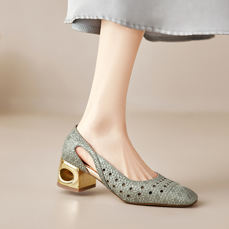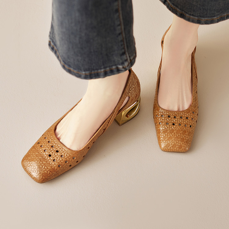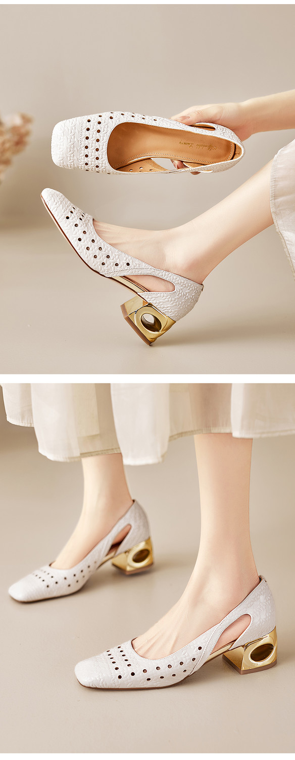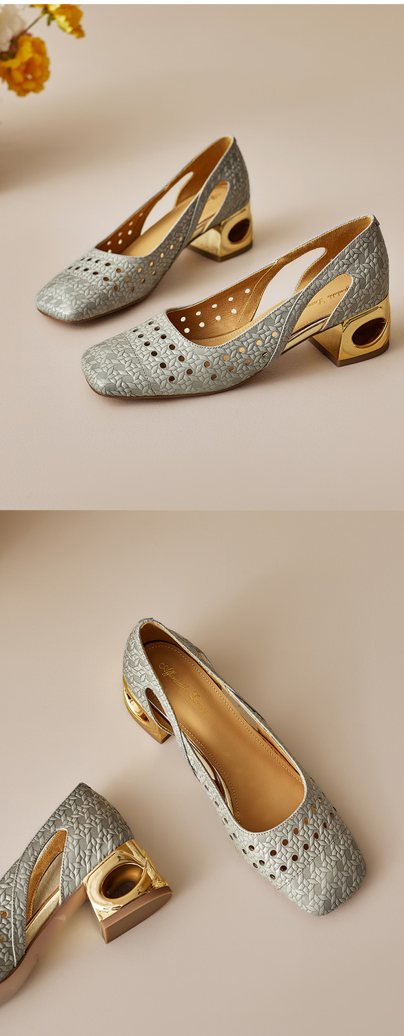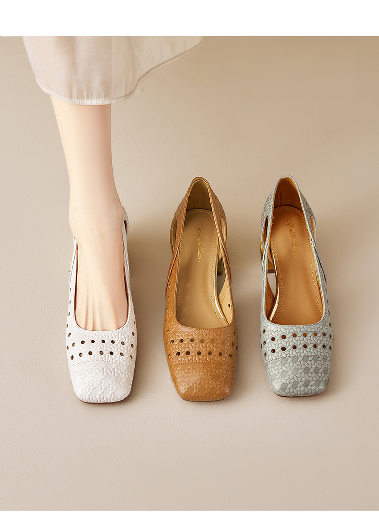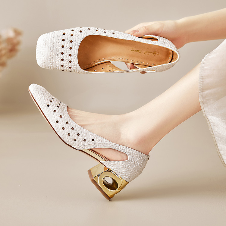 【预售5天】简约方头粗跟头层牛皮夏季浅口镂空真皮透气女鞋MBJR&6912