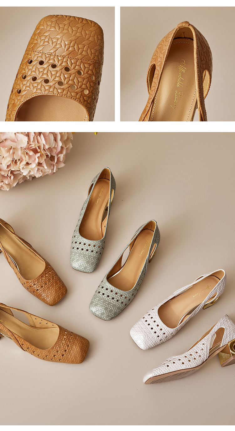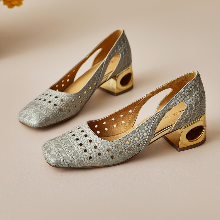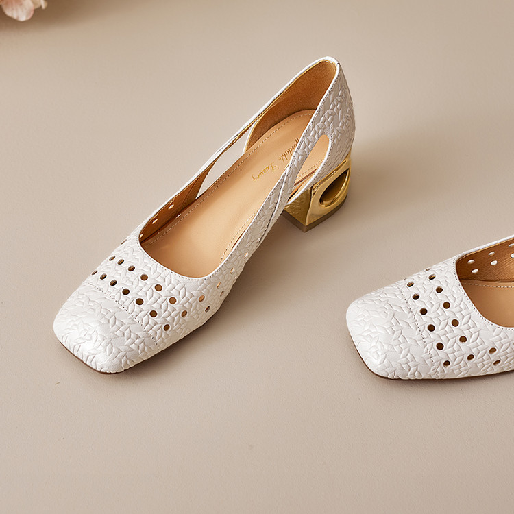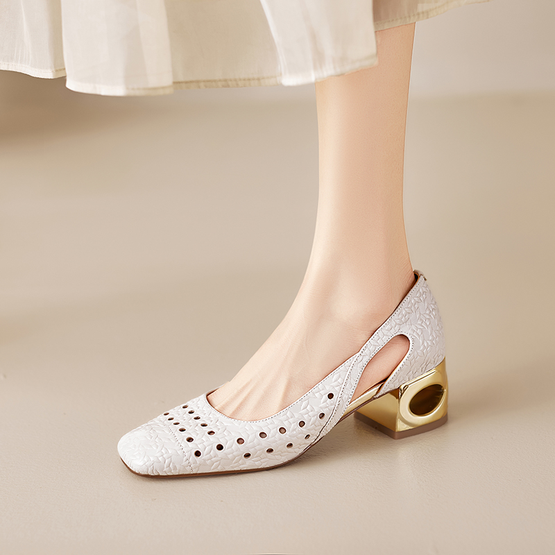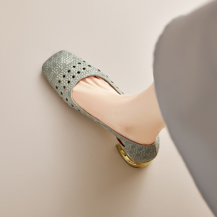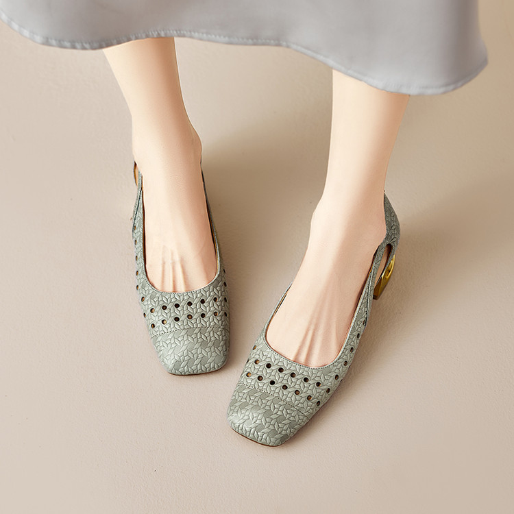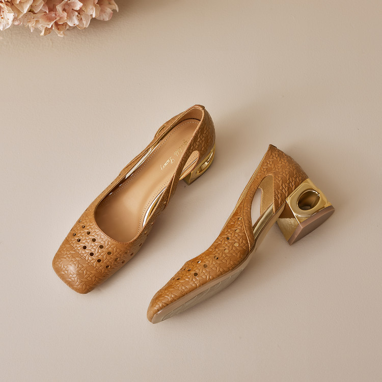 【预售5天】简约方头粗跟头层牛皮夏季浅口镂空真皮透气女鞋MBJR&6912