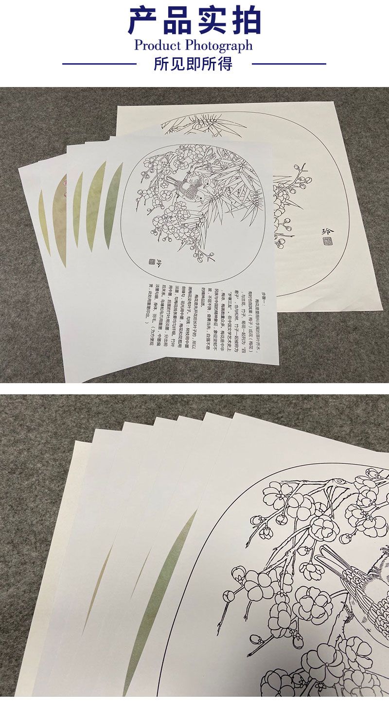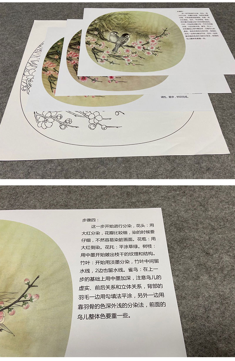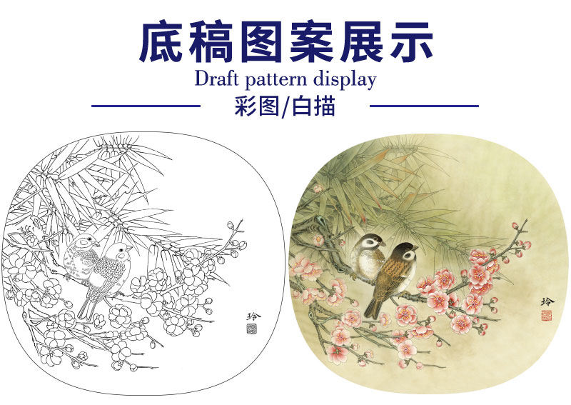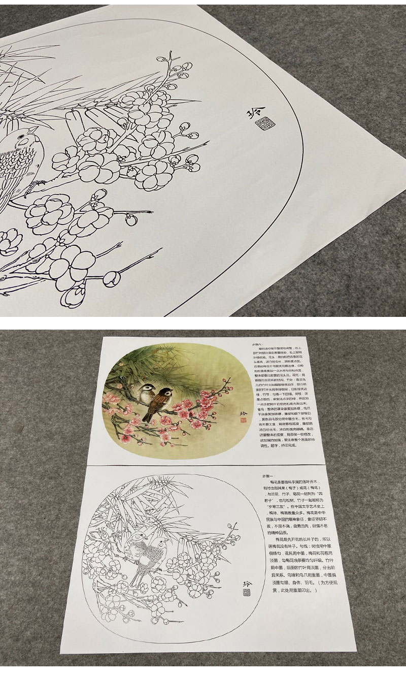 【有步骤、大彩图】郑玲玲工笔画白描底稿小品《梅花家雀》初学者临摹花鸟线稿ZL74