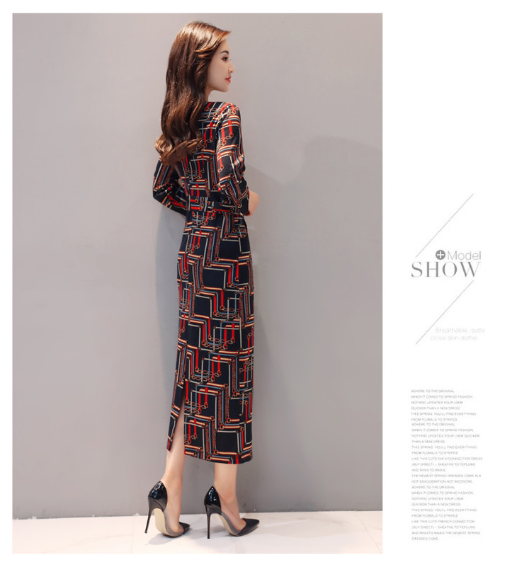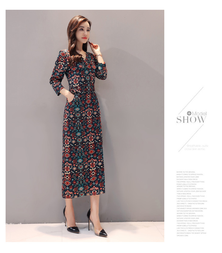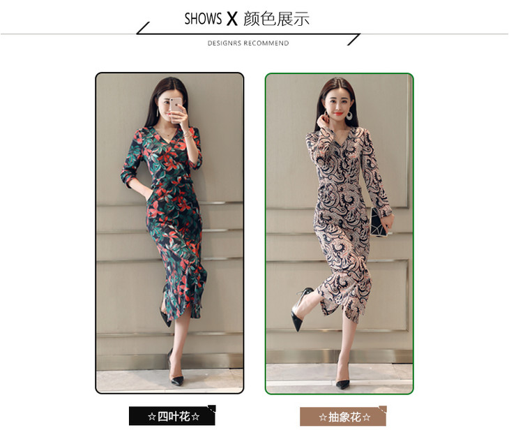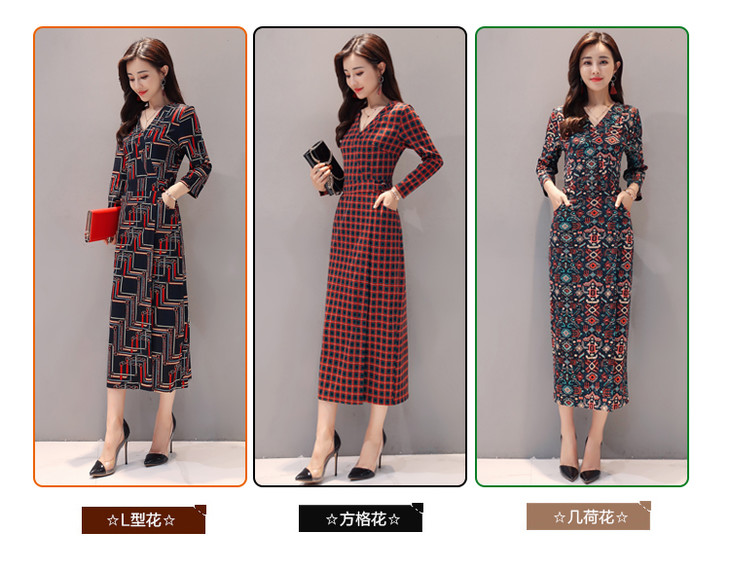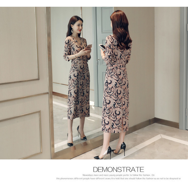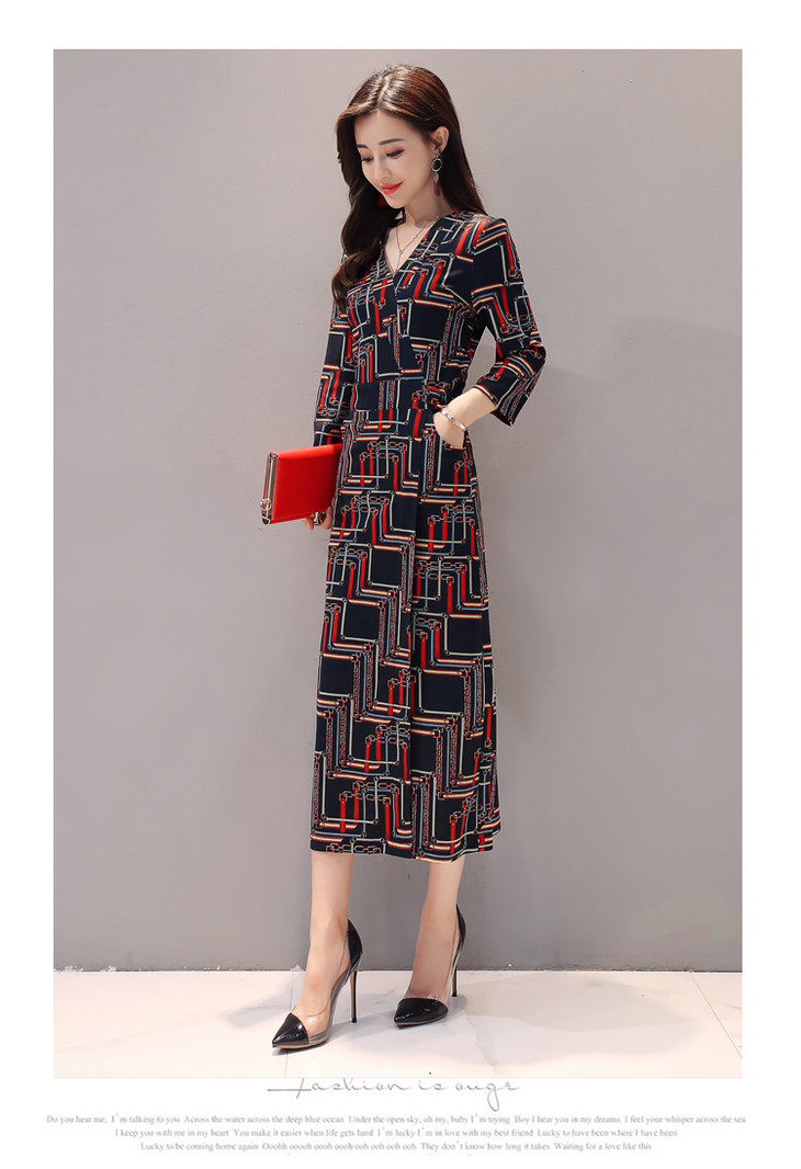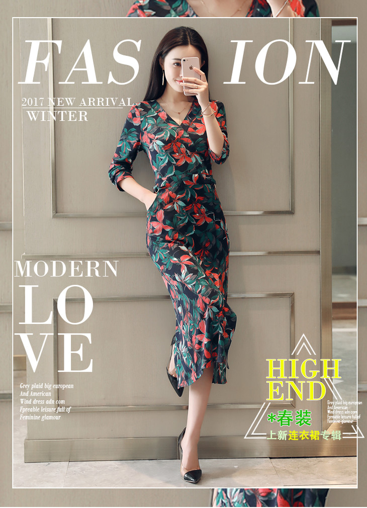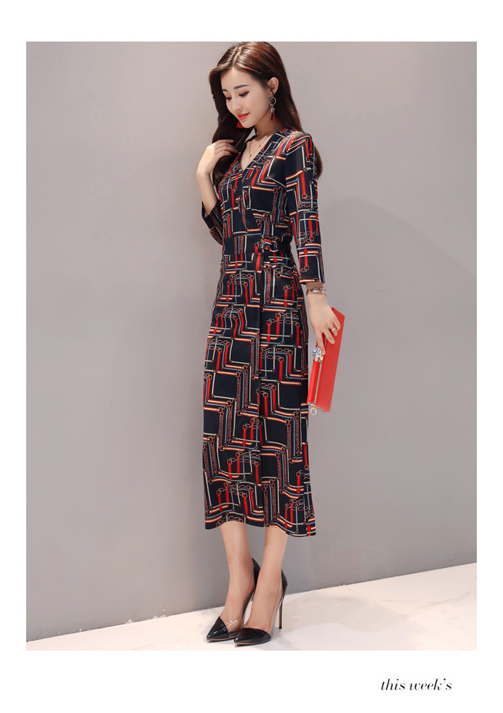 ALXBL1903中长款七分袖拉链2017年春季连衣裙花色V领中腰