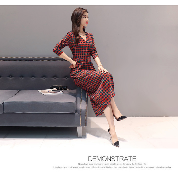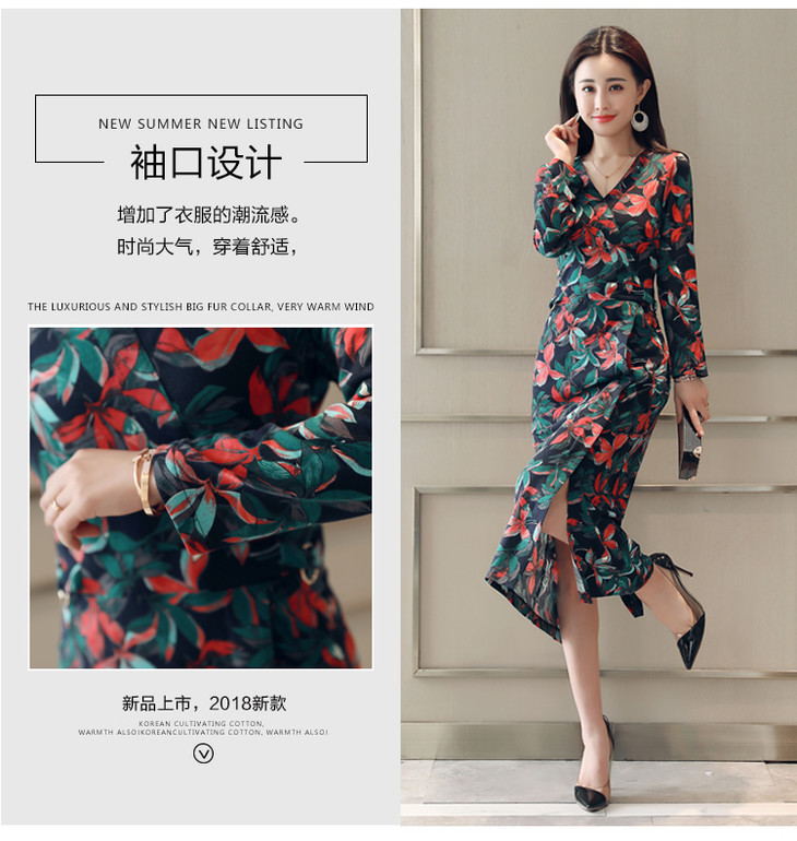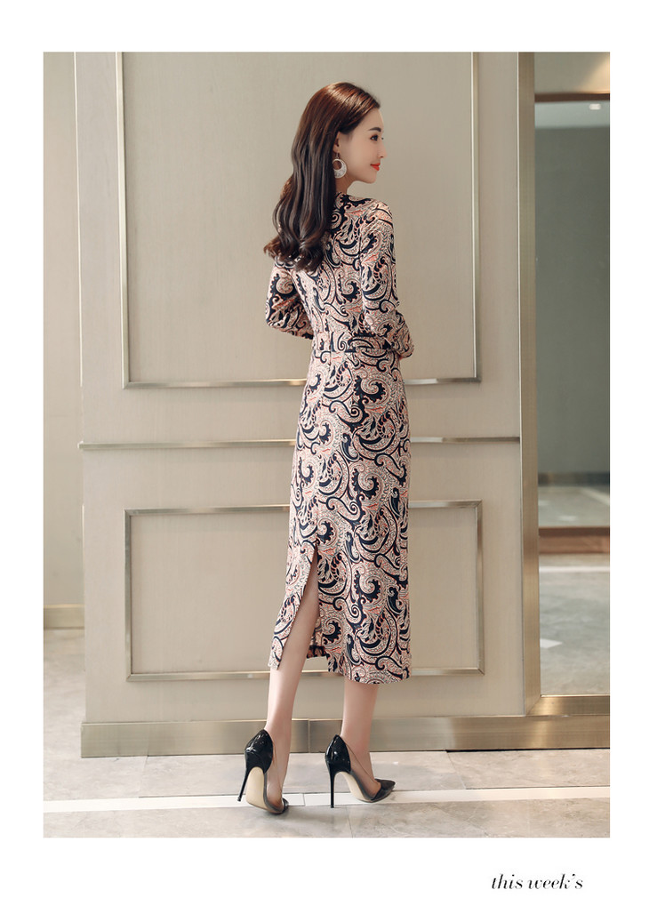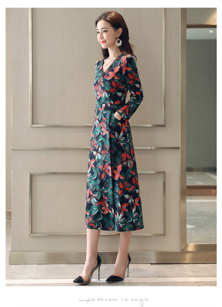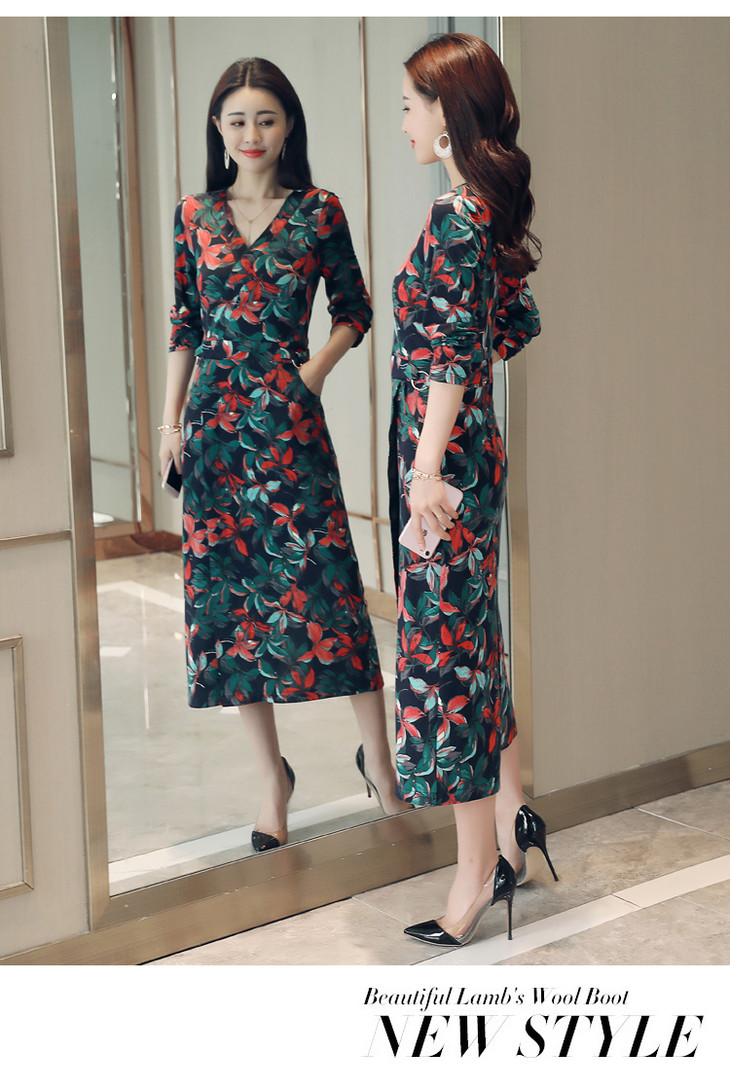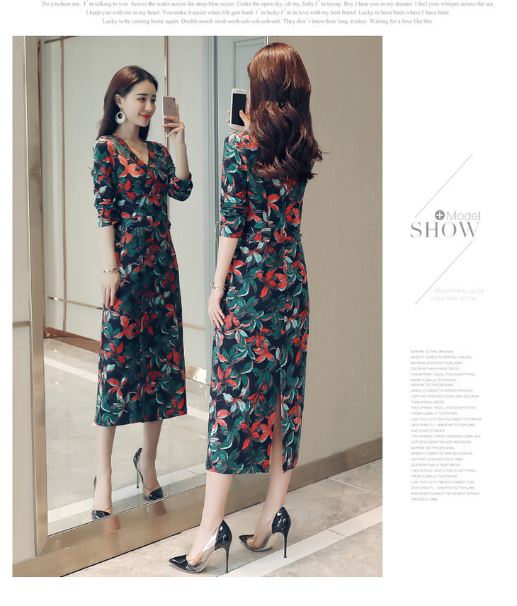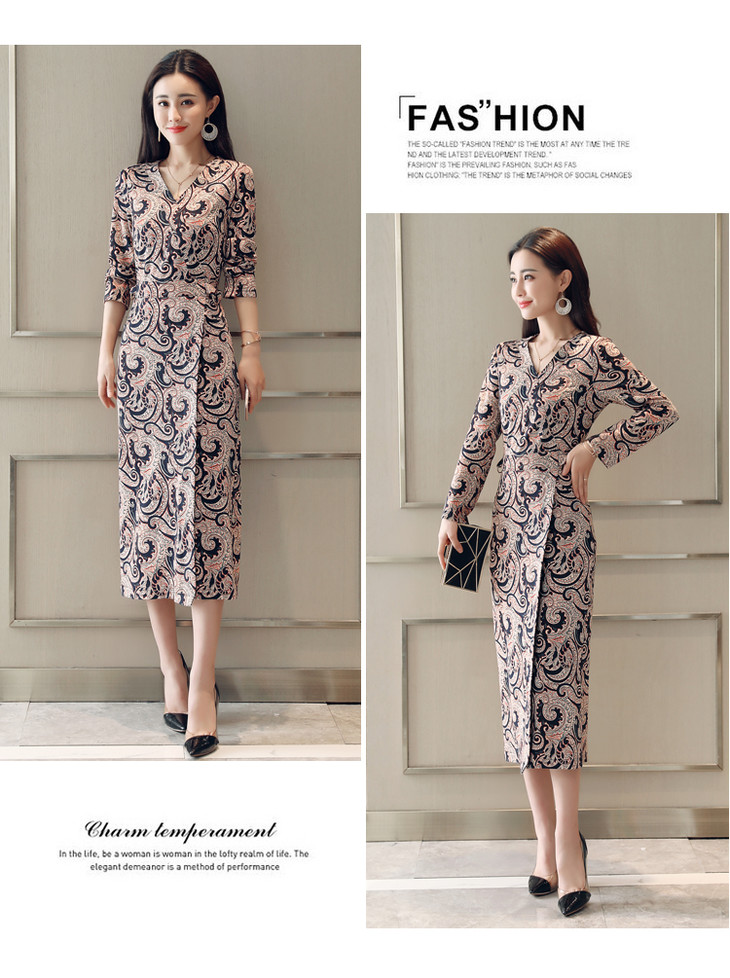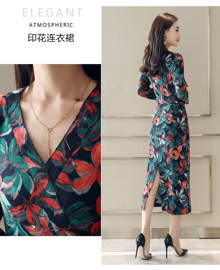 ALXBL1903中长款七分袖拉链2017年春季连衣裙花色V领中腰