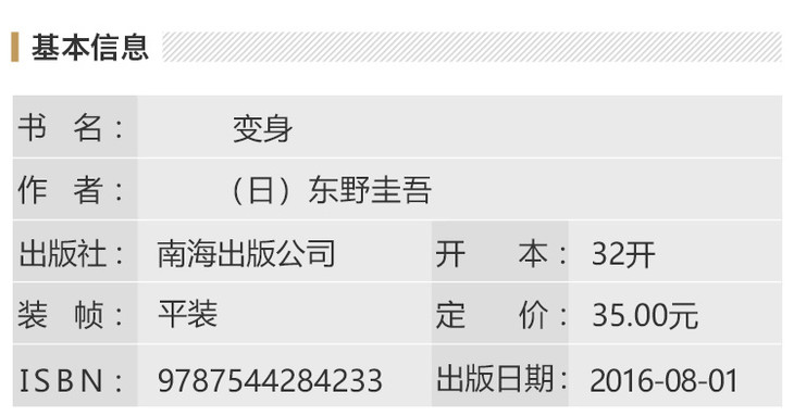 《变身》内容简介:《变身》是日本作家东野圭吾创作的长篇小说。日本版销量突破125册。苍井优、玉木宏主演同名电影原著小说。东野圭吾在谈及《变身》的创作缘起时曾说:“距今约十五年前,我将住家与工作室分开,每天早上搭公交车转电车前去工作室工作。有天在公交车上突然冒出一个灵感,那就是:‘人类有左脑和右脑,要是其中之一和别人交换会怎么样?’当然,灵感不是凭空而来,当时我对人类的脑很有兴趣而看了好几本相关书籍,我想是因为这样,这个疑问才会浮上脑海吧。后来这个疑问化为小说的灵感,到我下公交车时,整个故事已经在脑中完成大半了,前后大概只花了二十分钟左右。对我而言,灵感极少像这样浮现,甚至可说这是*的一次。平常我总是得绞尽脑汁,想得满头大汗。”24岁那年,纯一的生活改变了。为了救一个小女孩,他中弹受伤。痊愈出院后,他变得自信、要强,并展现出从未有过的音乐才华。这简直像是重生一样!但可怕的变化渐渐出现了,愤怒和怨恨在他心中急剧膨胀,面对素不相识的人都会萌生强烈的杀意。他决心查清真相,却发现有人正暗中监视着他。