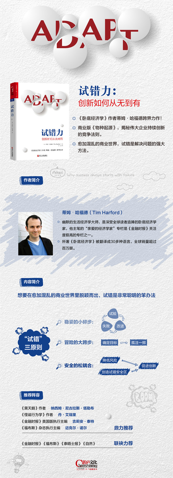 意味深长地陈述复杂观点的同时又字字珠玑,读来酣畅淋漓,这就是哈福德的写作风格。从很多角度看,他都堪称彼得·圣吉逻辑的继承人。哈福德是一位才华横溢的作家,他极富创新思想,他的《试错力》一书更应获得当之无愧的关注。