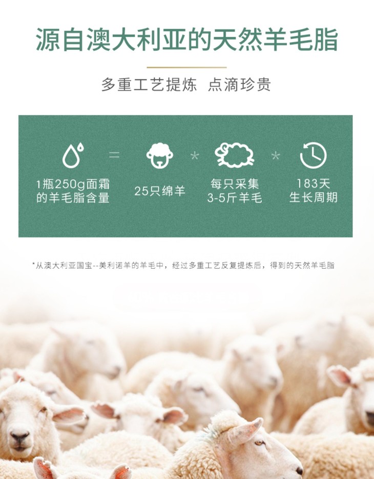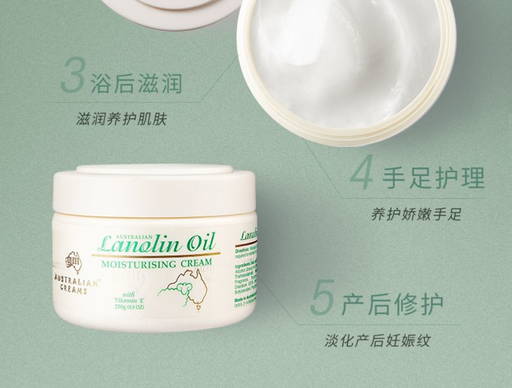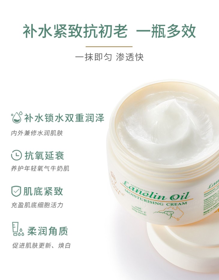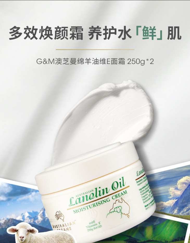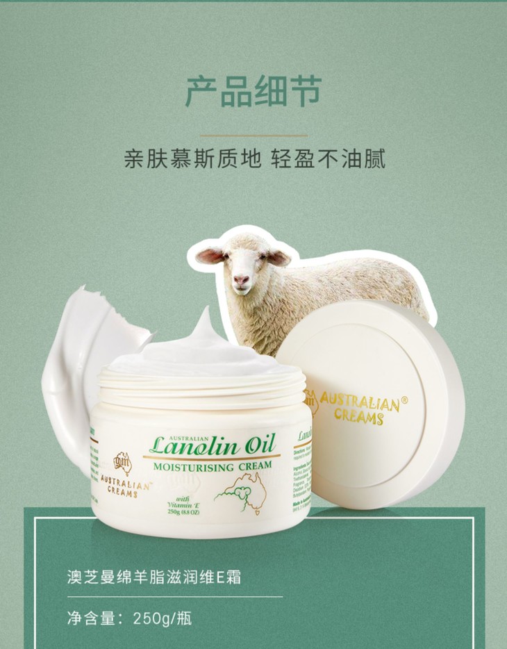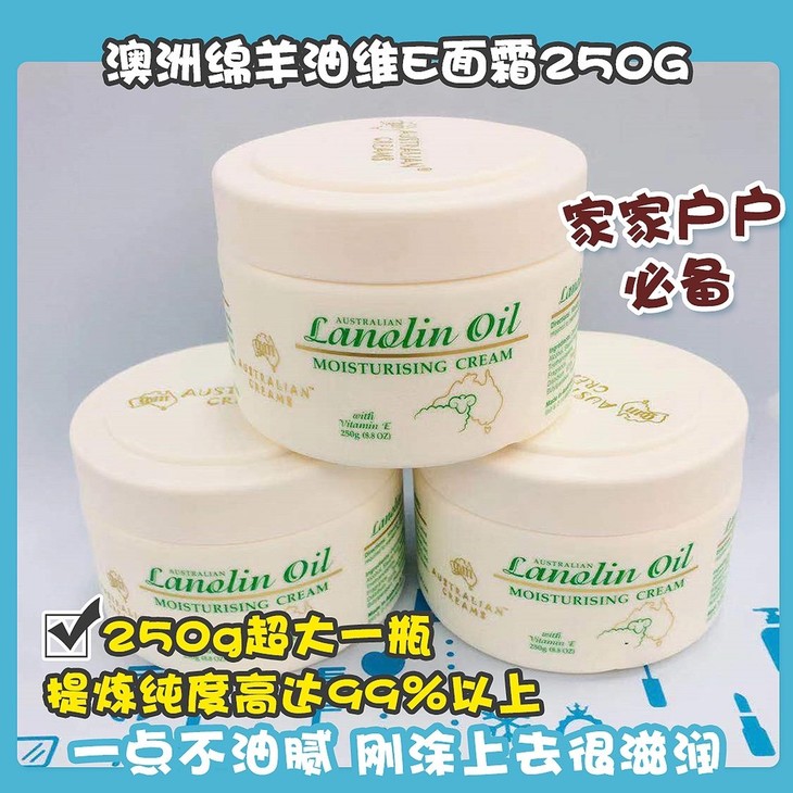 澳洲绵羊油维E面霜250G👍澳洲销量第一绵羊油🔥,补水保湿推荐💦,家家户户必备❗❗250g超大一瓶!!! 一年四季,怎么擦都不心疼😍!区别一般的绵羊油,提炼纯度高达99%以上👀,还加了维E,质地柔软!全身都可以用,用来当面霜💆,也可以用身体乳哦。因为性价比真的很高,🙅一点不油腻,刚涂上去很滋润😇,稍微一会儿就能完全吸收啦🌬~纯天然很安全的东西✅,老人、孕妇和小宝宝都可以用的呀!👶