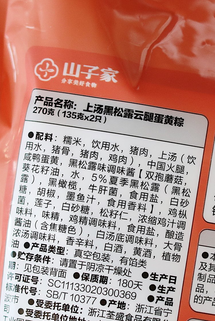 【配料】上汤黑松露云腿蛋黄粽:糯米、饮用水,猪肉,上汤(饮用水,猪骨、猪肉、鸡肉),中国火腿,咸鸭蛋黄,黑松露味调味酱【双孢蘑菇,葵花籽油,水,5%夏季黑松露,黑橄榄,牛肝菌,食用盐,白砂糖,胡椒,墨鱼汁,食用香料】鸡枞菌,莲子,白砂糖,松子仁,浓缩鸡汁调味料,味精,鸡精调味料,食用盐,酿造酱油,白汤底调味料,大骨浓汤调味料,香辛料,白酒,黄酒,植物油。