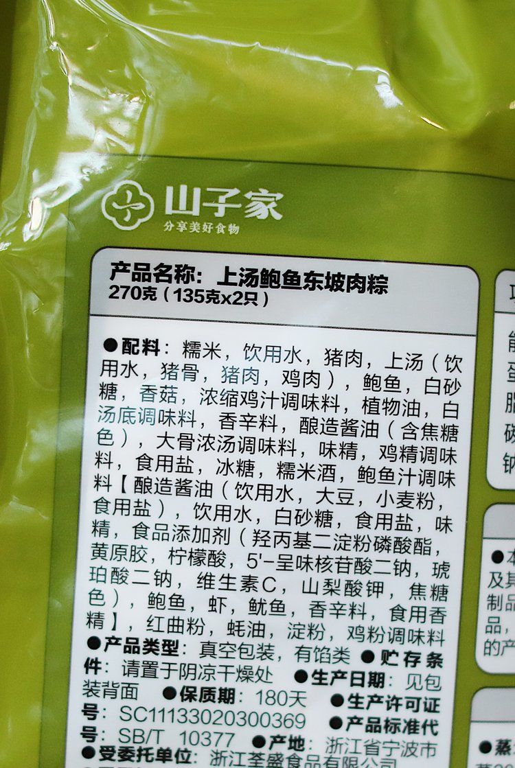 上汤鲍鱼东坡肉粽:糯米、饮用水、猪肉,上汤(饮用水,猪骨,猪肉,鸡肉),鲍鱼,白砂糖,香菇,浓缩鸡汁调味料,植物油,白汤底调味料,香辛料,酿造酱油,大骨浓汤调味料,味精,鸡精调味料,食用盐,冰糖,糯米酒,鲍鱼汁调味料,红曲粉,耗油,淀粉,鸡粉调味料