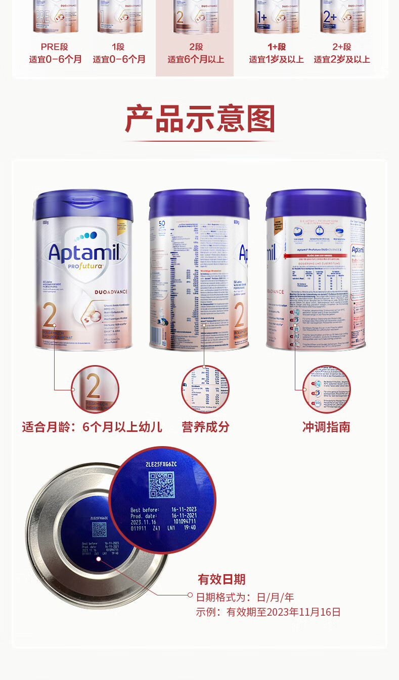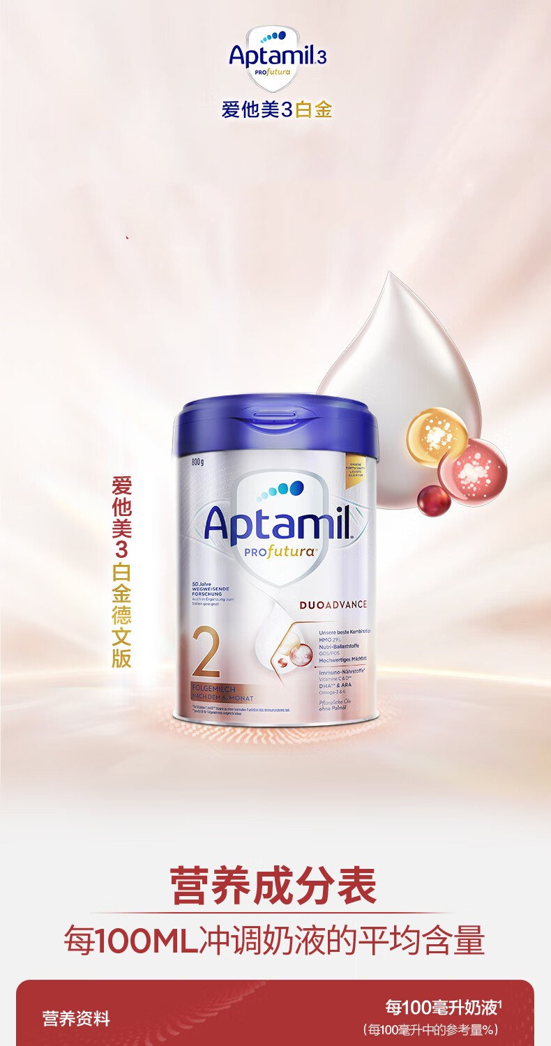 【不含税跨境】德国Aptamil爱他美白金版较大婴儿配方奶粉 2段 6-12月 800g【超过6罐请分开下单】