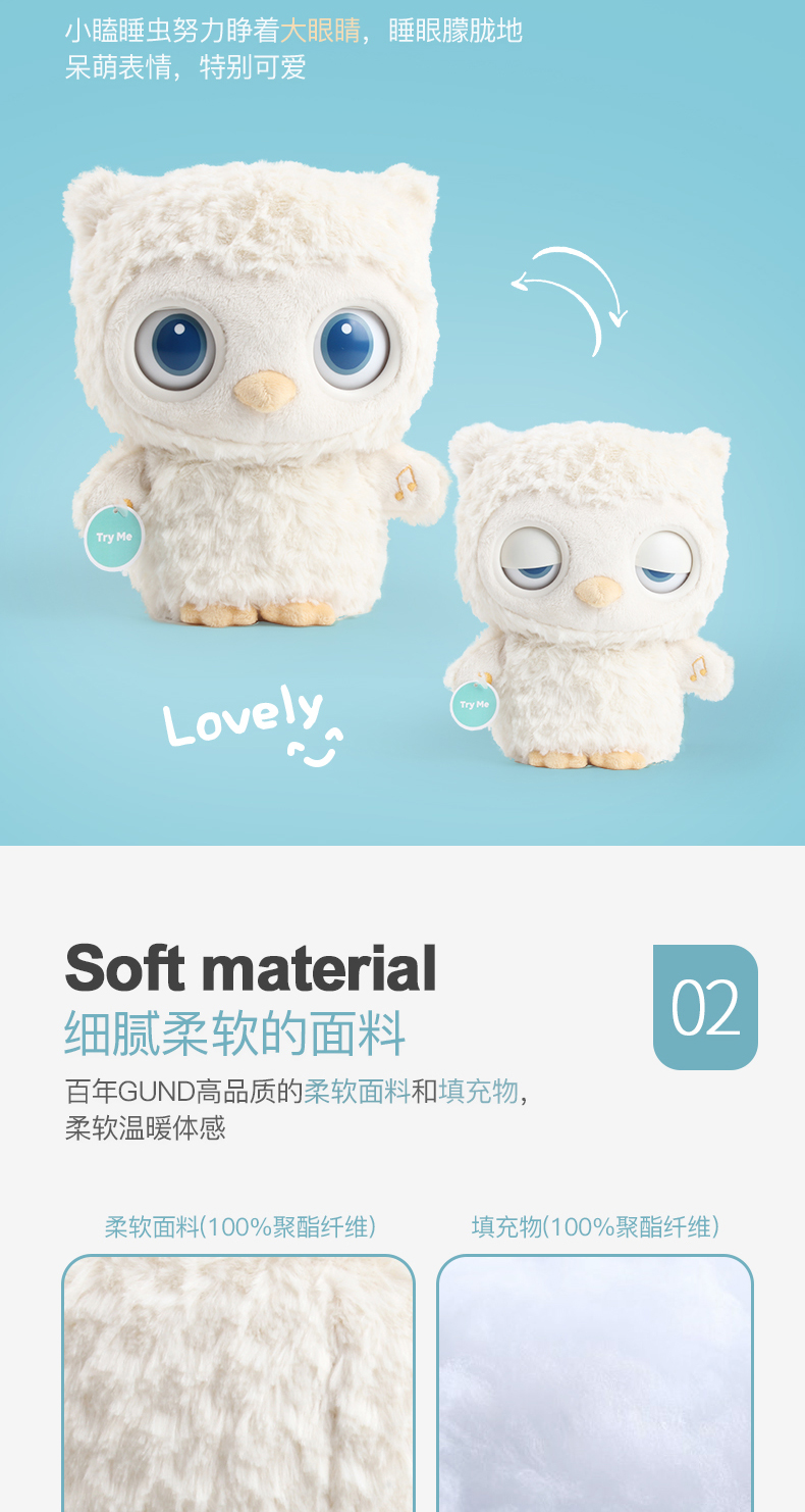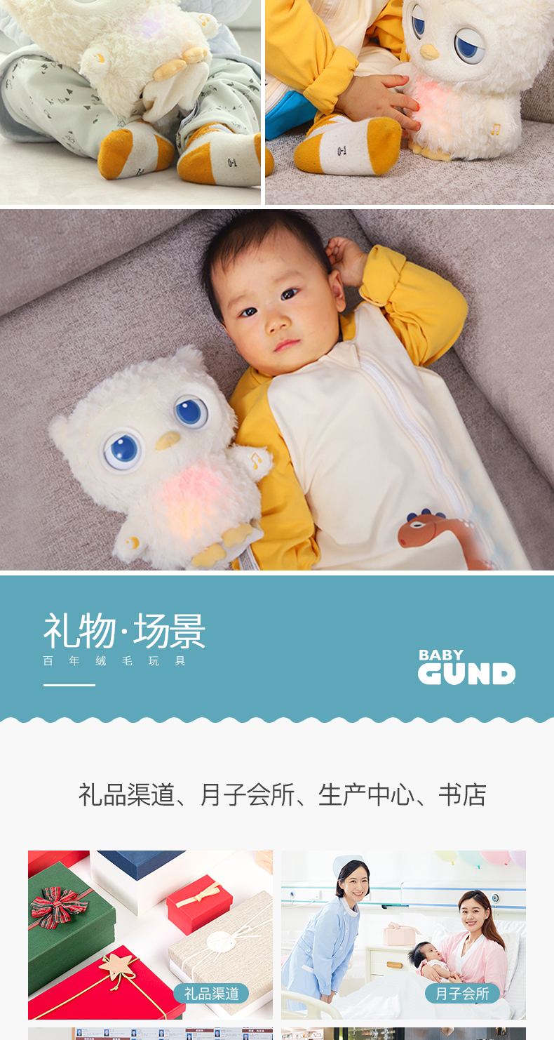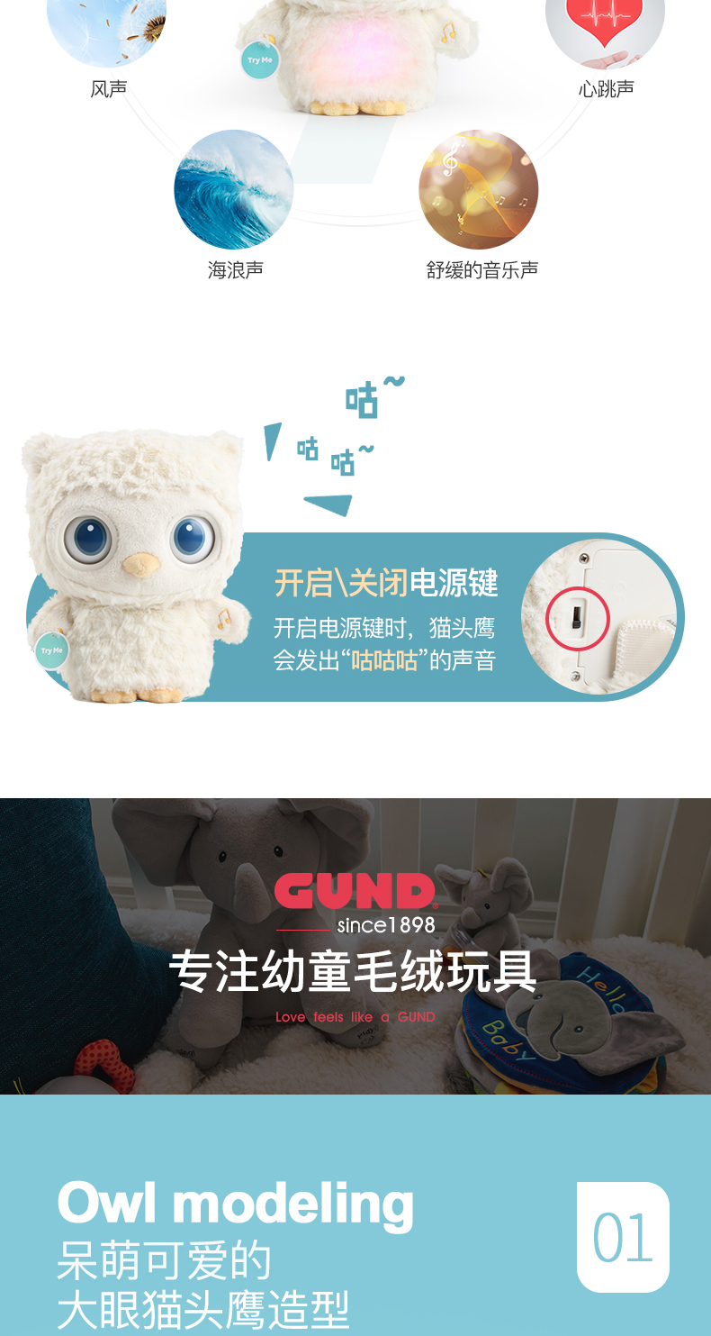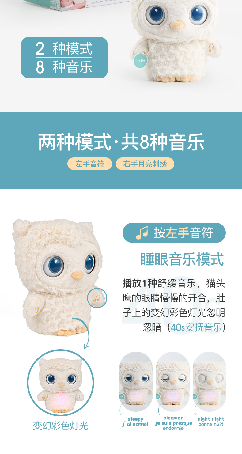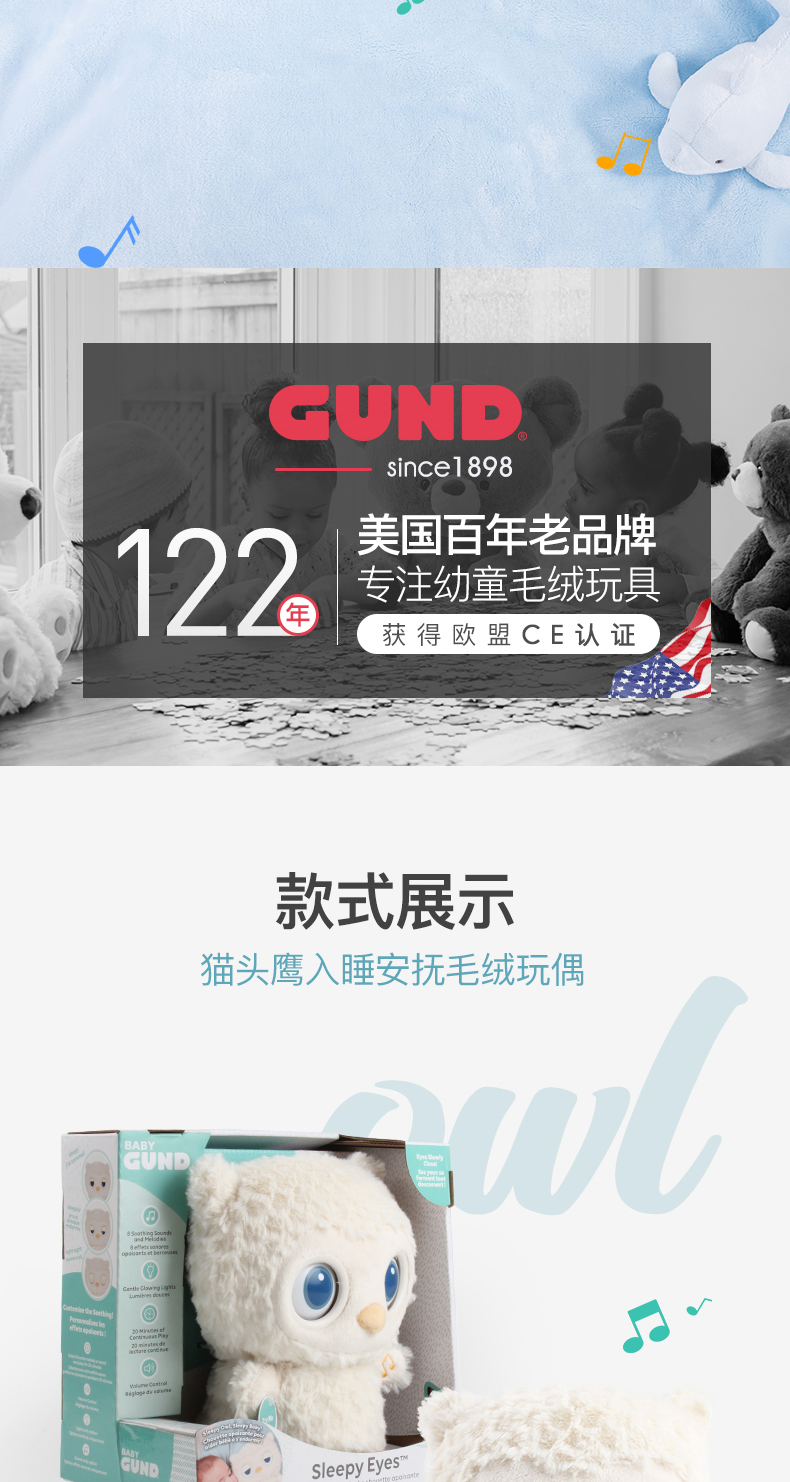 美国Baby Gund猫头鹰婴儿睡眠安抚毛绒玩偶 宝宝白噪音哄睡玩具