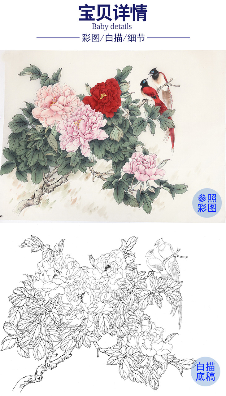 陈军工笔花鸟白描底稿-牡丹-斗方小品册页-多种白描尺寸可选 CJ55