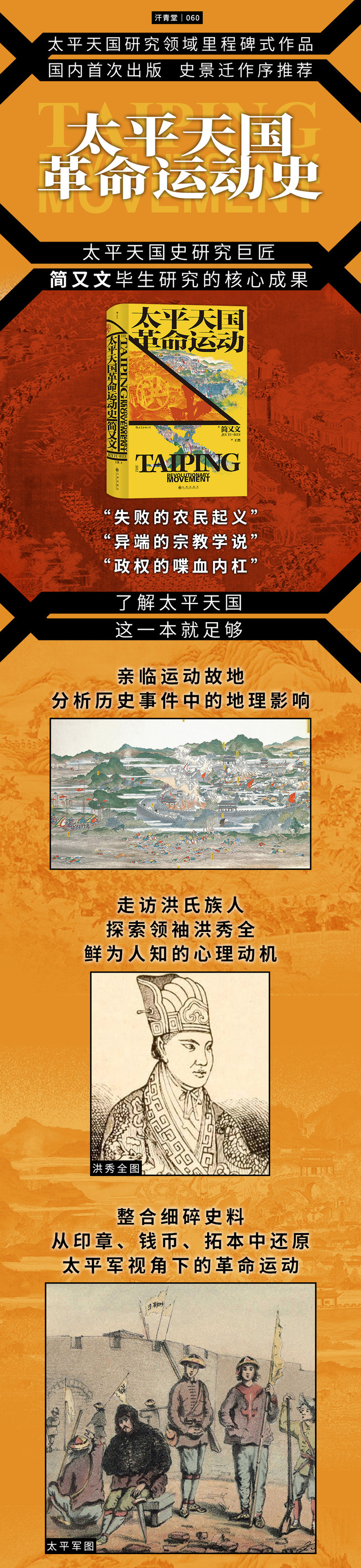 本书囊括了整个太平天国运动。作者从太平军的角度重现这场运动,通过实地寻访考察,他收集了手稿、宣传单、印章、拓本、钱币等太平军的文物,结合史籍文献和外文资料,揭示了太平天国运动兴起之初的现实基础,从日常军事行动和长期战略目标两方面来考察太平军的军事行动,分析了太平军的主要战略错误,以及后期洪仁玕的贡献。