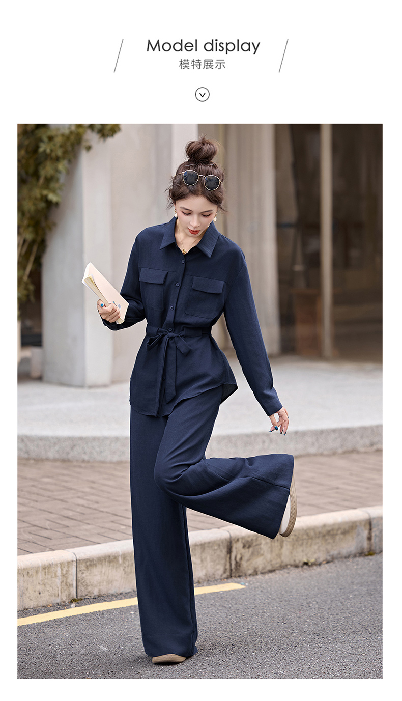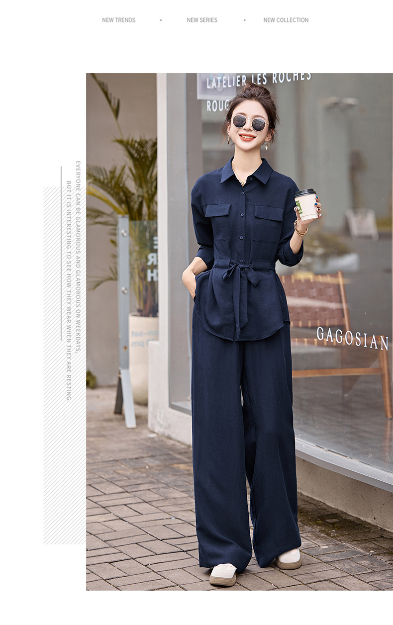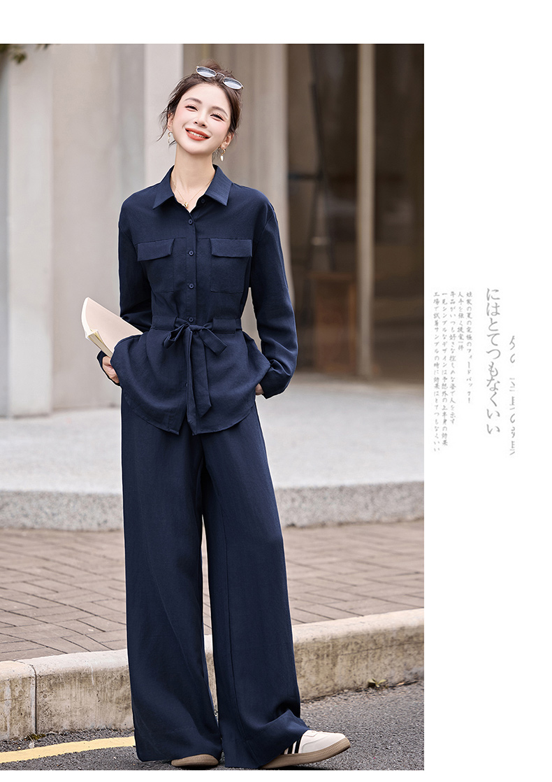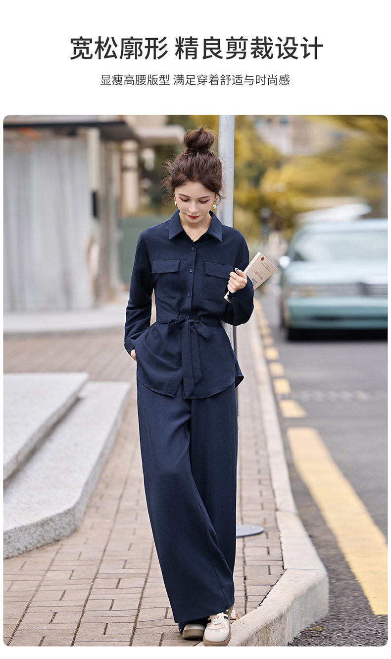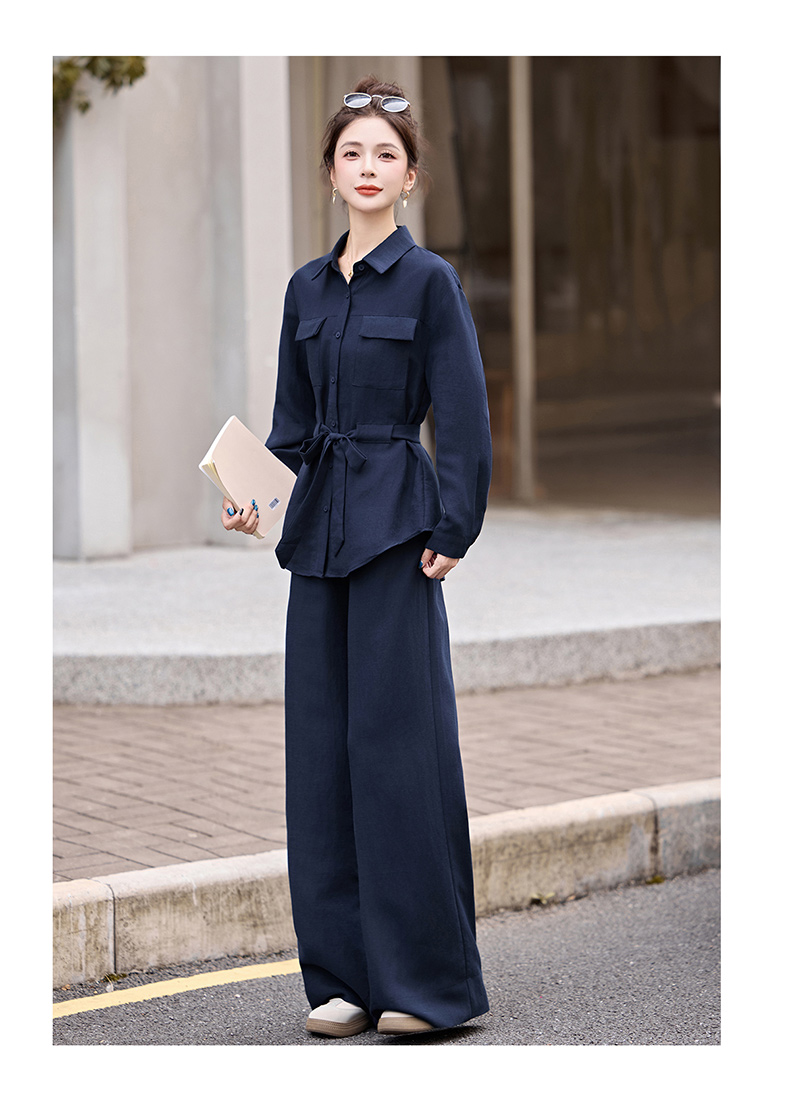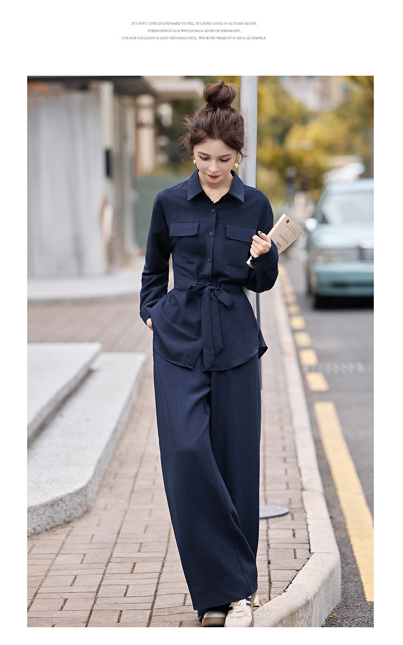 时尚藏青色两件套裤2025秋季新款polo领长袖系带衬衫阔腿裤套装LNS9765