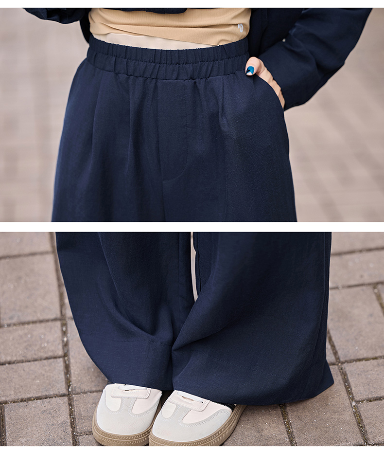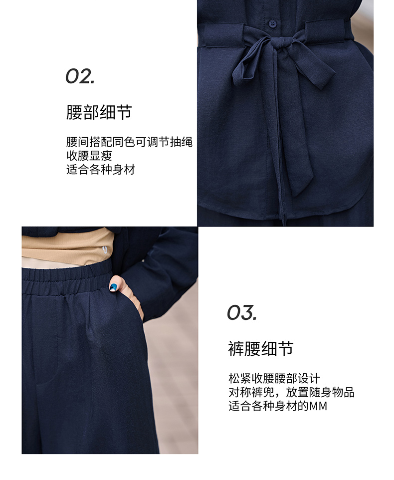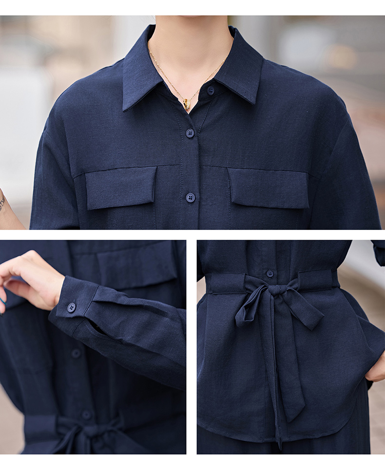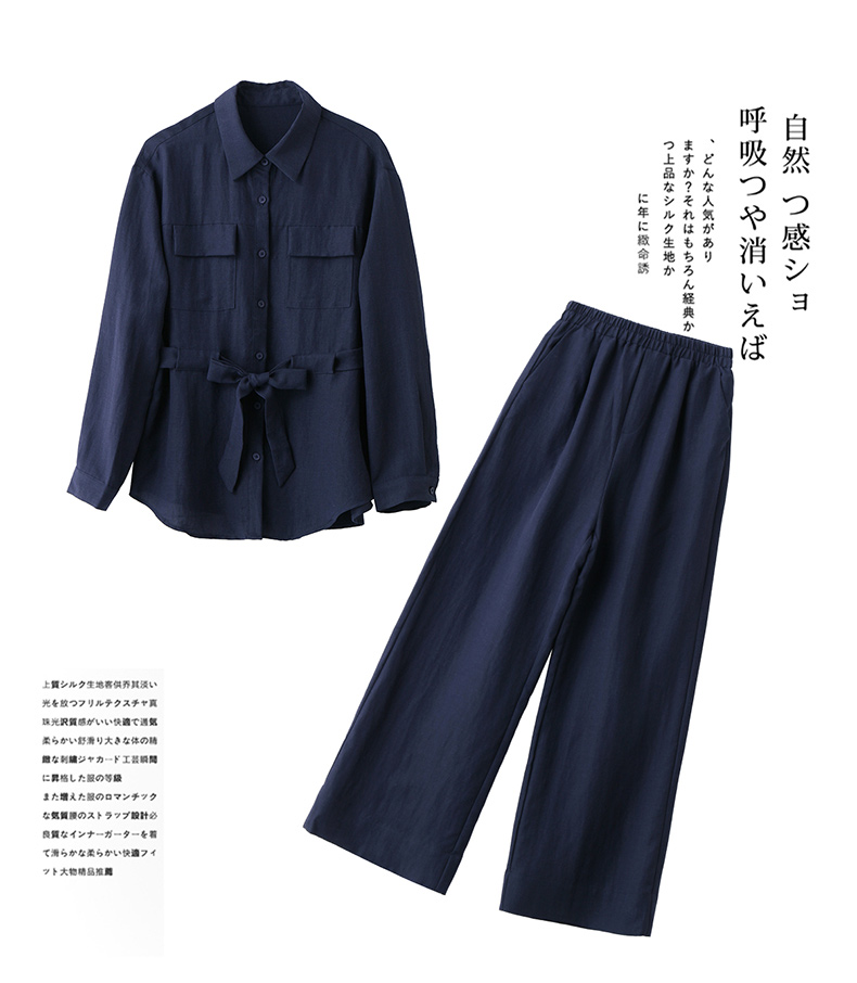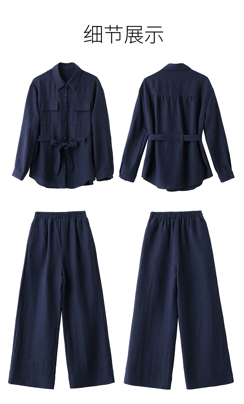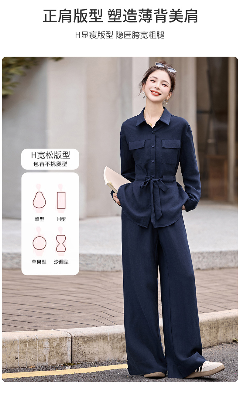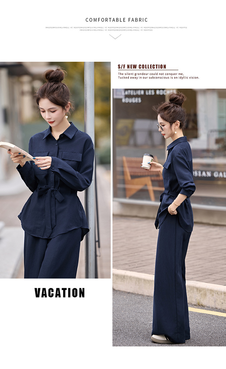 时尚藏青色两件套裤2025秋季新款polo领长袖系带衬衫阔腿裤套装LNS9765