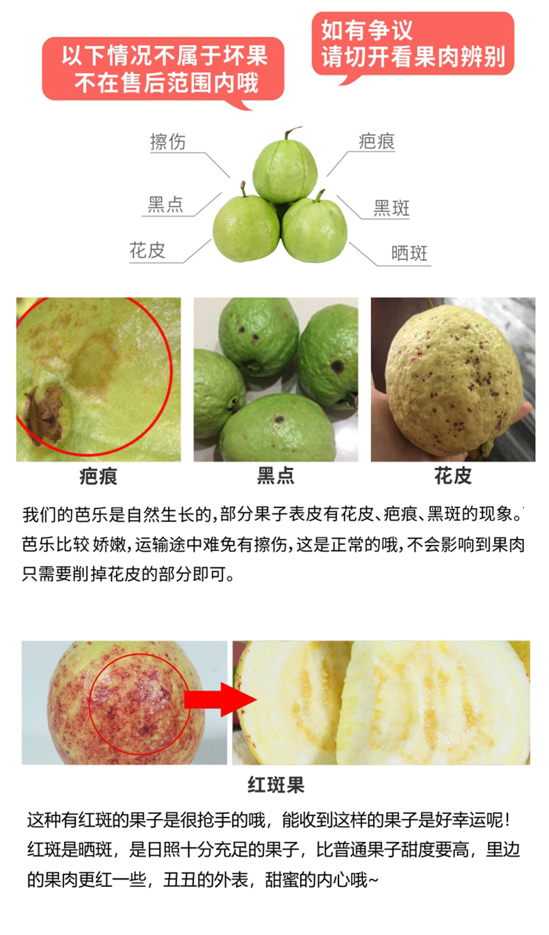 ①芭乐属于自然生长,受环境影响,部分果子表面带有斑点、果疤,个头大小现象属于正常现象,不在售后范围内。