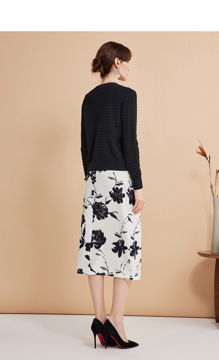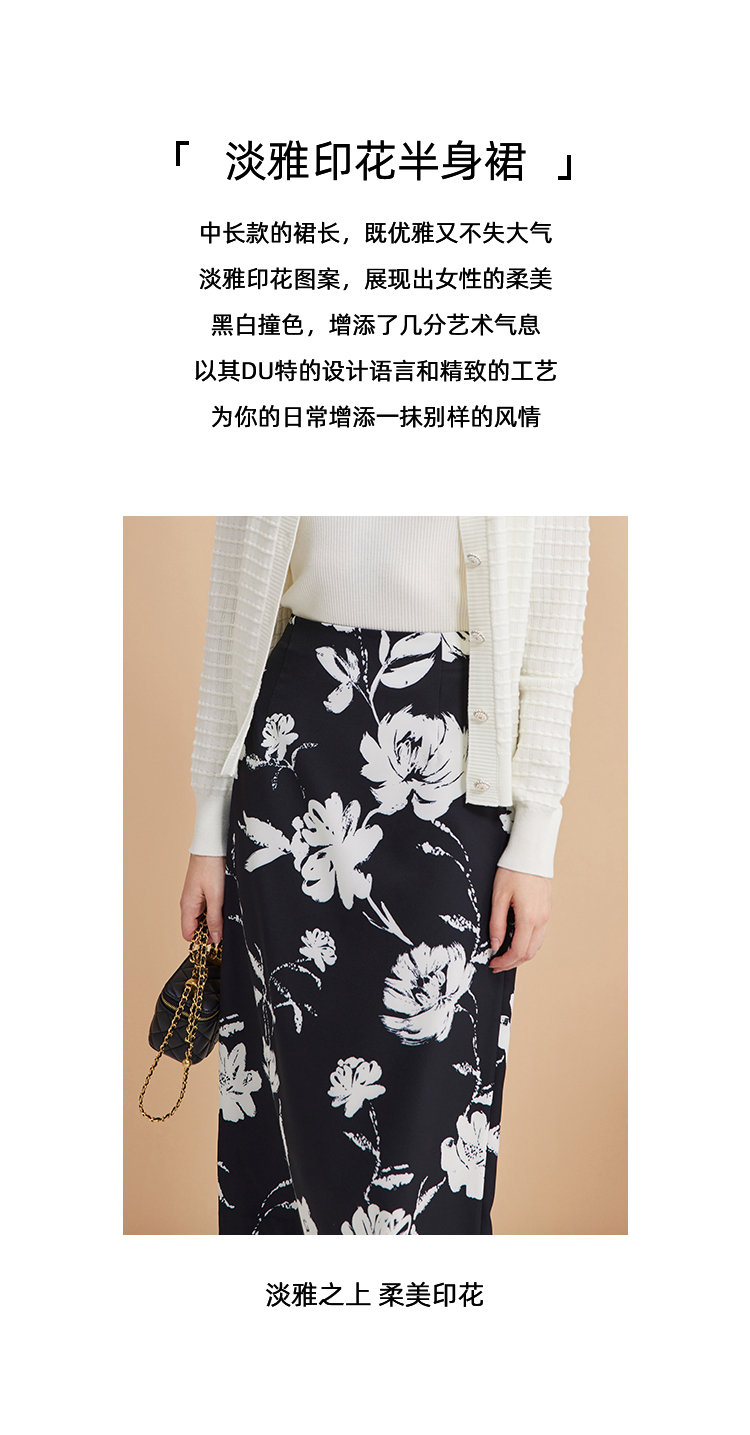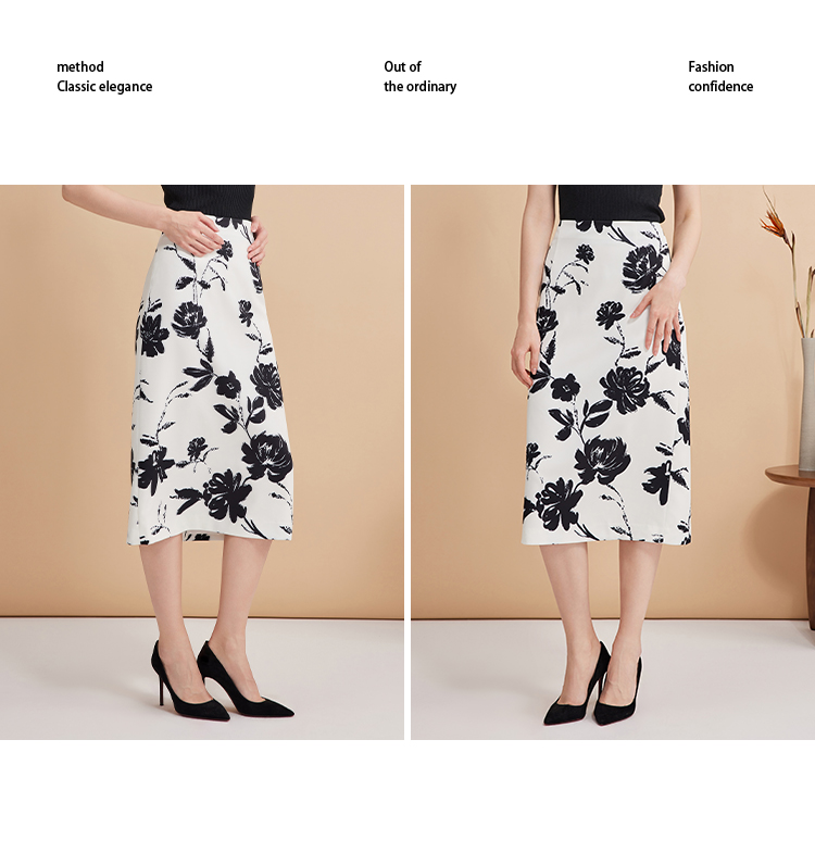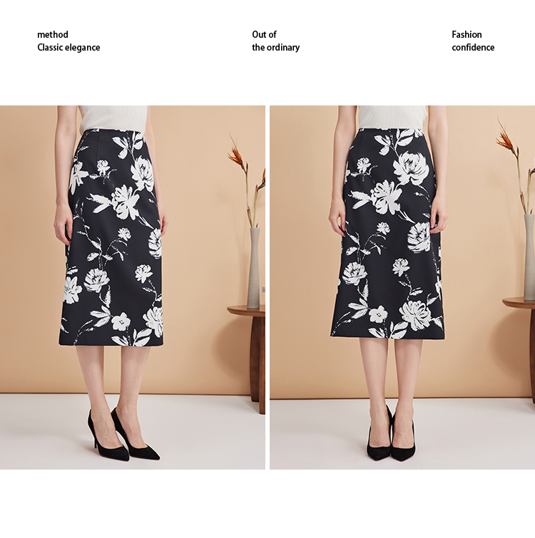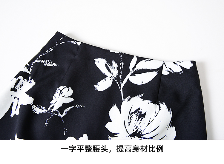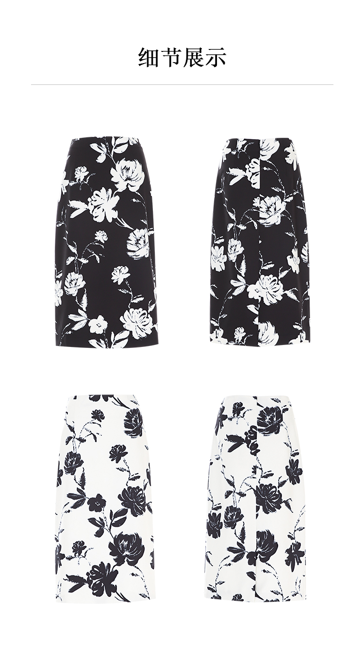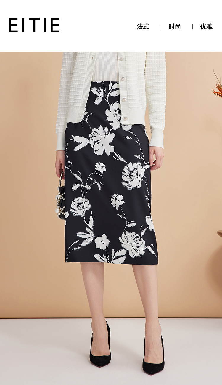EITIE爱特爱浪漫通勤花卉印花黑白撞色高腰半身裙秋季新款C2406420