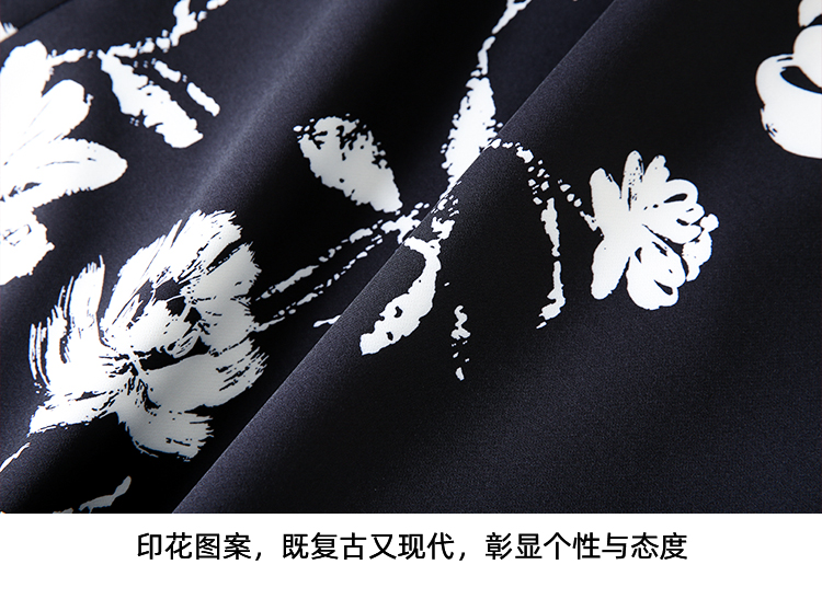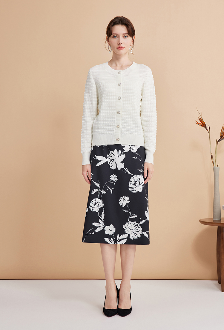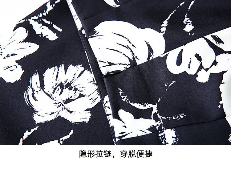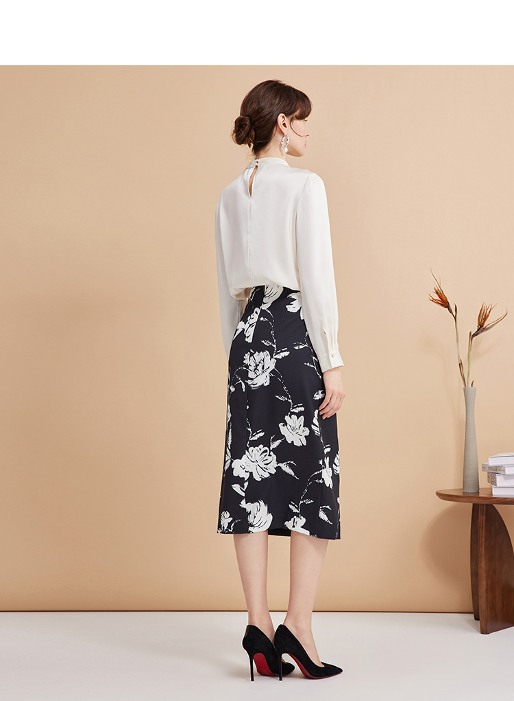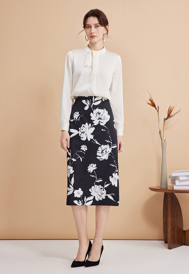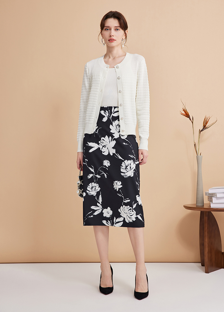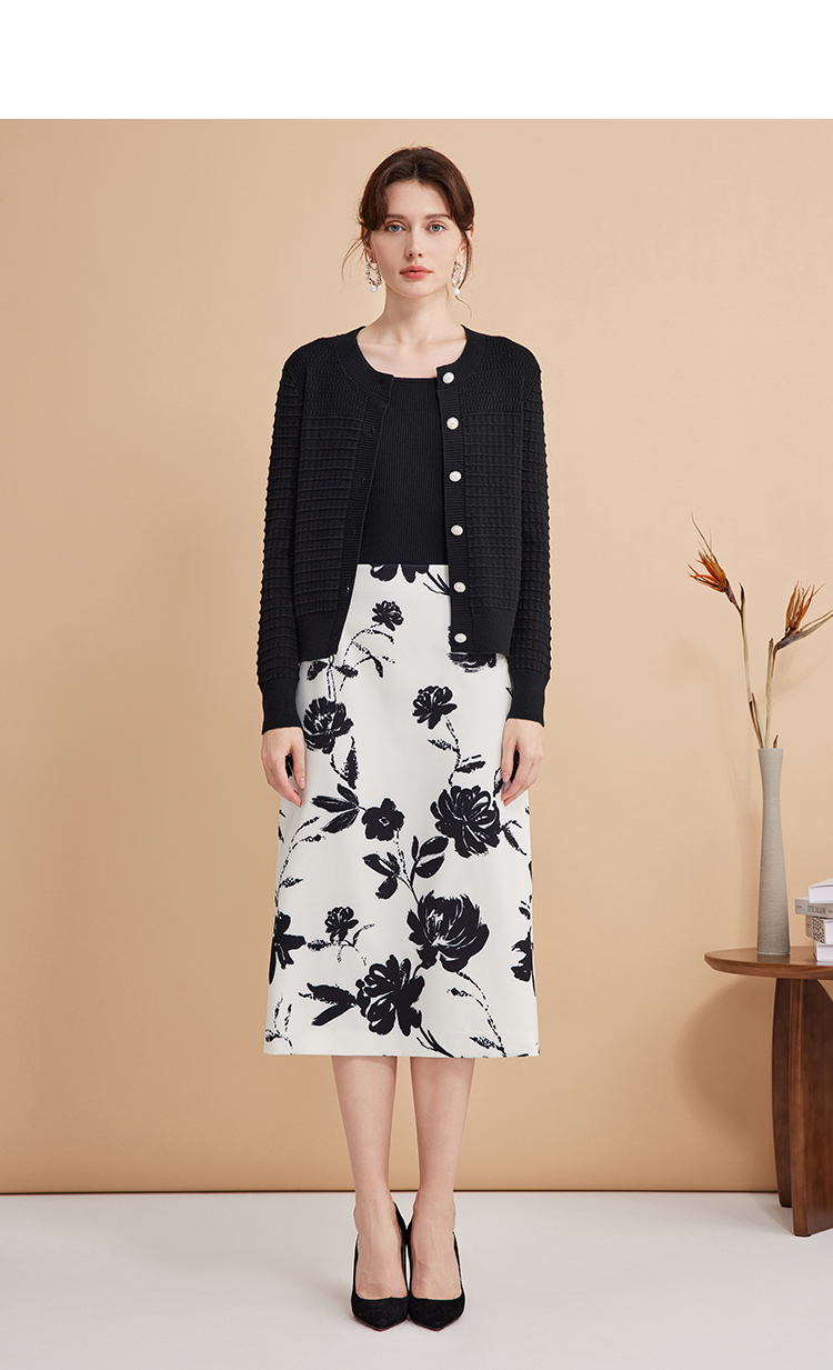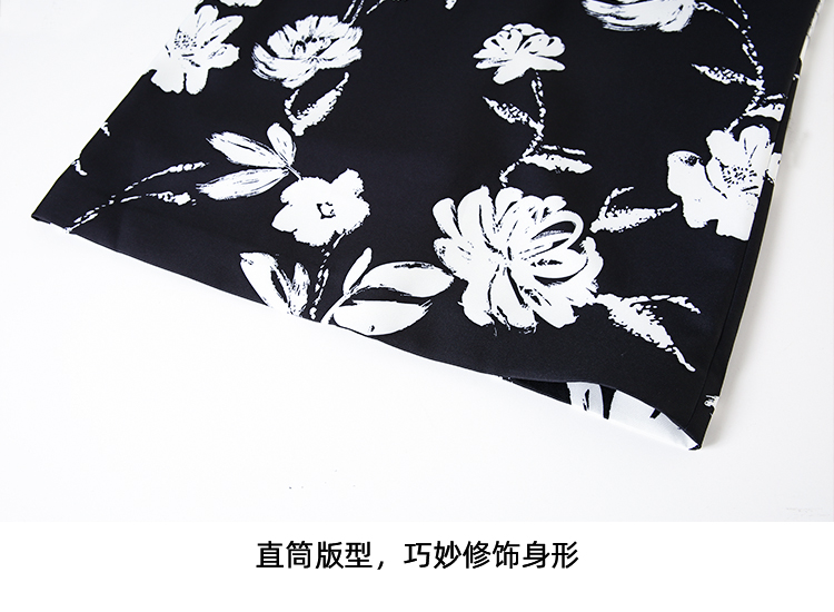 EITIE爱特爱浪漫通勤花卉印花黑白撞色高腰半身裙秋季新款C2406420