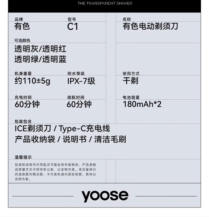 有色(yoose)电动剃须刀 潮流便携 男士刮胡刀 透明机身 生日情人节礼物送男友 胡须刀礼盒