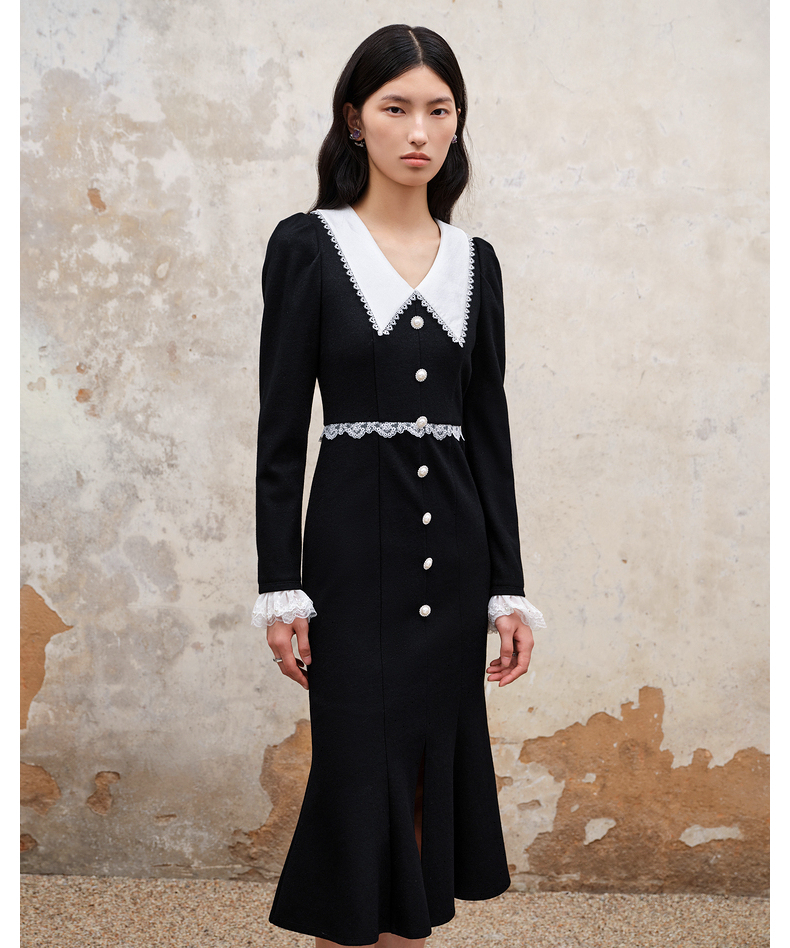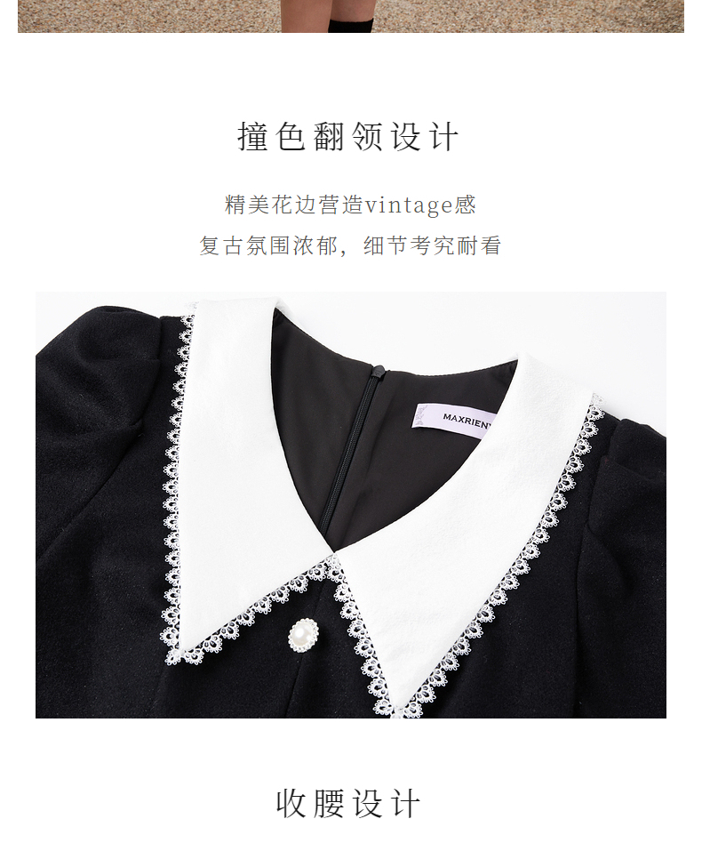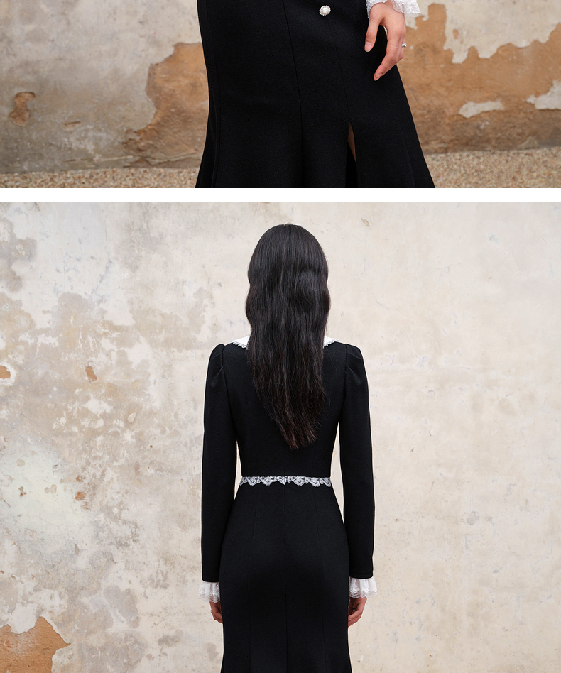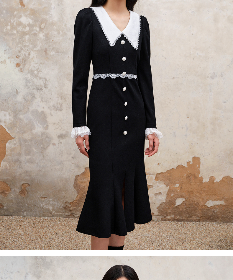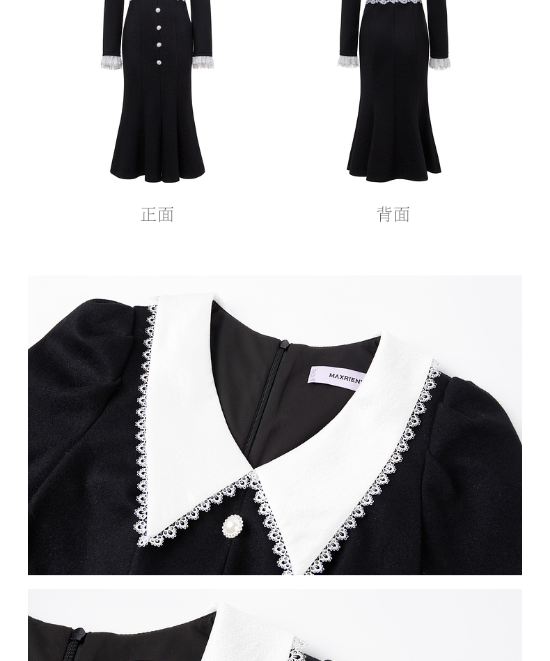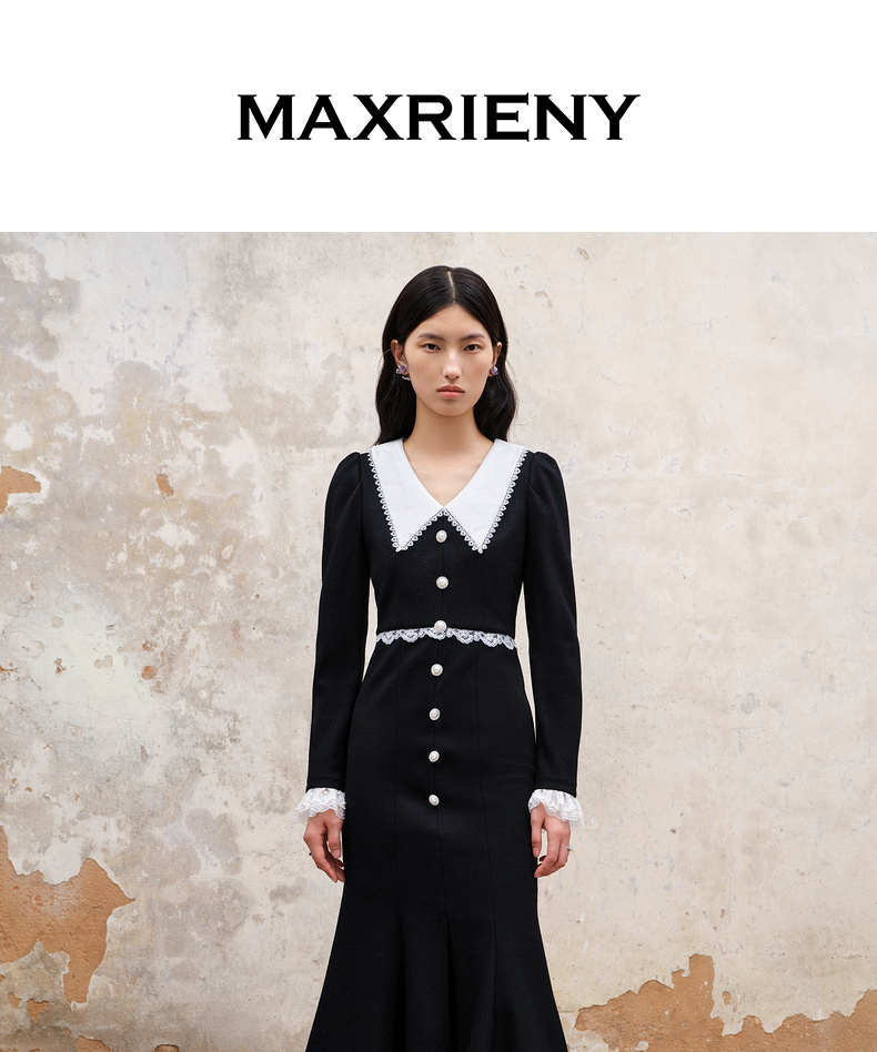 MAXRIENY法式浪漫复古翻领鱼尾连衣裙2023秋冬新款小黑裙修身裙子(货号:MS88DR511)